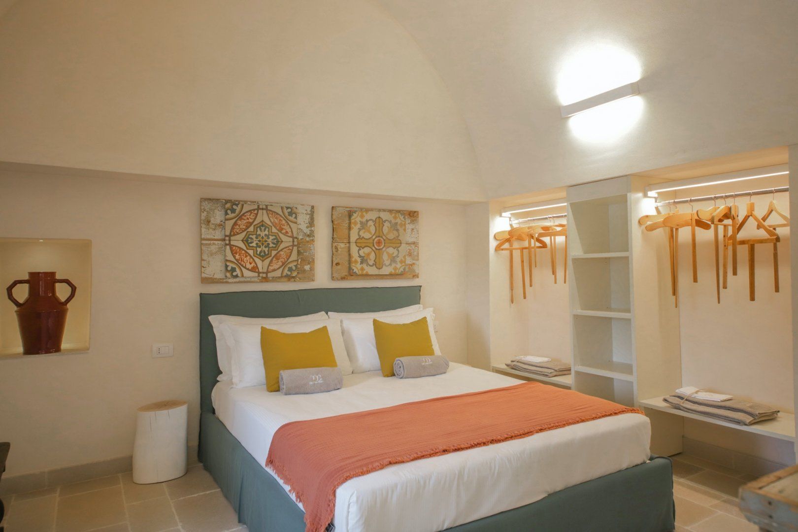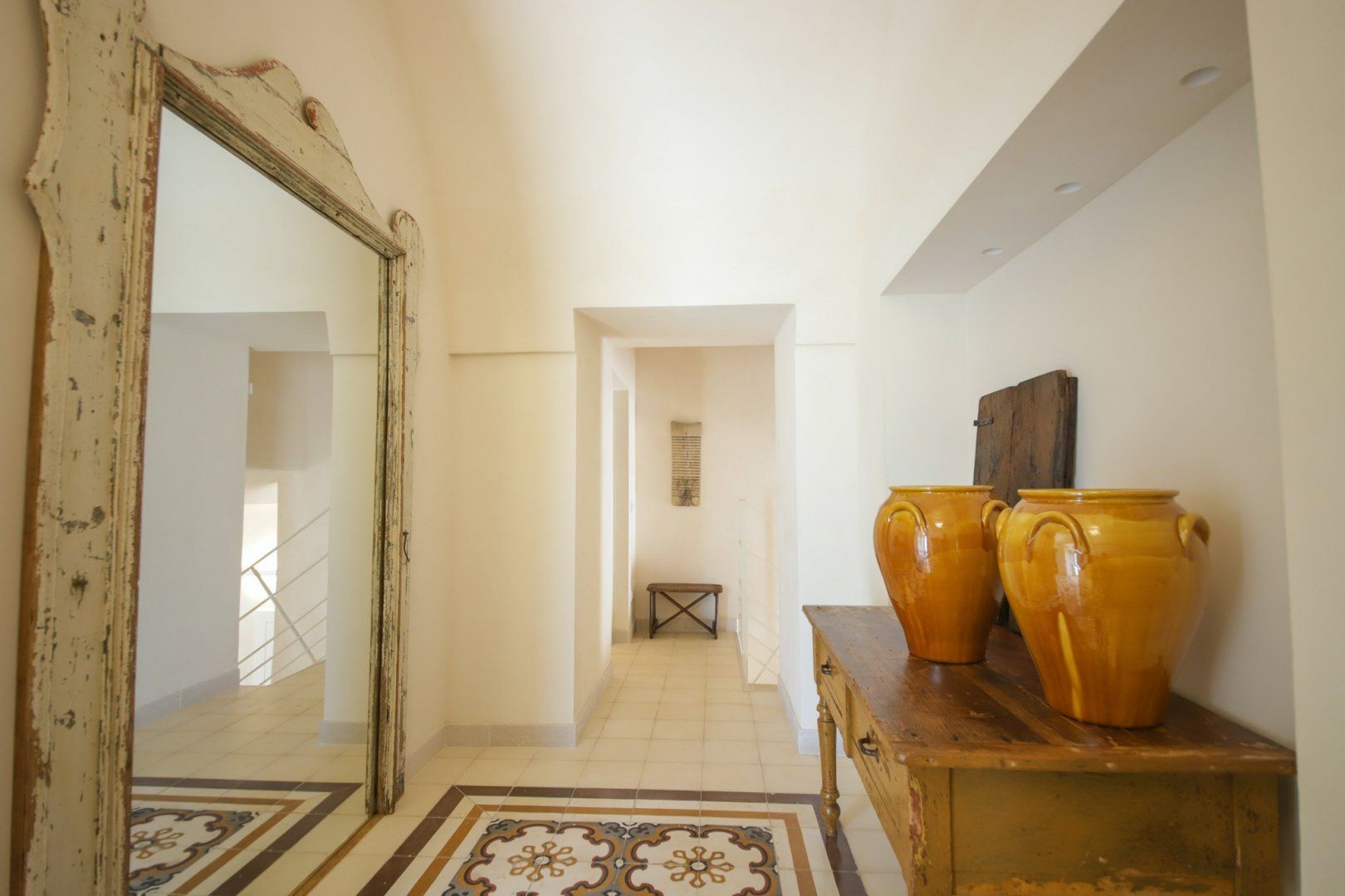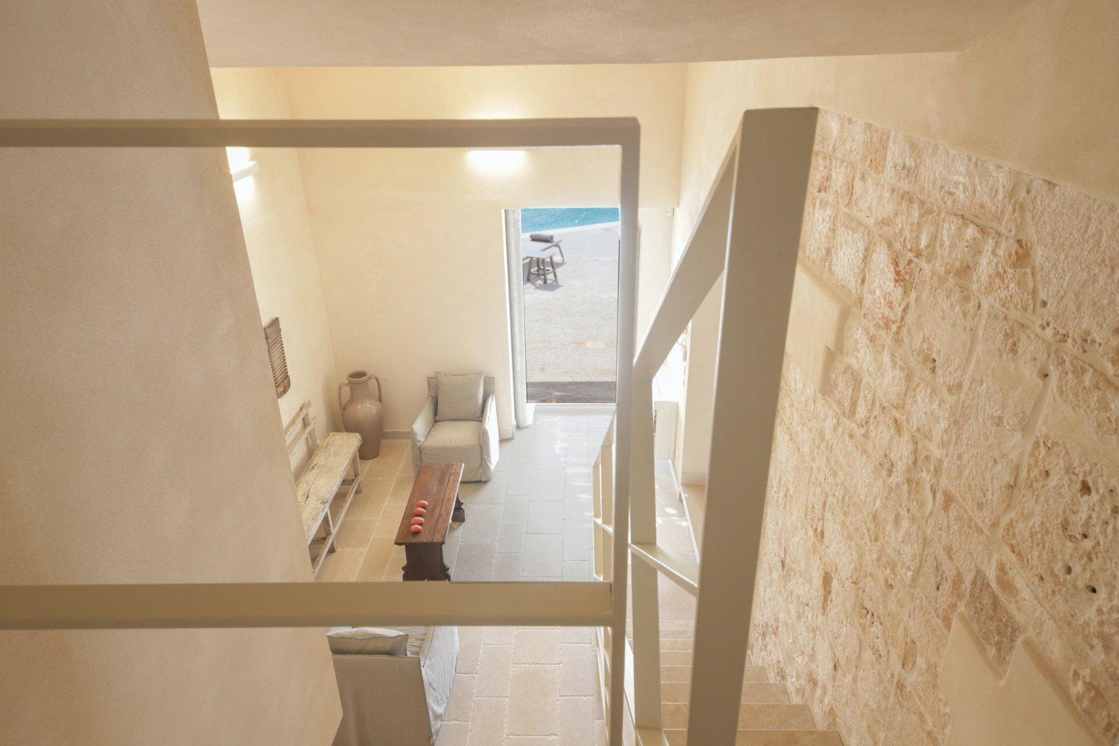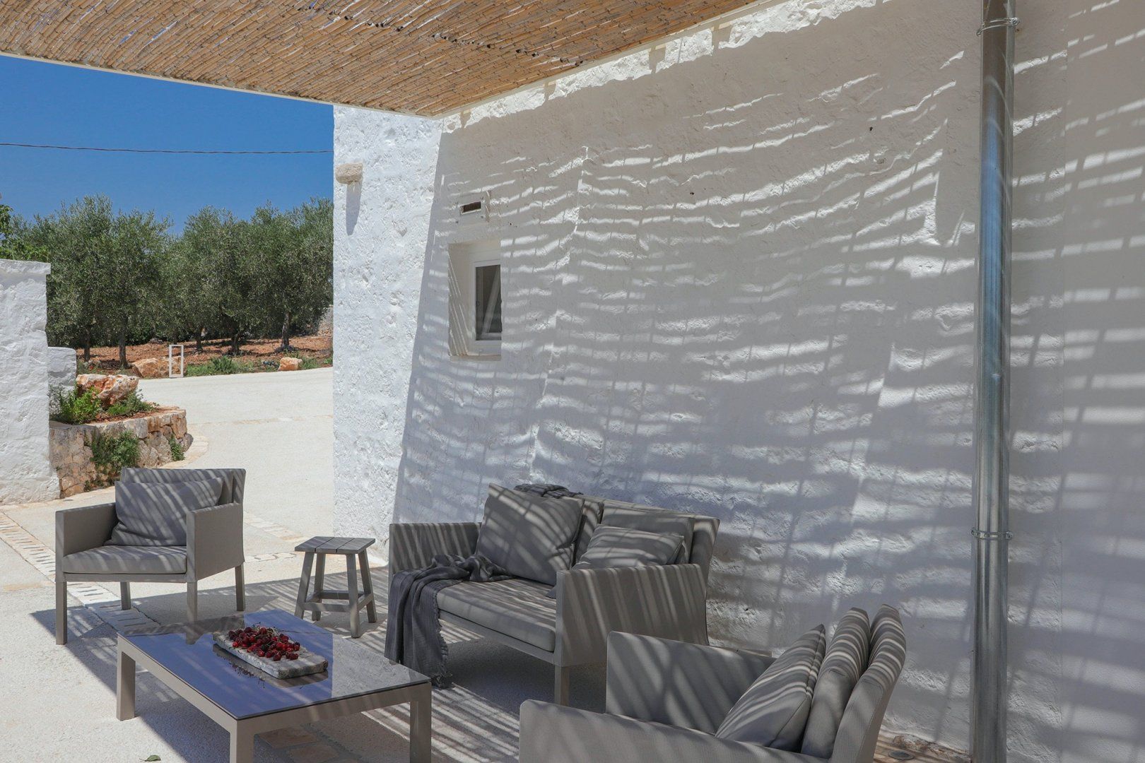 Surrounded by stunning Apulian countryside, yet just twenty minutes by car from the centre of Monopoli – this quintessential Mediterranean villa offers guests a private slice of serenity from the moment they open the front gate. Upon entering the home, you'll be welcomed by the soothing earthy tones of the home's original features, including tiled stone floors throughout and whitewashed exposed brickwork in the living area. Antique dark wooden furniture and terracotta ornaments complement the character and complete the home's Mediterranean aesthetic with infinite elegance. Leading out to the garden, French doors pave the way to a small terrace featuring day beds by the pool and a shaded chill-out area, which serves as the perfect spot for your morning coffee. Another large pergola offers a second living area, bringing the indoors outside – with a plush corner sofa, outdoor kitchen and dining table that remain shaded from the sun. This luscious corner of the home is a hidden gem that allows guests to relax as they would inside without compromising on losing garden views overlooking the countryside with olive and fruit trees growing all around.