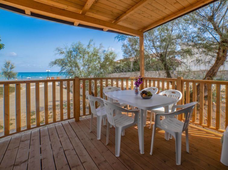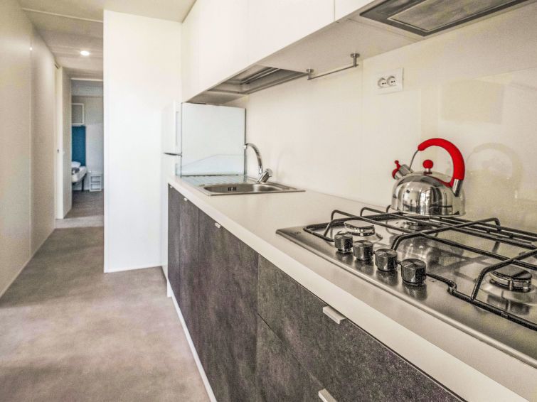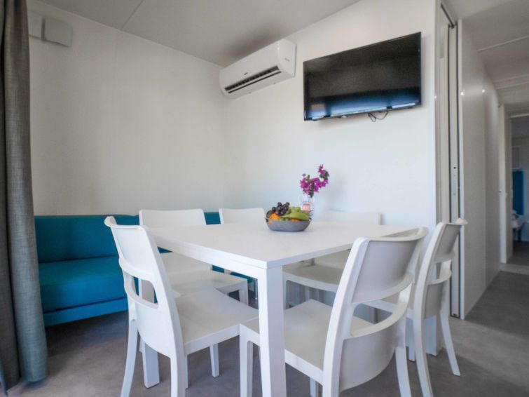 "Baia Revolution", 4-room mobile home 34 m2. Modern furnishings: living/dining room with dining table and satellite TV. 1 room with 1 french bed (140 cm), shower/WC. 2 rooms, each room with 1 x 2 bunk beds (70 cm). Kitchenette (4 gas rings, freezer). Shower/WC. Air-conditioning, forced-air heating.