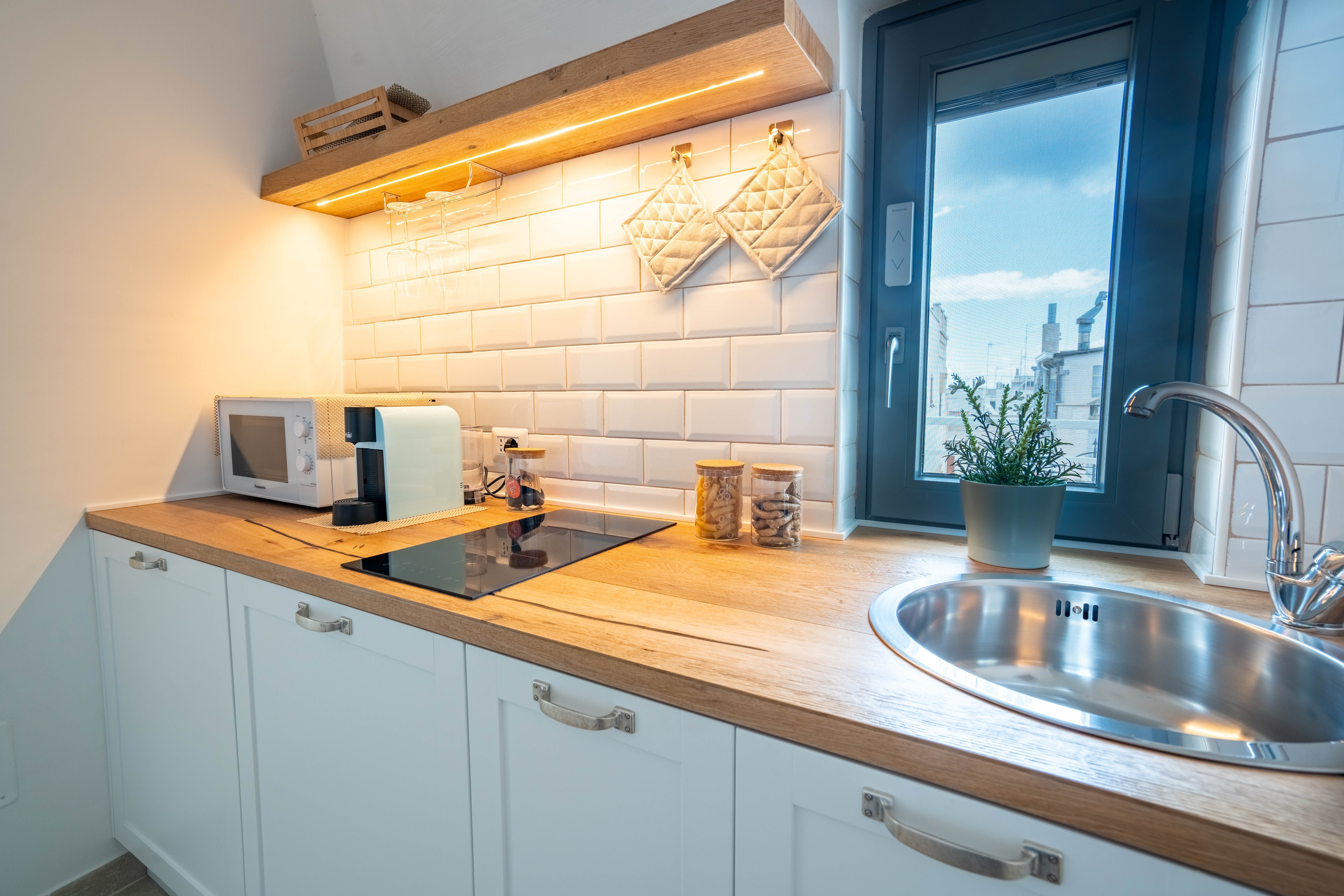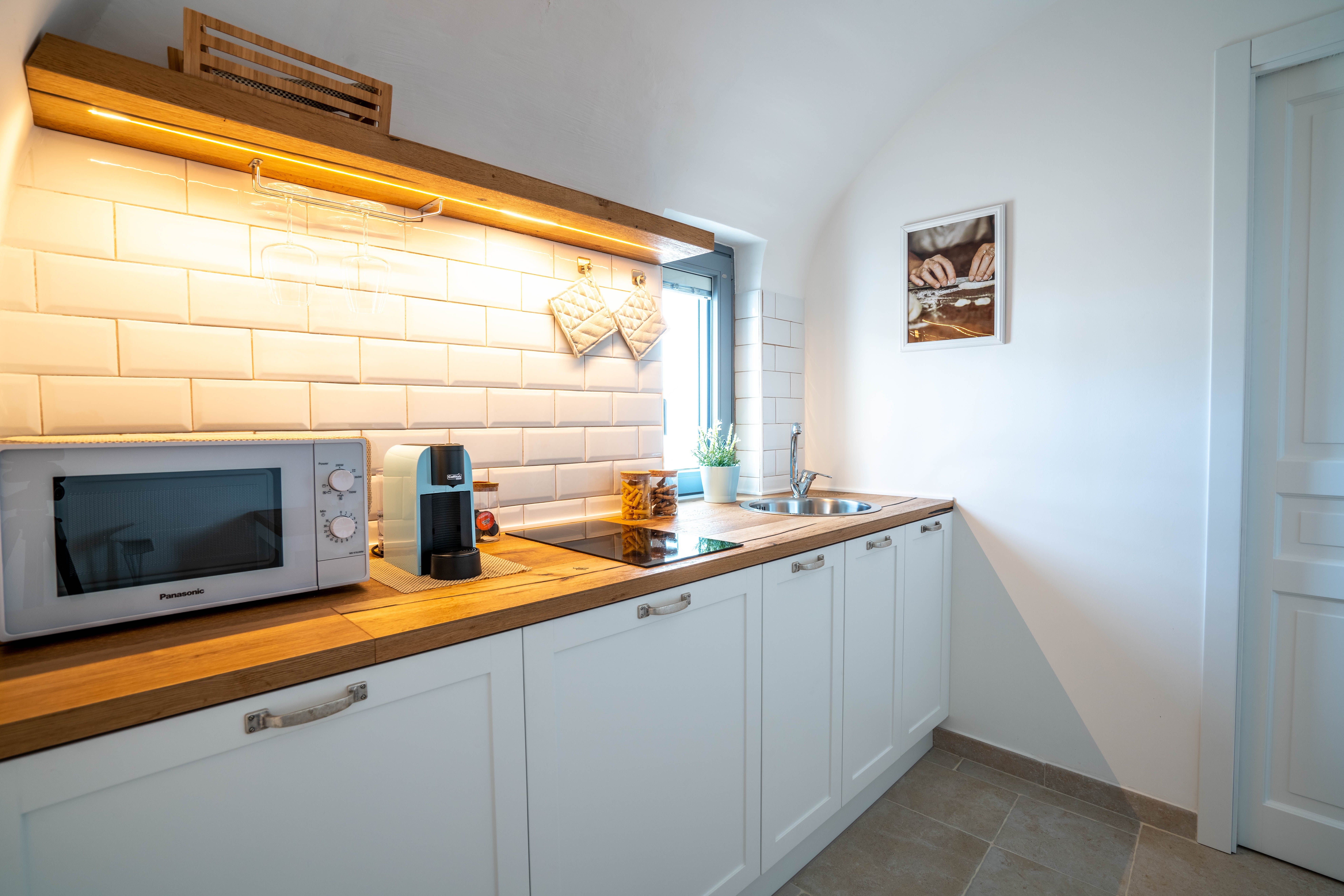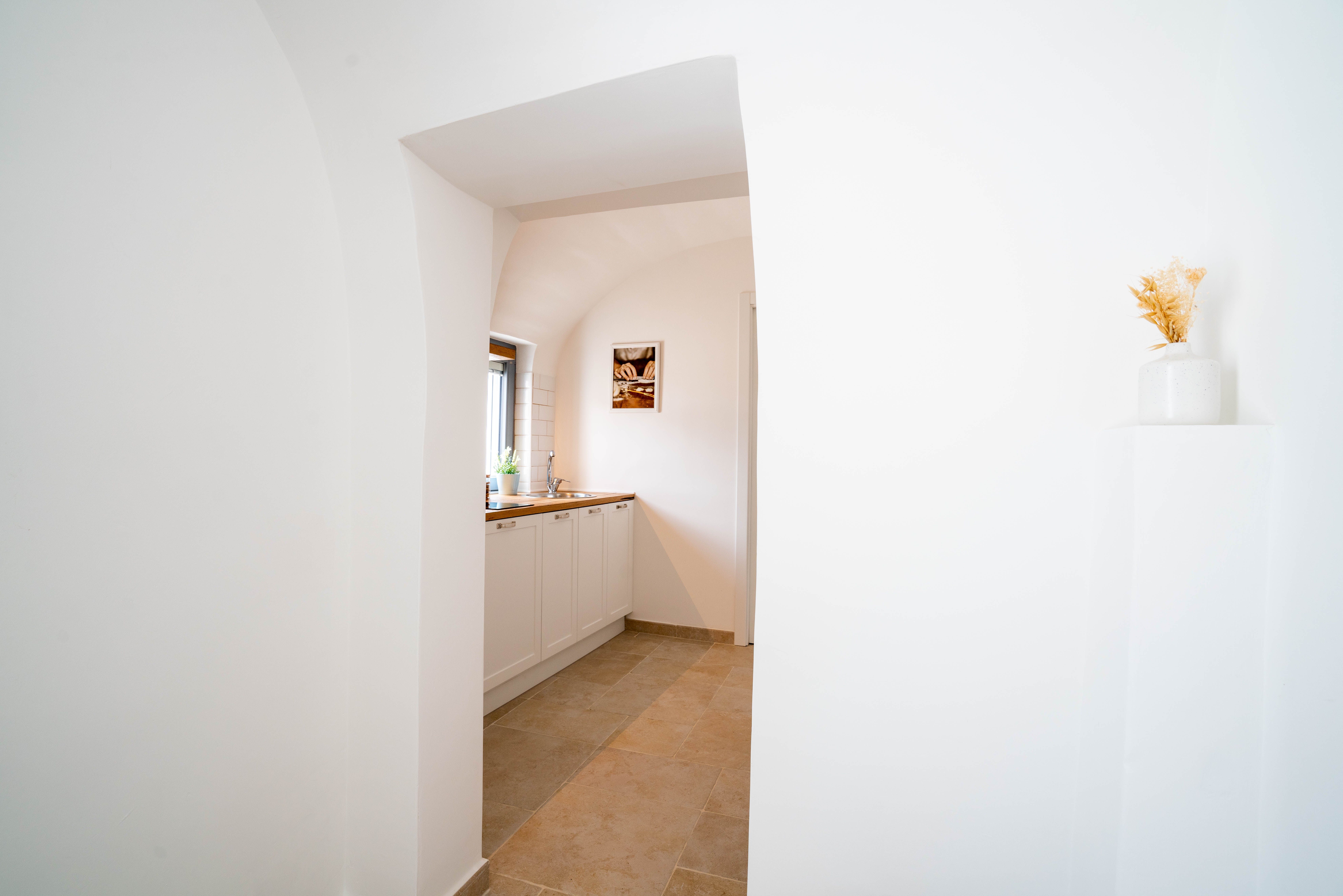 Step in off the narrow cobbled street and discover the charms of its recently renovated interior, which winds up through the home and includes a cosy sitting room and bedroom that share a soothing blue theme and a compact but well-equipped kitchen.
