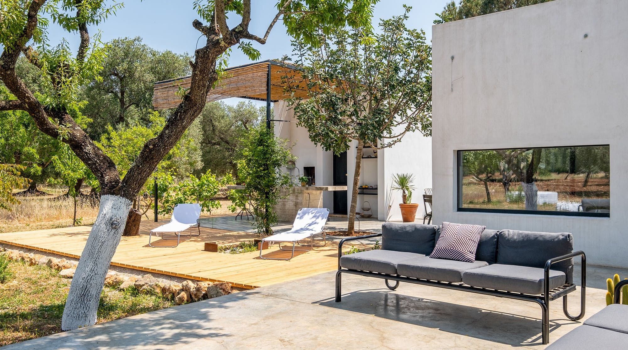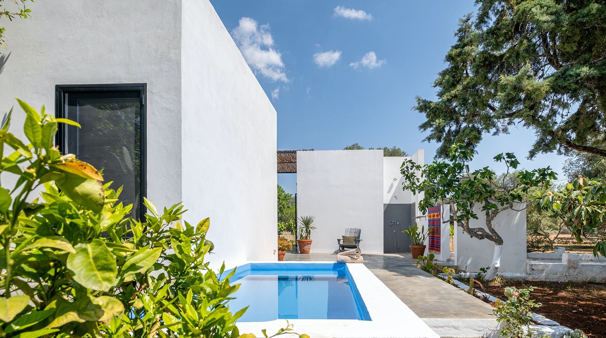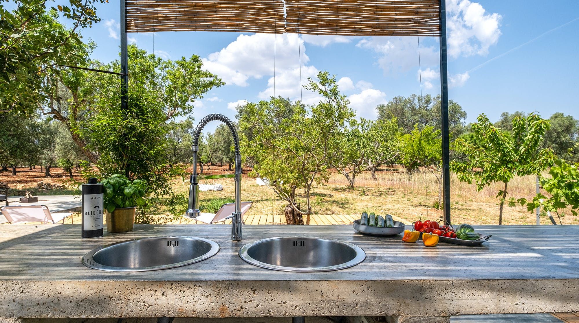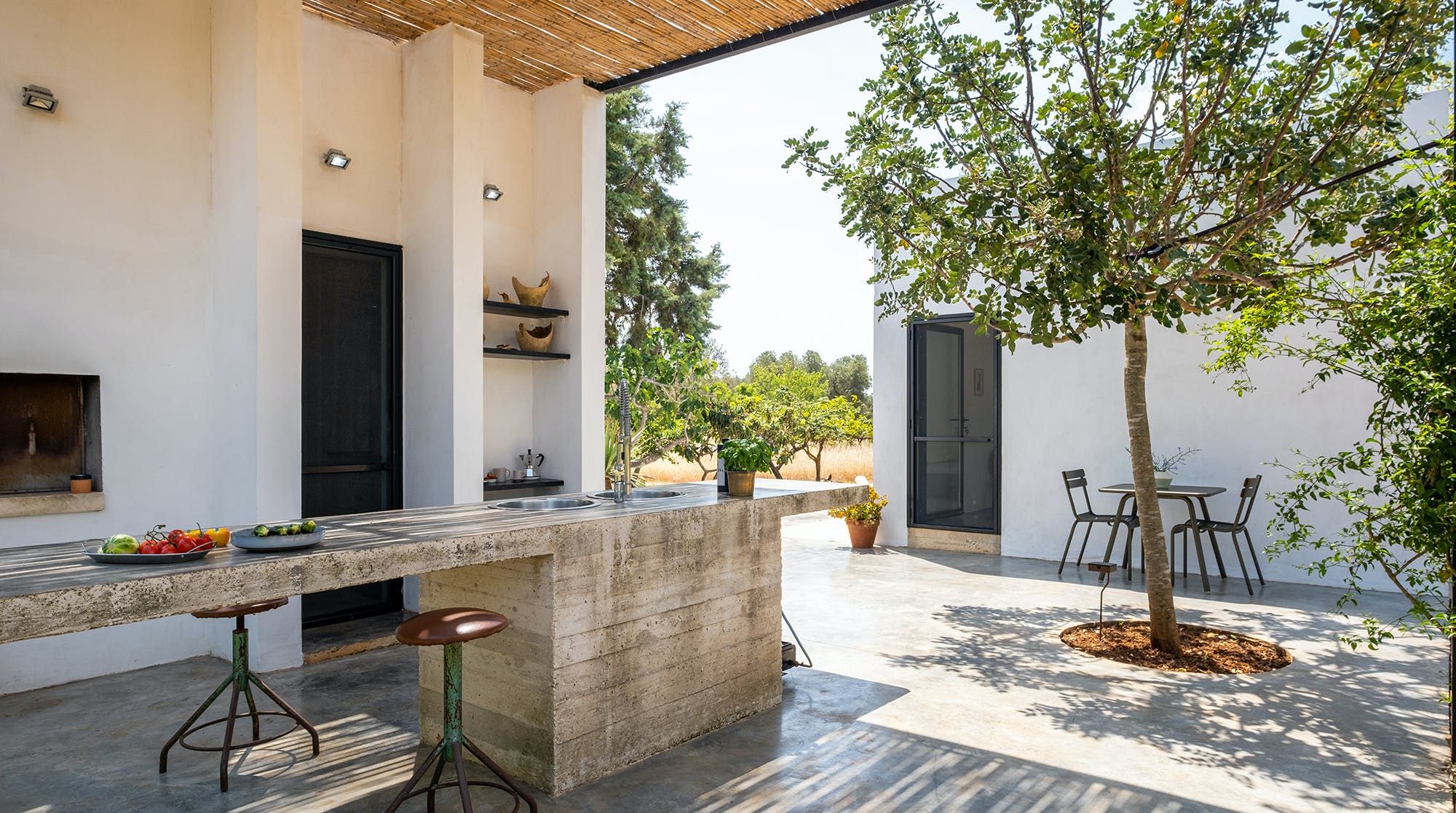 It’s all about escaping the everyday and embracing the landscape here. Surrounded by acres of olive groves and fruit orchards, you’ve got a natural larder to play with – perfect for cooking alfresco in the outdoor kitchen. The entire living space is designed to be outdoors, with the lounge sofas sets around a fire pit and the full kitchen shaded by bamboo and looking out into the olive grove. There’s a swimming pool for cooling off, a hammock strung beneath a century-old olive tree and an outdoor shower tucked away too.