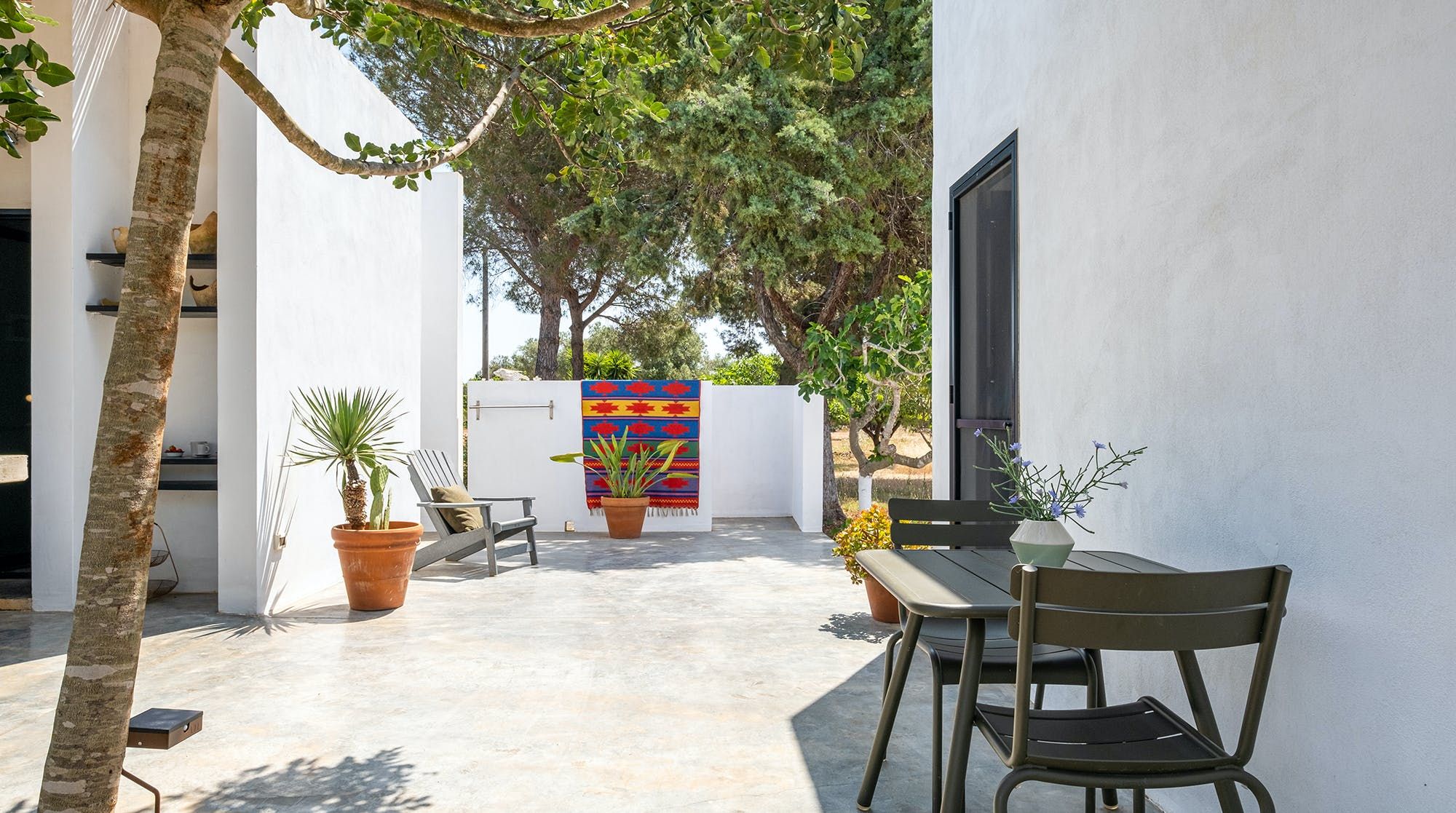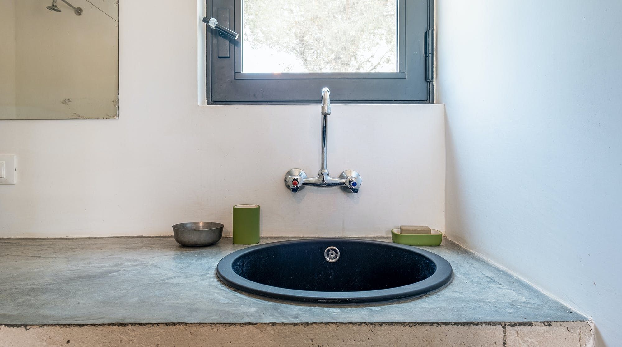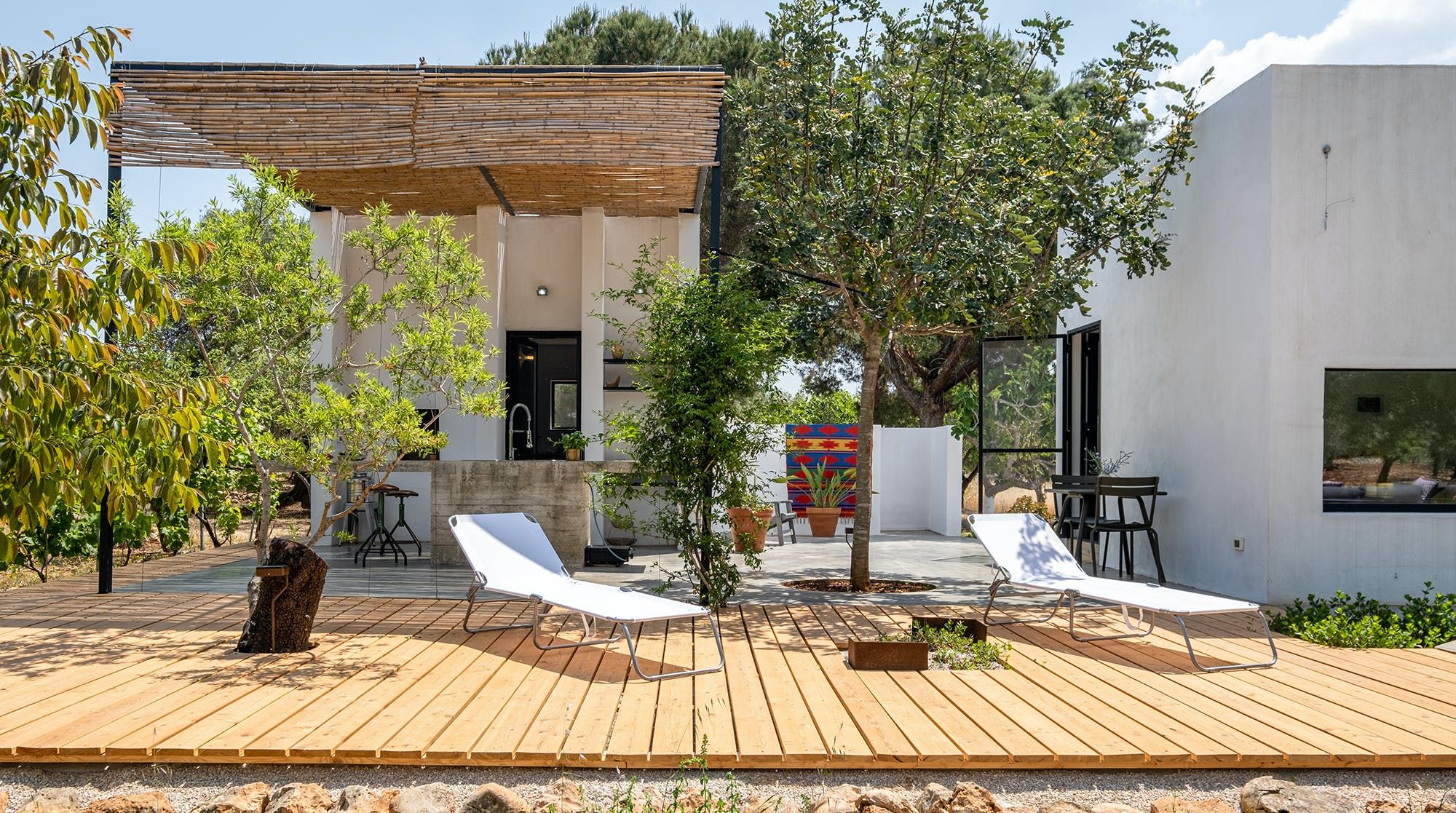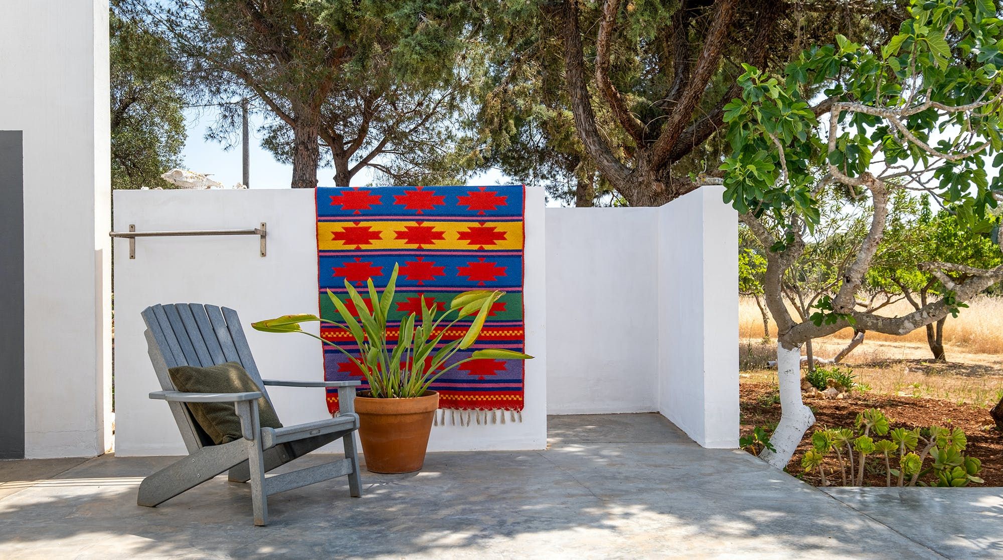 It’s all about escaping the everyday and embracing the landscape here. Surrounded by acres of olive groves and fruit orchards, you’ve got a natural larder to play with – perfect for cooking alfresco in the outdoor kitchen. The entire living space is designed to be outdoors, with the lounge sofas sets around a fire pit and the full kitchen shaded by bamboo and looking out into the olive grove. There’s a swimming pool for cooling off, a hammock strung beneath a century-old olive tree and an outdoor shower tucked away too.