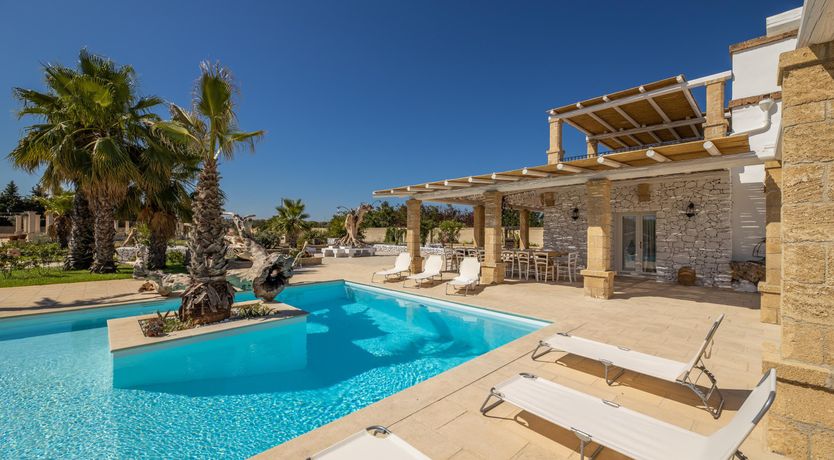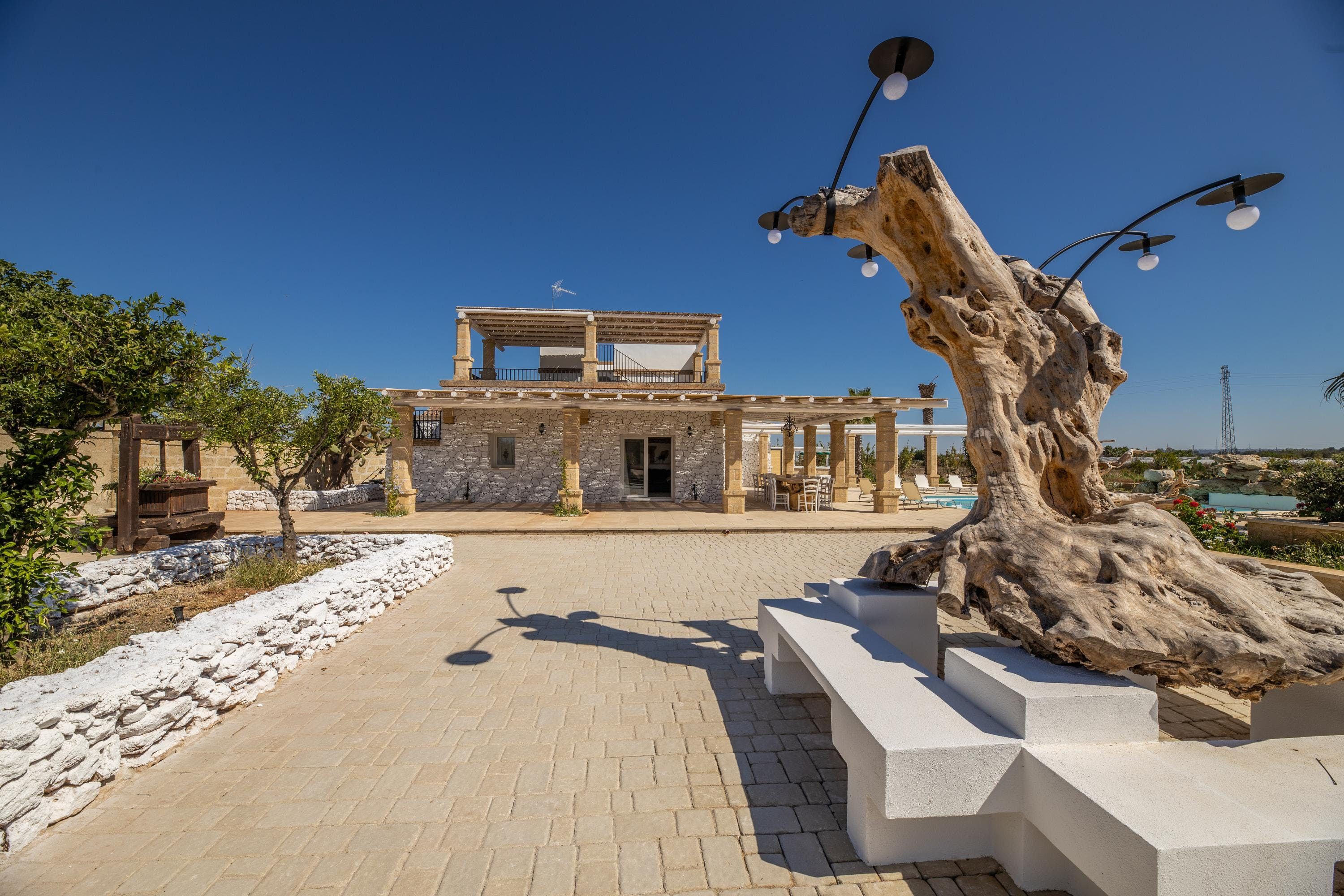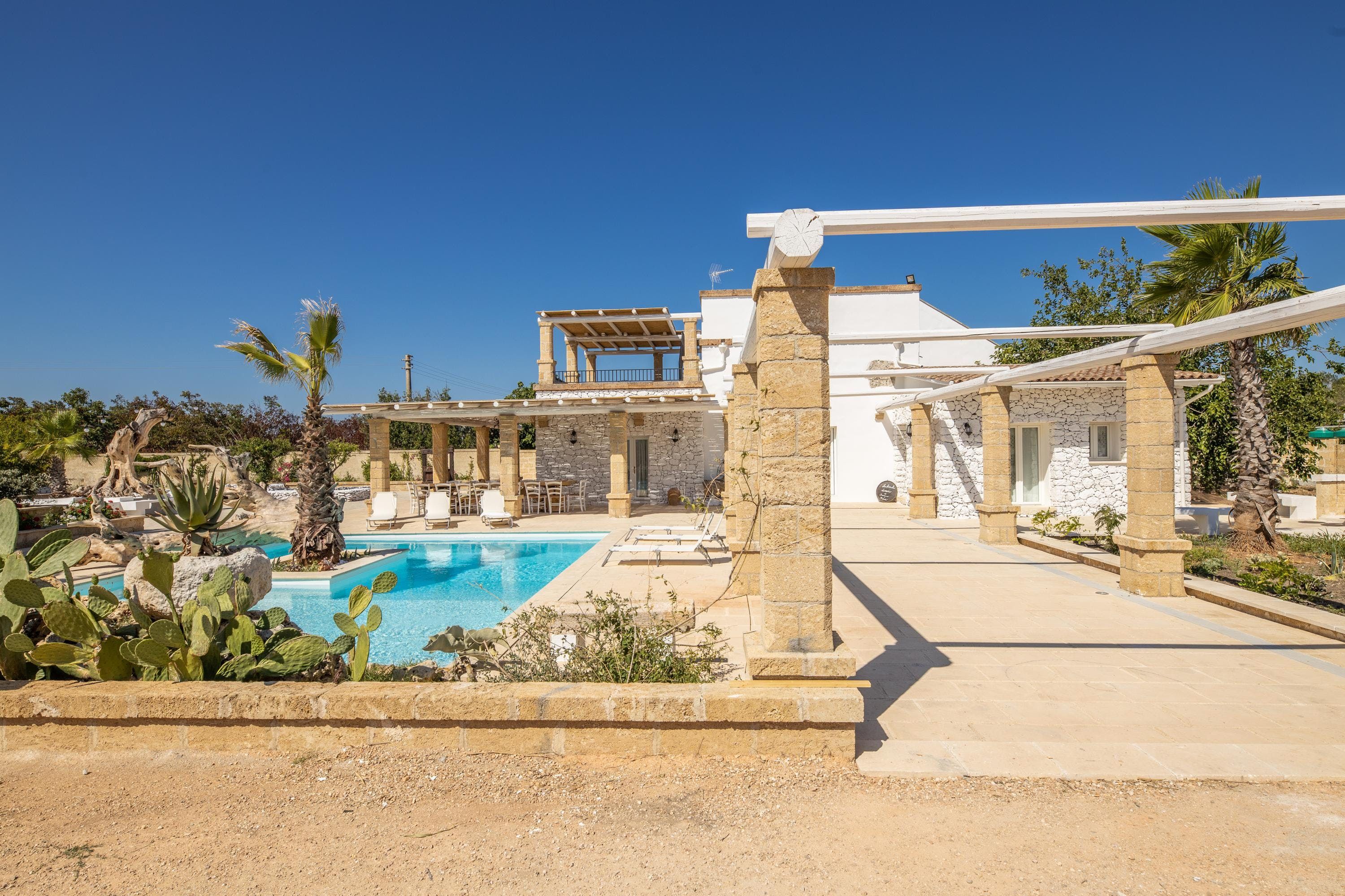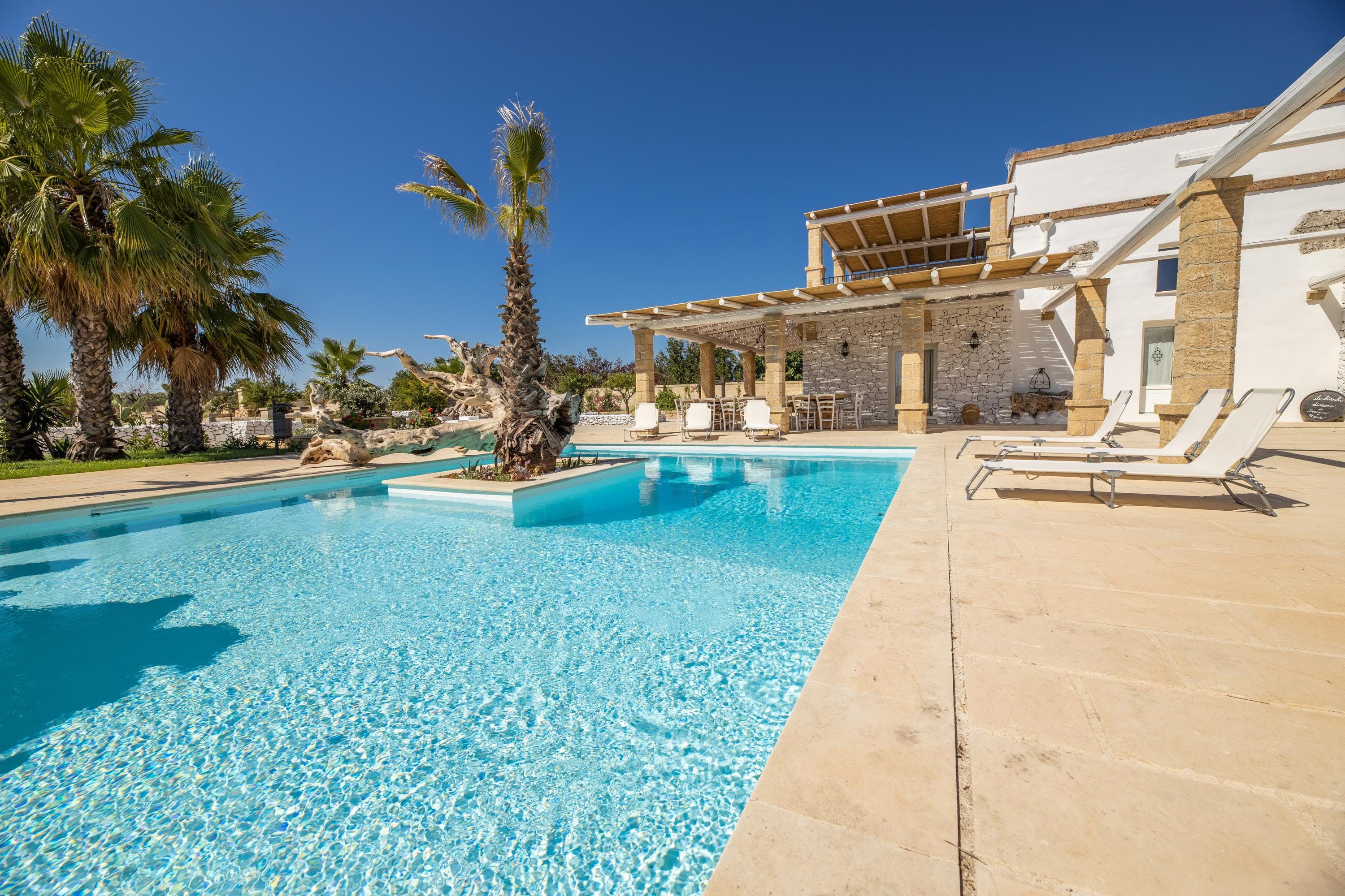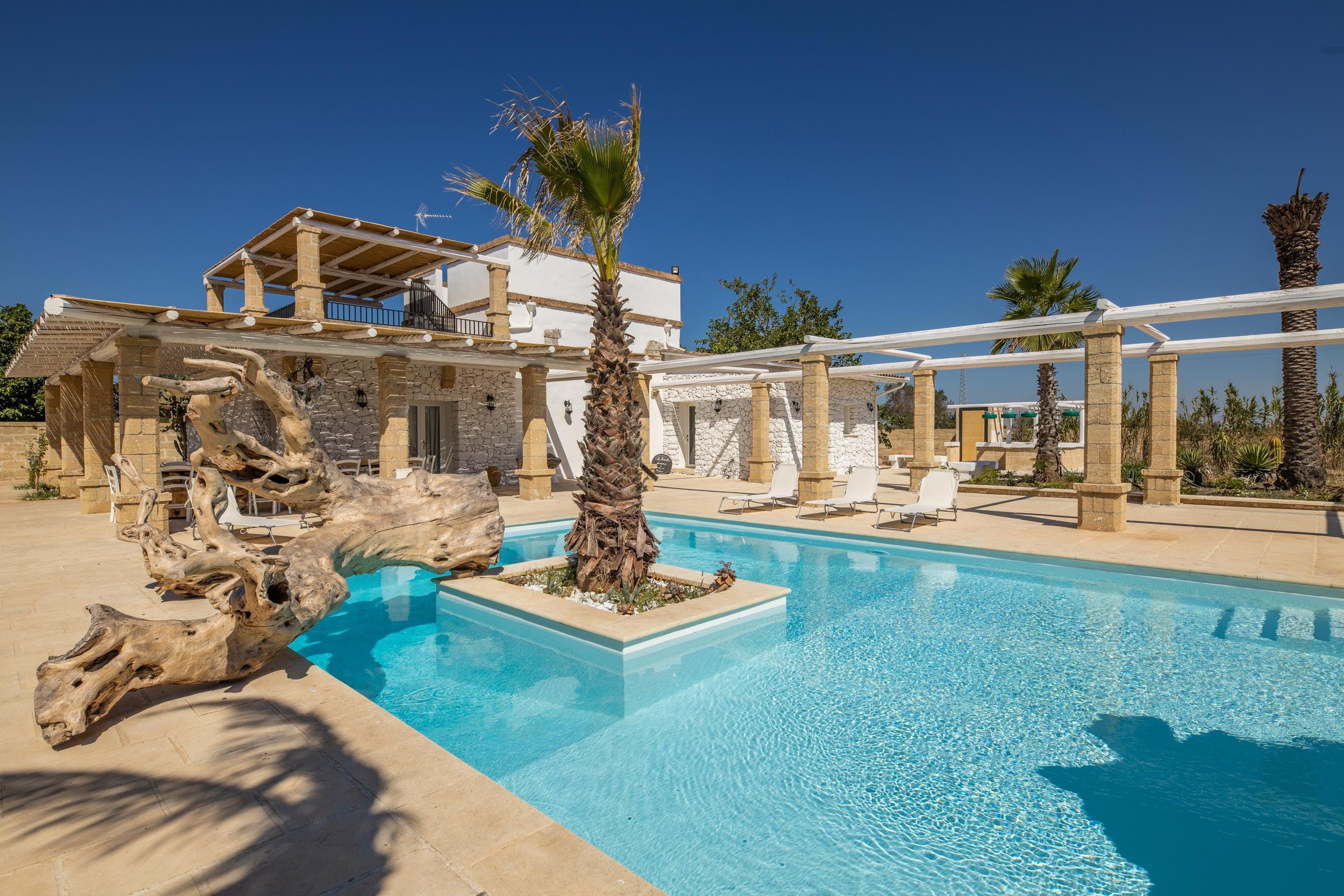 Spend a serene stay at this incredible villa in Taviano, a picturesque town based in the province of Lecce and nicknamed the ‘city of flowers’ for its famous flower fields. You’ll love exploring the Old Town, where sugar-cube buildings sit next to Baroque palaces, and you can find delicious restaurants, trendy bars and quaint cafes. You’re also a short drive from the beaches of Gallipoli, home to classy beach bars and crystal-clear waters.