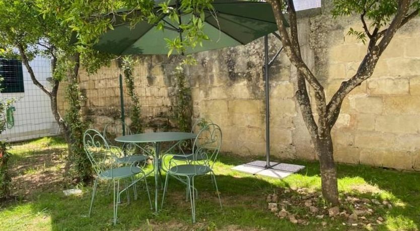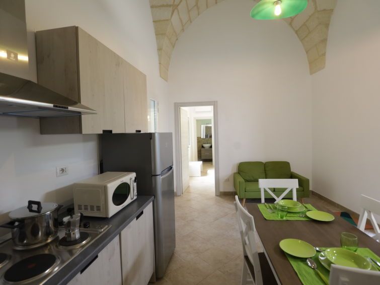 "Spicchi di Salento - Mandarino", 2-room apartment 35 m2, on the ground floor. Fully renovated in 2023, beautiful and stylish furnishings: living/dining room 18 m2 with dining table, kitchen corner, international TV channels, air conditioning and forced-air heating. Exit to the garden.