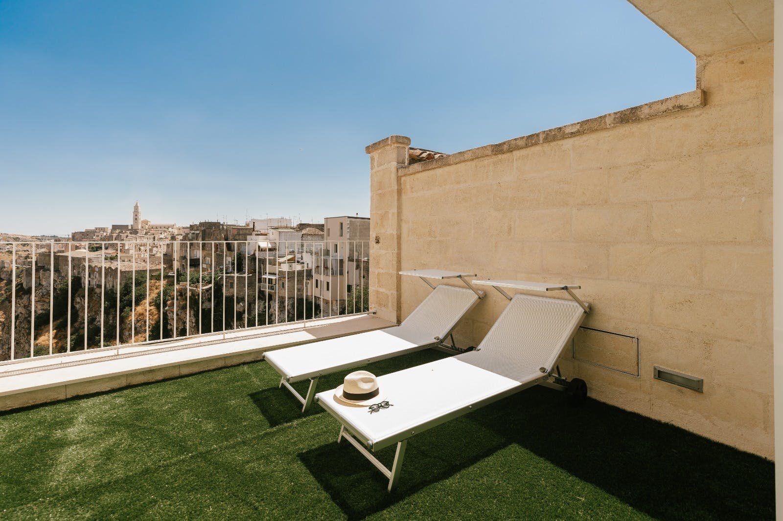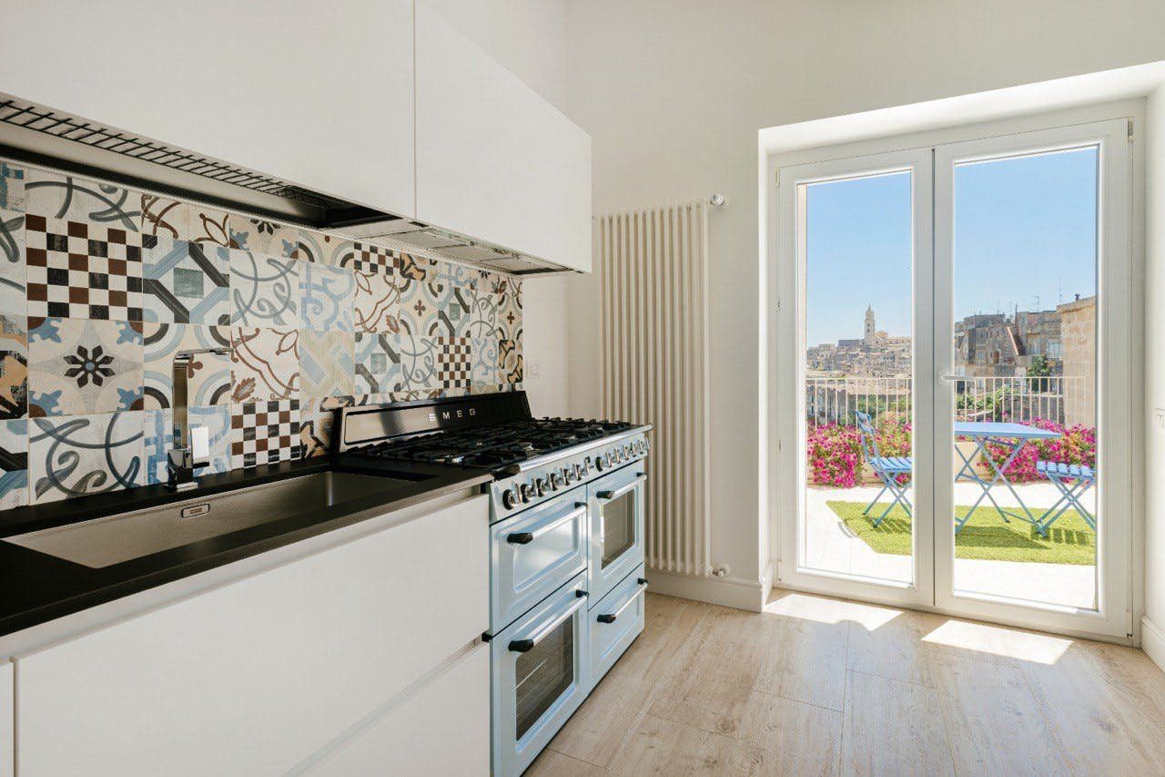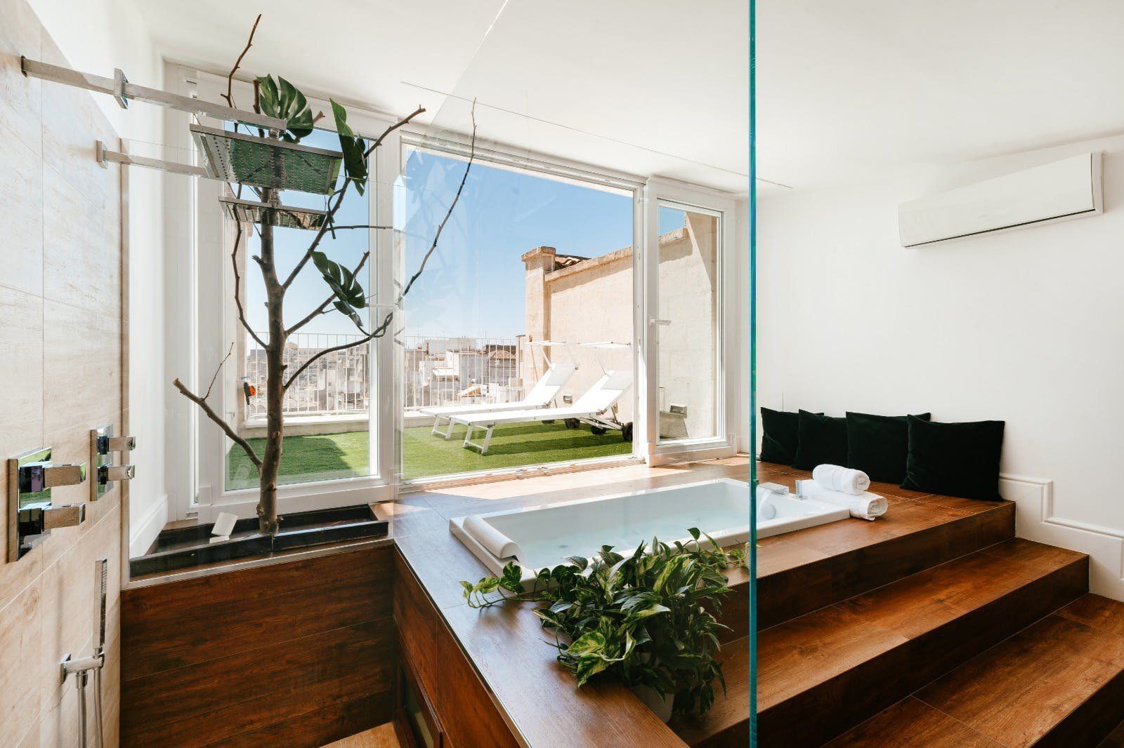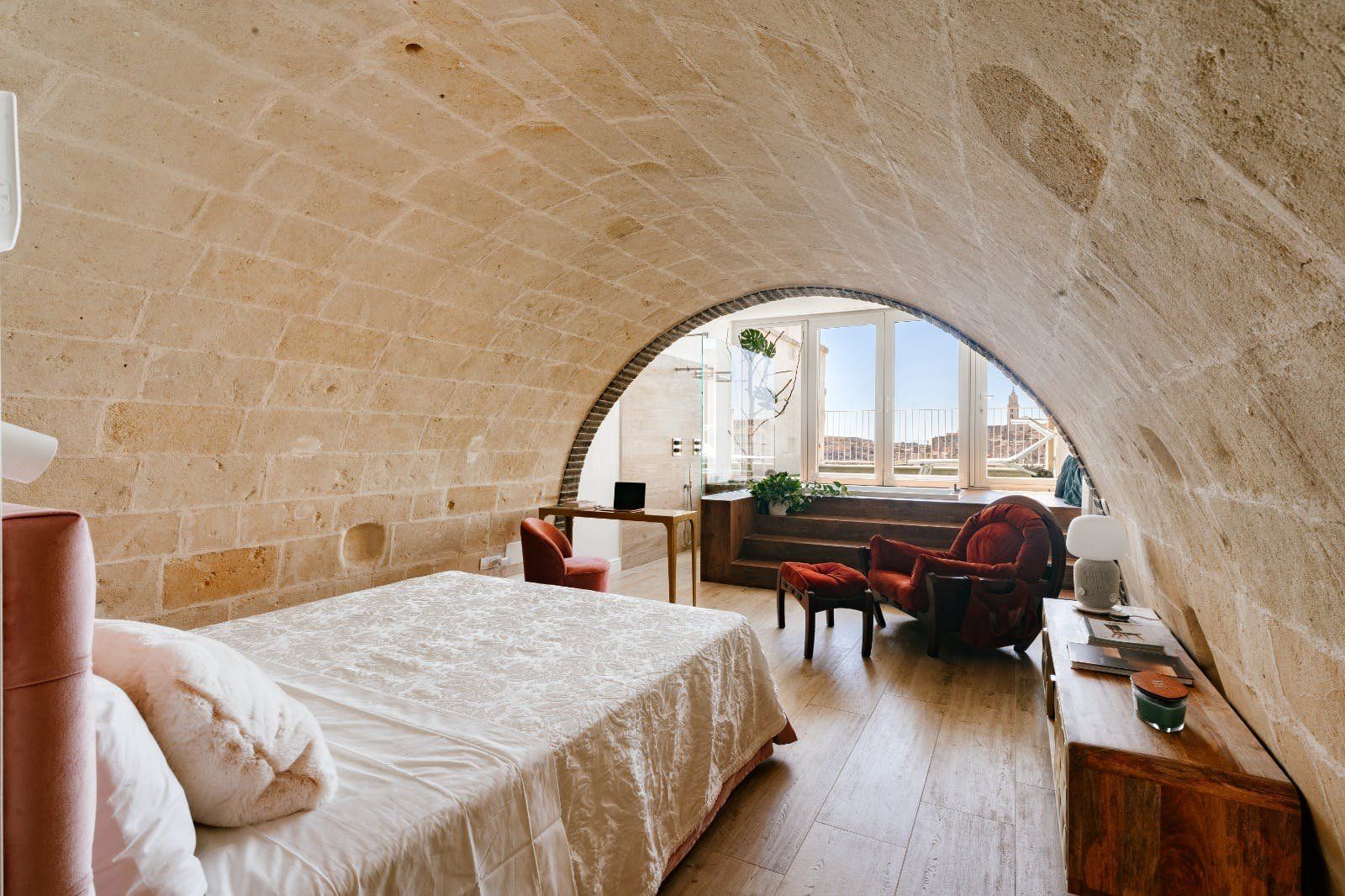 Perched on the outskirts of Matera, this apartment is just the right amount of stylish and charming. Its highlight is undoubtedly the solarium, with space for alfresco dining and sunbathing. The en-suite bathtub is sunken into the ground, offering spectacular views through the French doors. There's space to park for free on the street, but the city centre is so close that you won't necessarily need a car to get the most out of your stay here. You'll have easy access to Matera's fantastic restaurants and truly unique architecture, with buildings built into the natural caves of the Murgia.