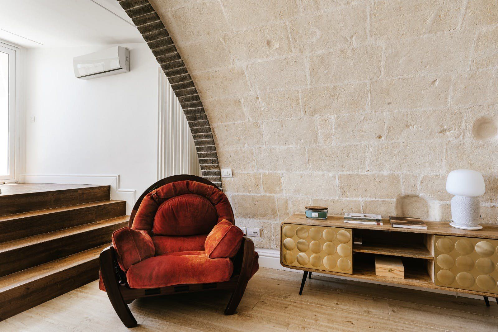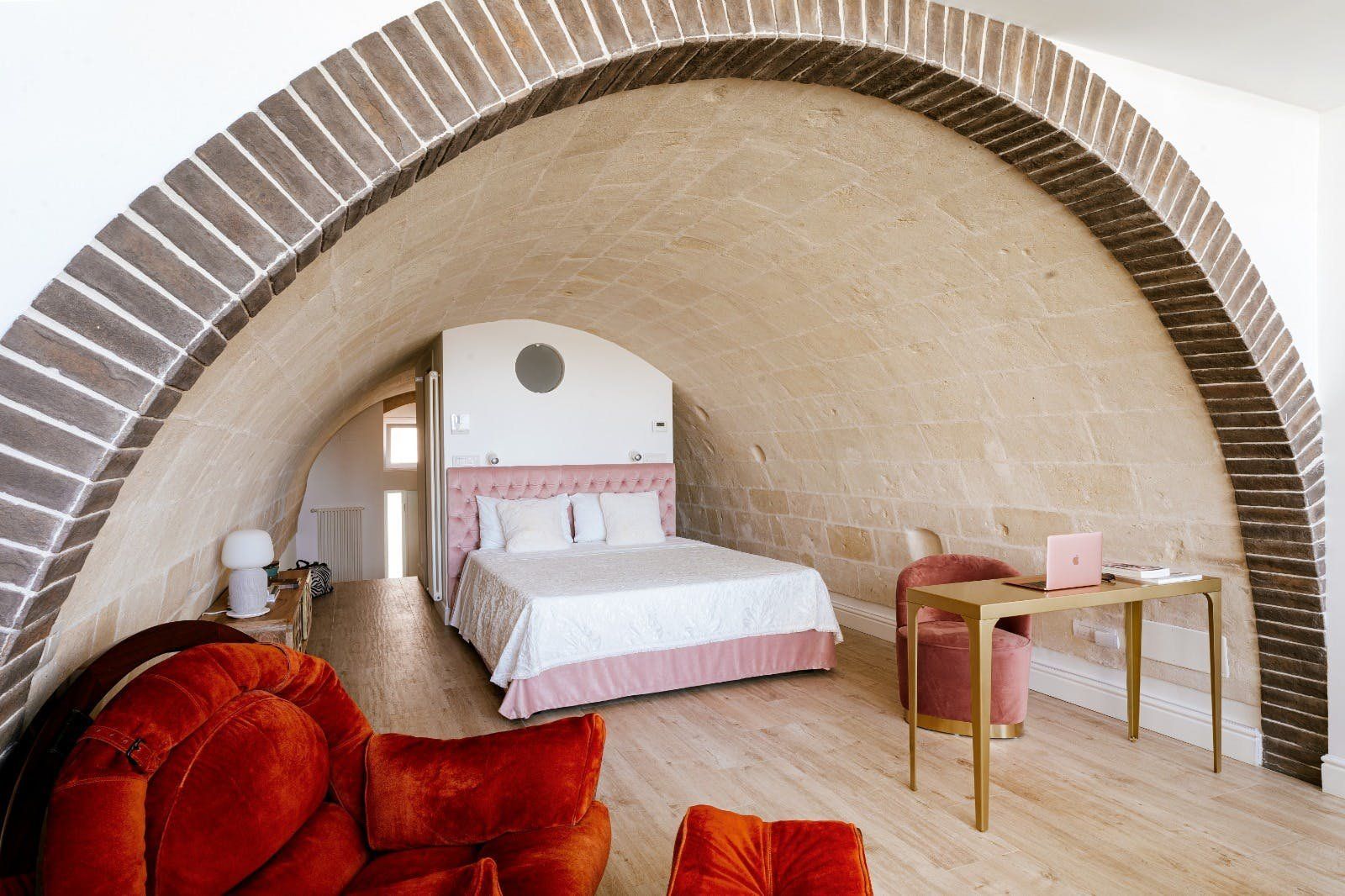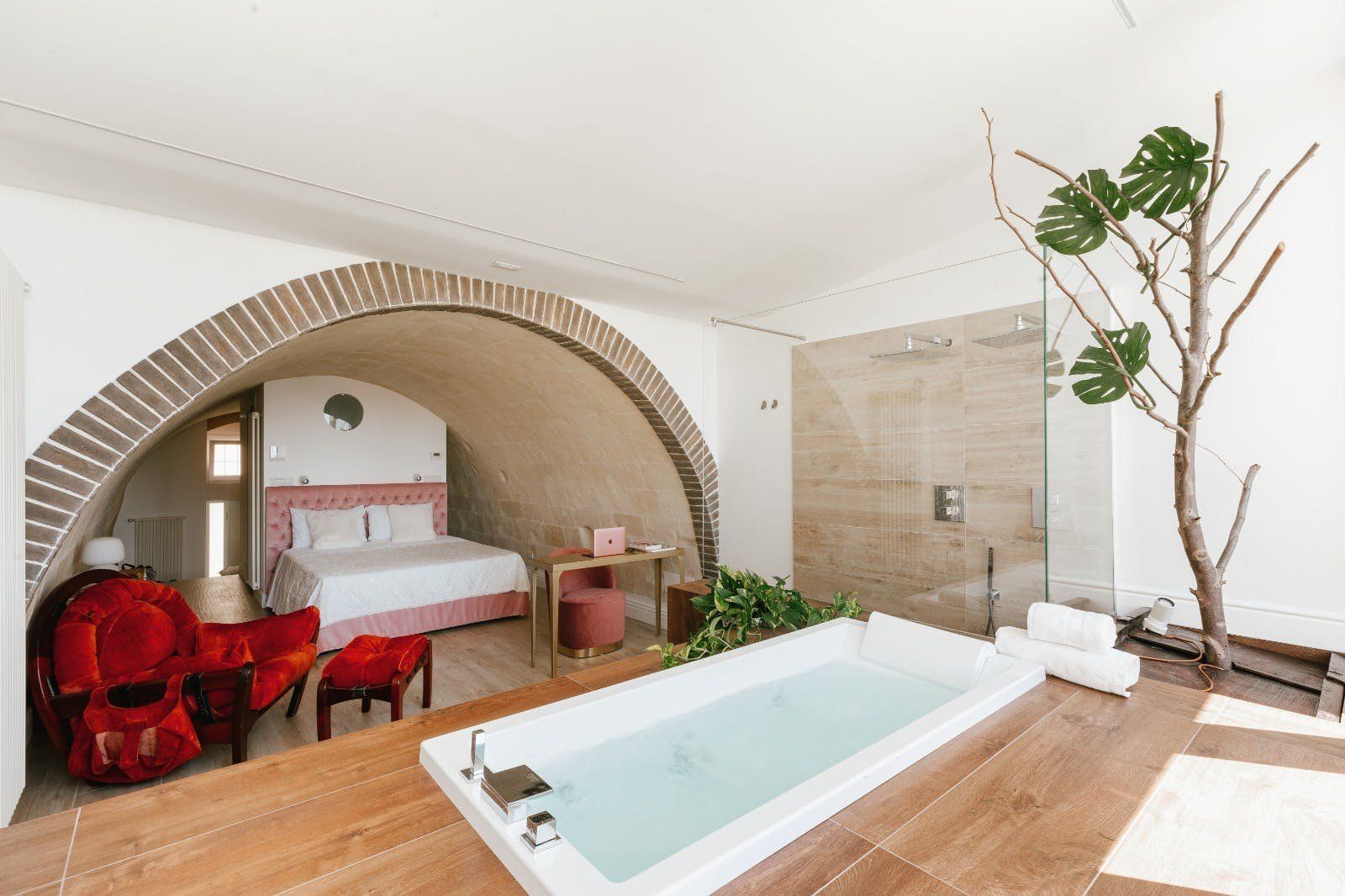 Perched on the outskirts of Matera, this apartment is just the right amount of stylish and charming. Its highlight is undoubtedly the solarium, with space for alfresco dining and sunbathing. The en-suite bathtub is sunken into the ground, offering spectacular views through the French doors. There's space to park for free on the street, but the city centre is so close that you won't necessarily need a car to get the most out of your stay here. You'll have easy access to Matera's fantastic restaurants and truly unique architecture, with buildings built into the natural caves of the Murgia.