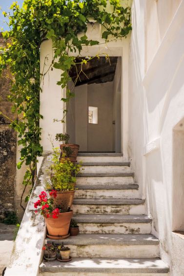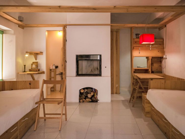 "Fazio", 1-room apartment 35 m2 on 1st floor. Simple and cosy furnishings: upper floor: (exterior staircase) living/sleeping room with 2 sofabeds, open-hearth fireplace and dining nook. Exit to the loggia. Kitchenette (2 hot plates, mini-oven, oven). Shower/bidet/WC. No heating option.