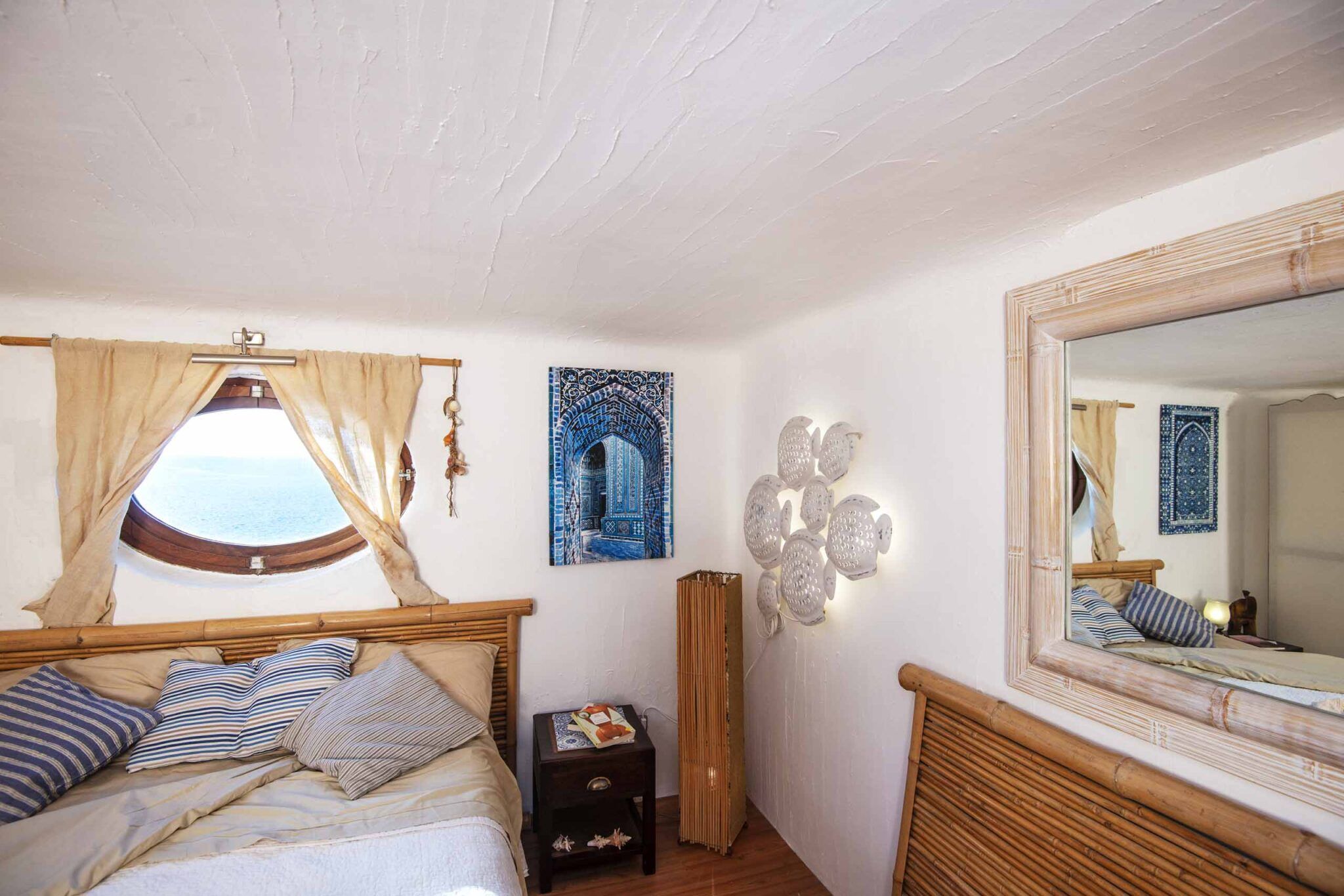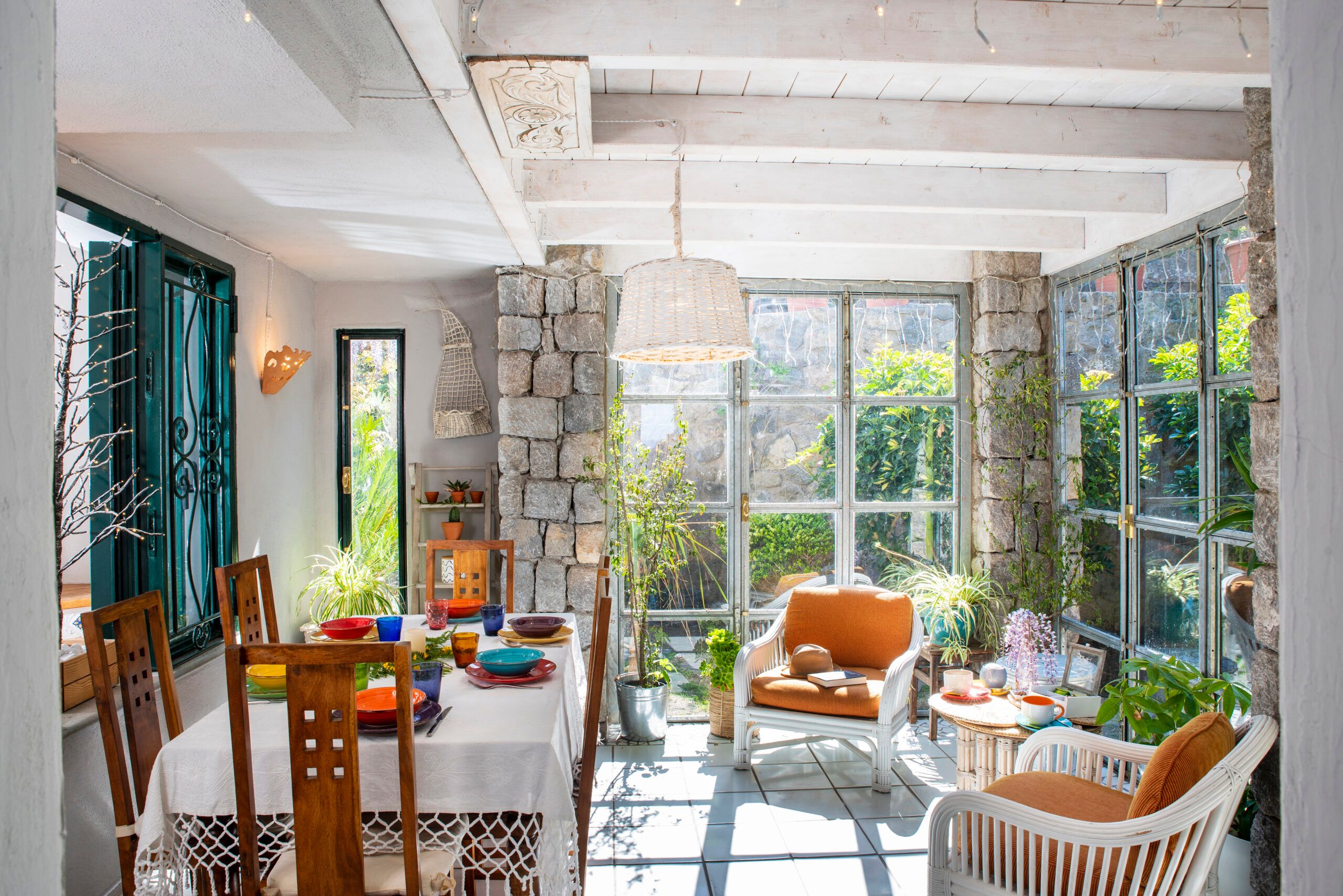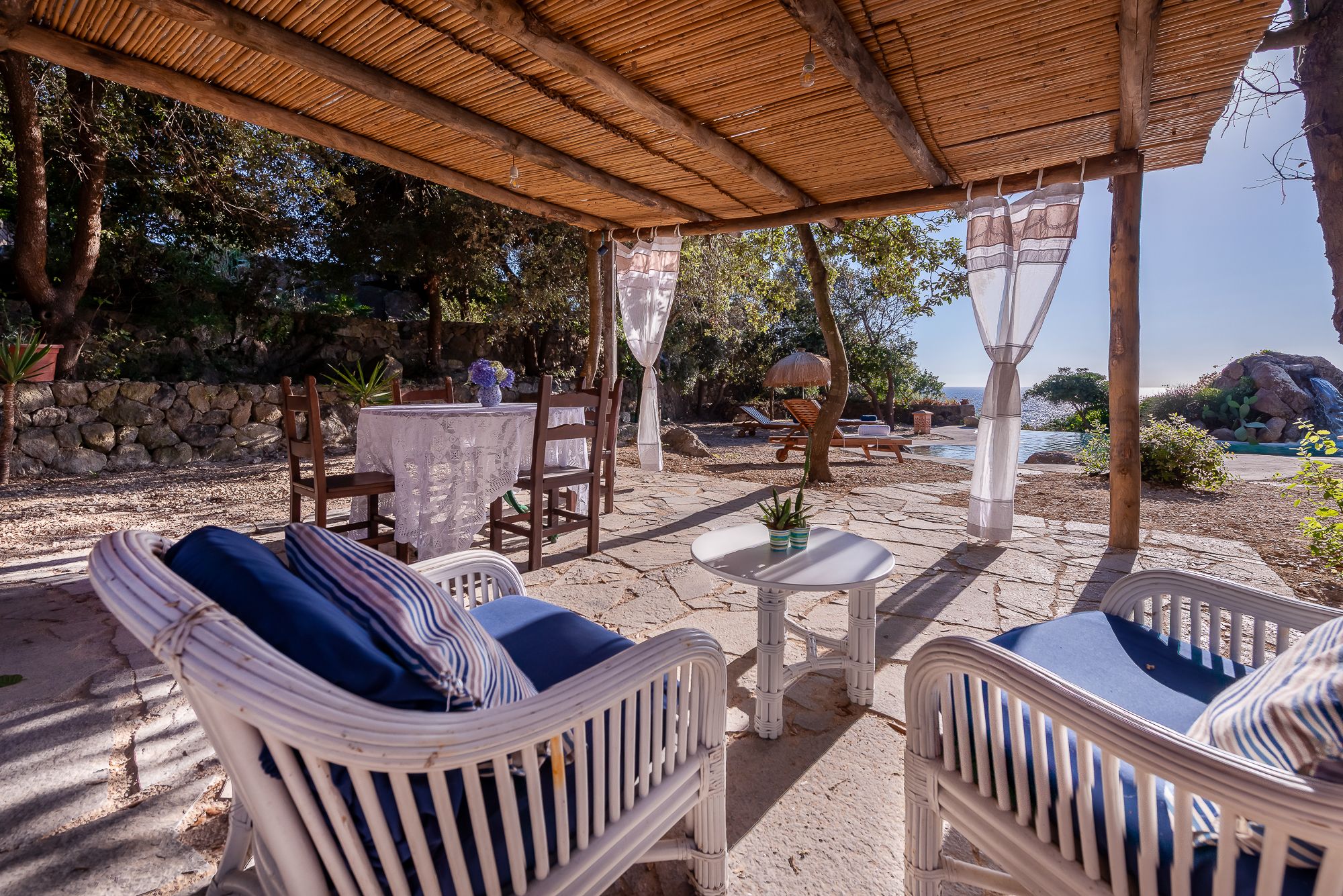 This stunning home is situated between the sea and the woods, in a tranquil spot on the island of Ischia. Drink in sea views and vistas of San Francesco Bay, Forio, and Ventotene from the sun loungers, the alfresco dining area, and the other pretty corners of the garden. There’s a Jacuzzi with sea views on the upper terrace, and a path leads directly to the sea. The villa is cheerful and pretty, with splashes of blue bringing the sea inside.