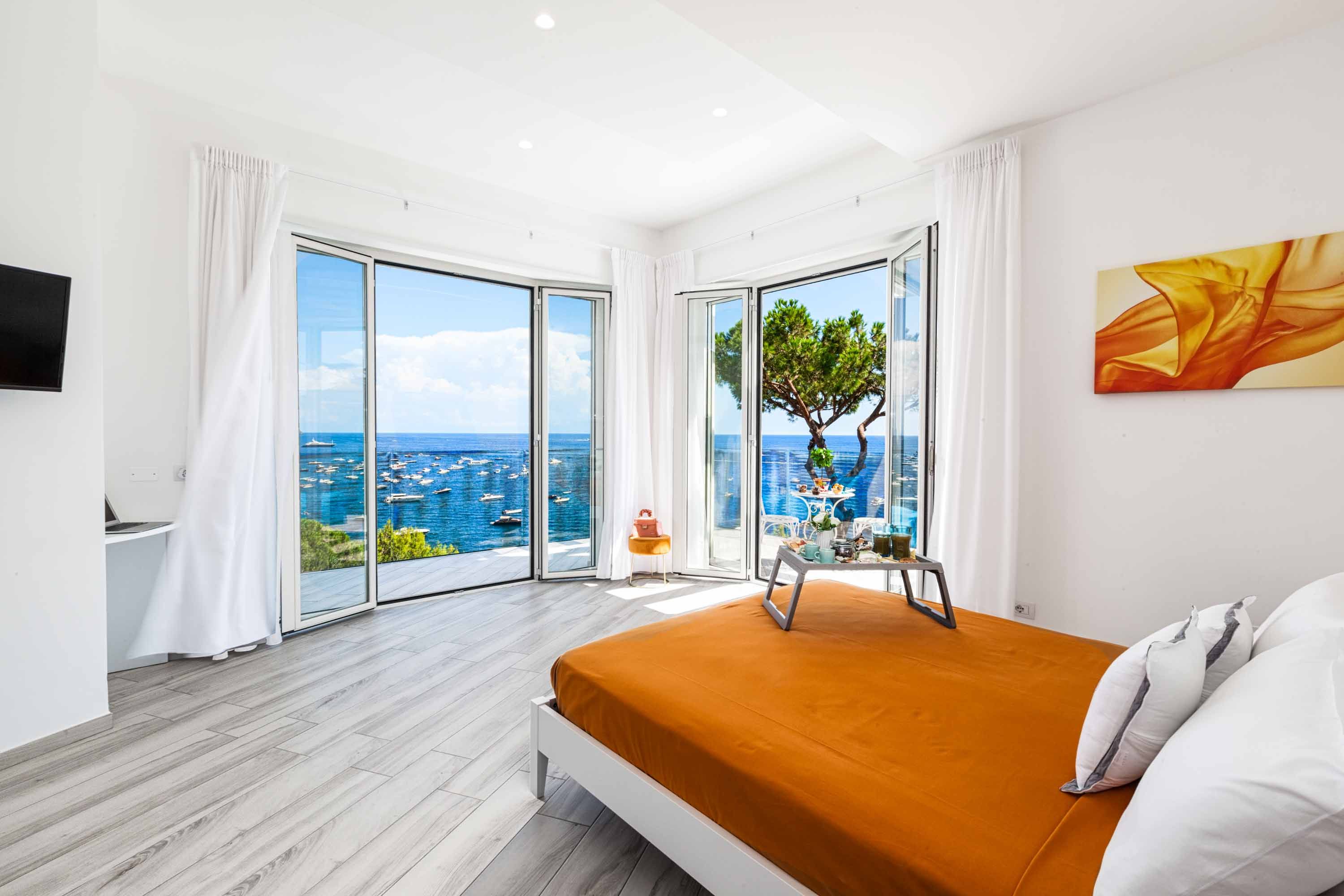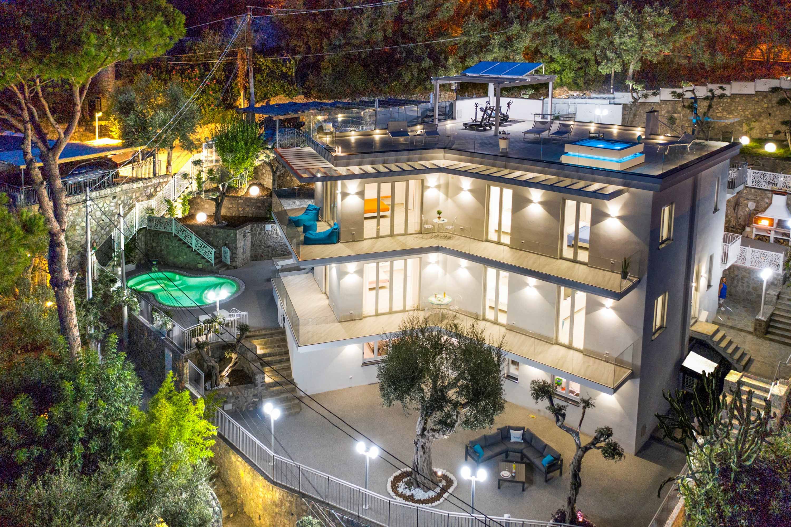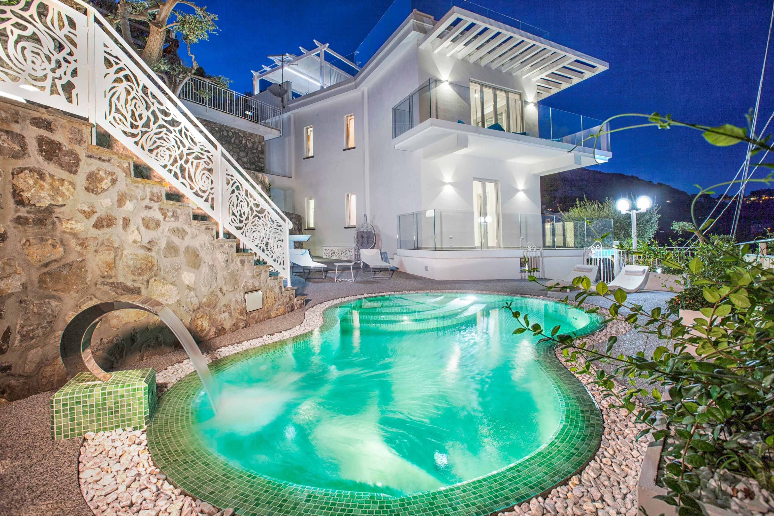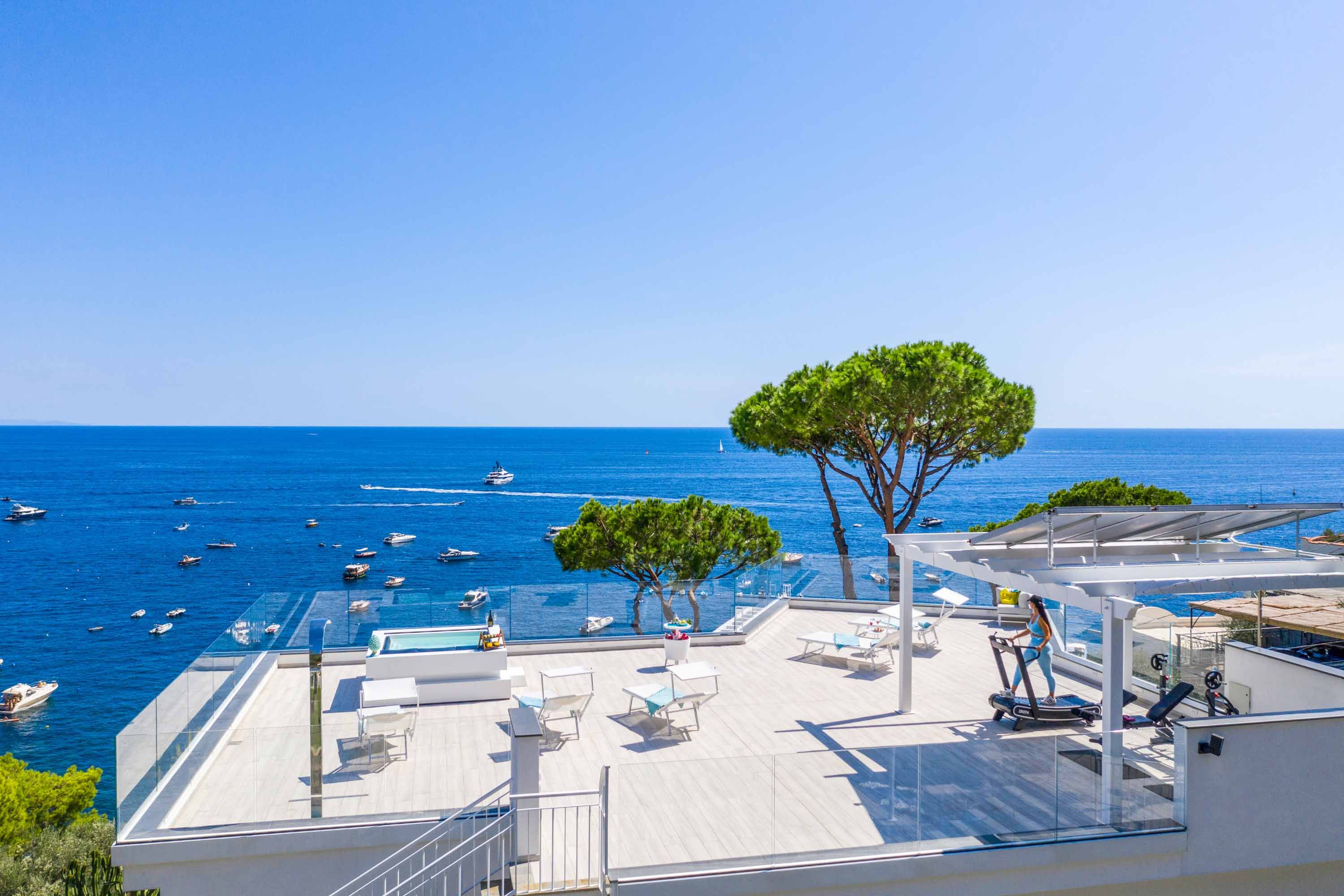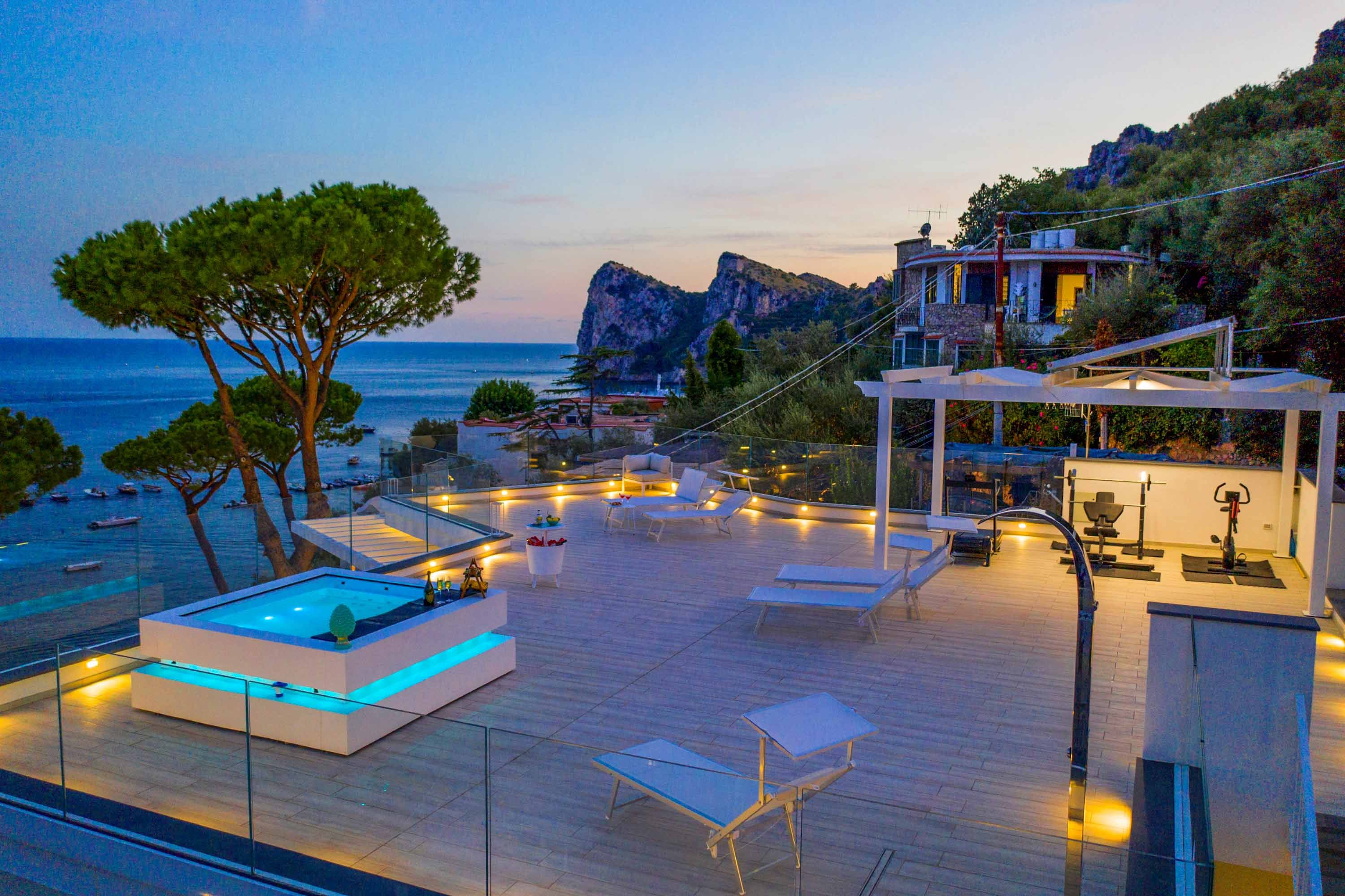 Just outside of the charming village of Nerano, this exquisite villa offers incredible views over the Tyrrhenian Sea. A stone’s throw from rows of authentic seafood restaurants and a pretty pebble beach, a great time can be had close to home, but we recommend renting a car so you can enjoy day drips to Massa Lubrenese and Sorrento. The villa itself boasts several terraces and balconies, so you can take in the mountainscapes from several spots, from the balcony to the luxurious Jacuzzi. There’s even an outdoor gym if you’re keen on keeping up the fitness routine, and a kidney-shaped pool in the garden.