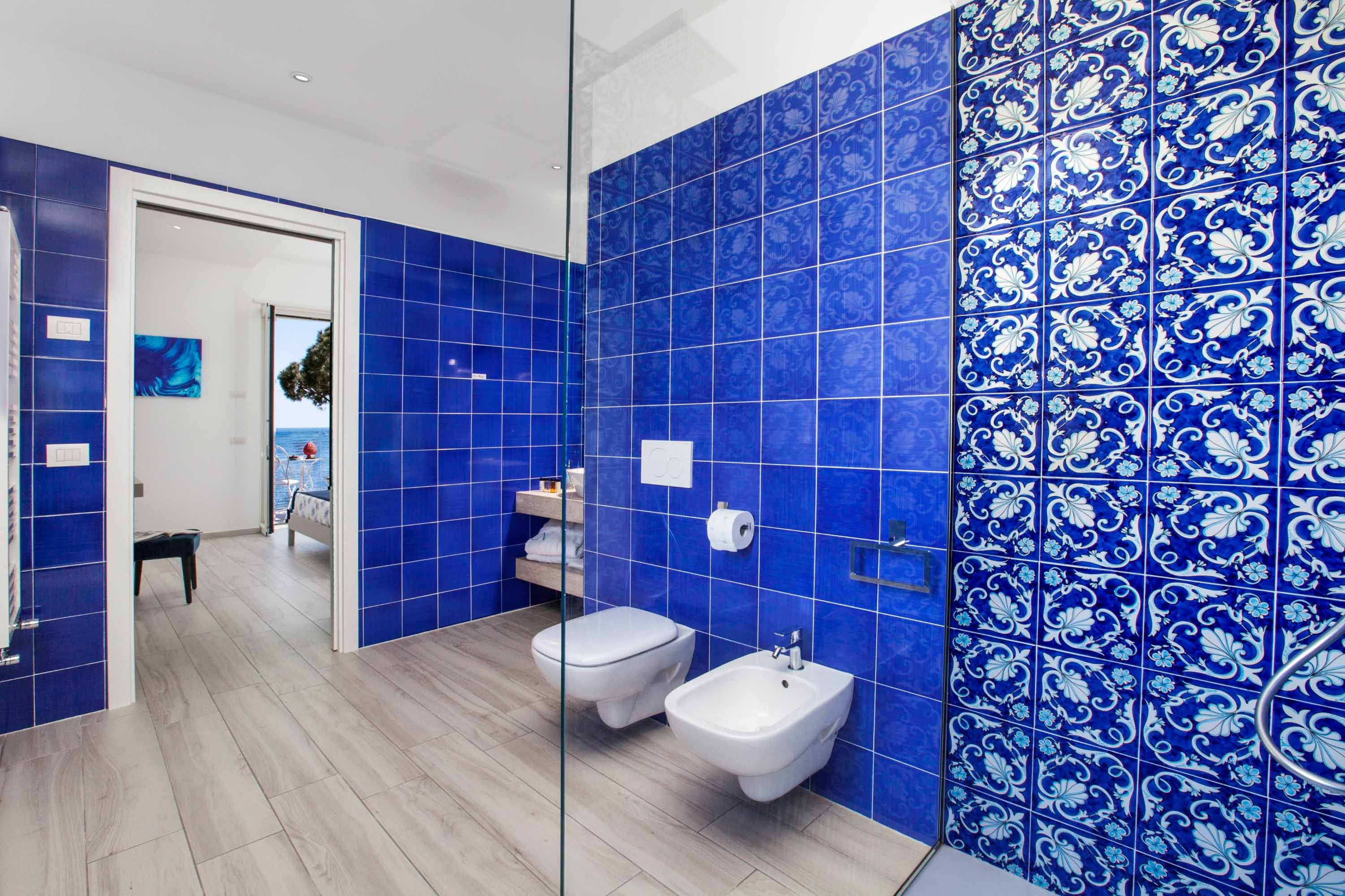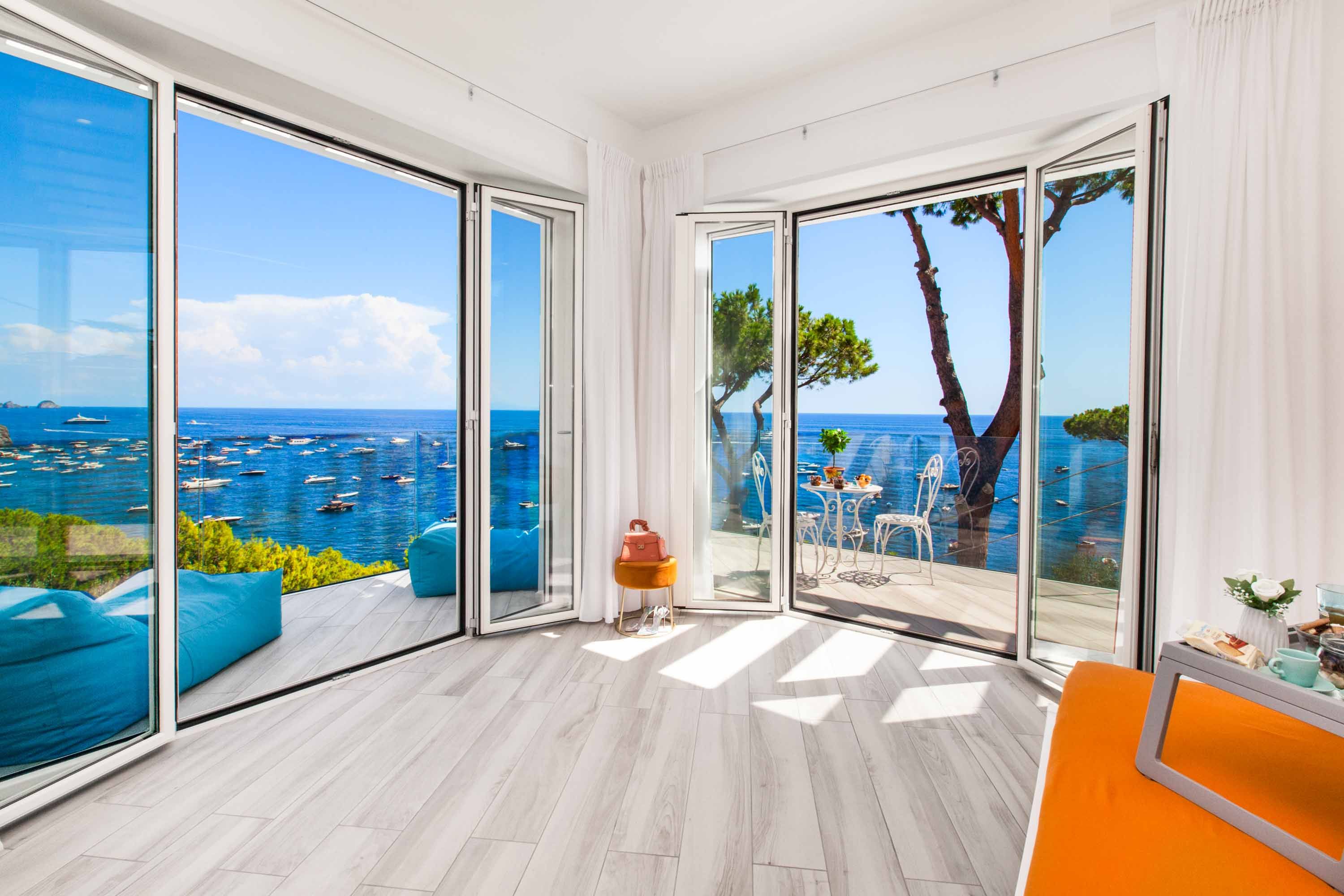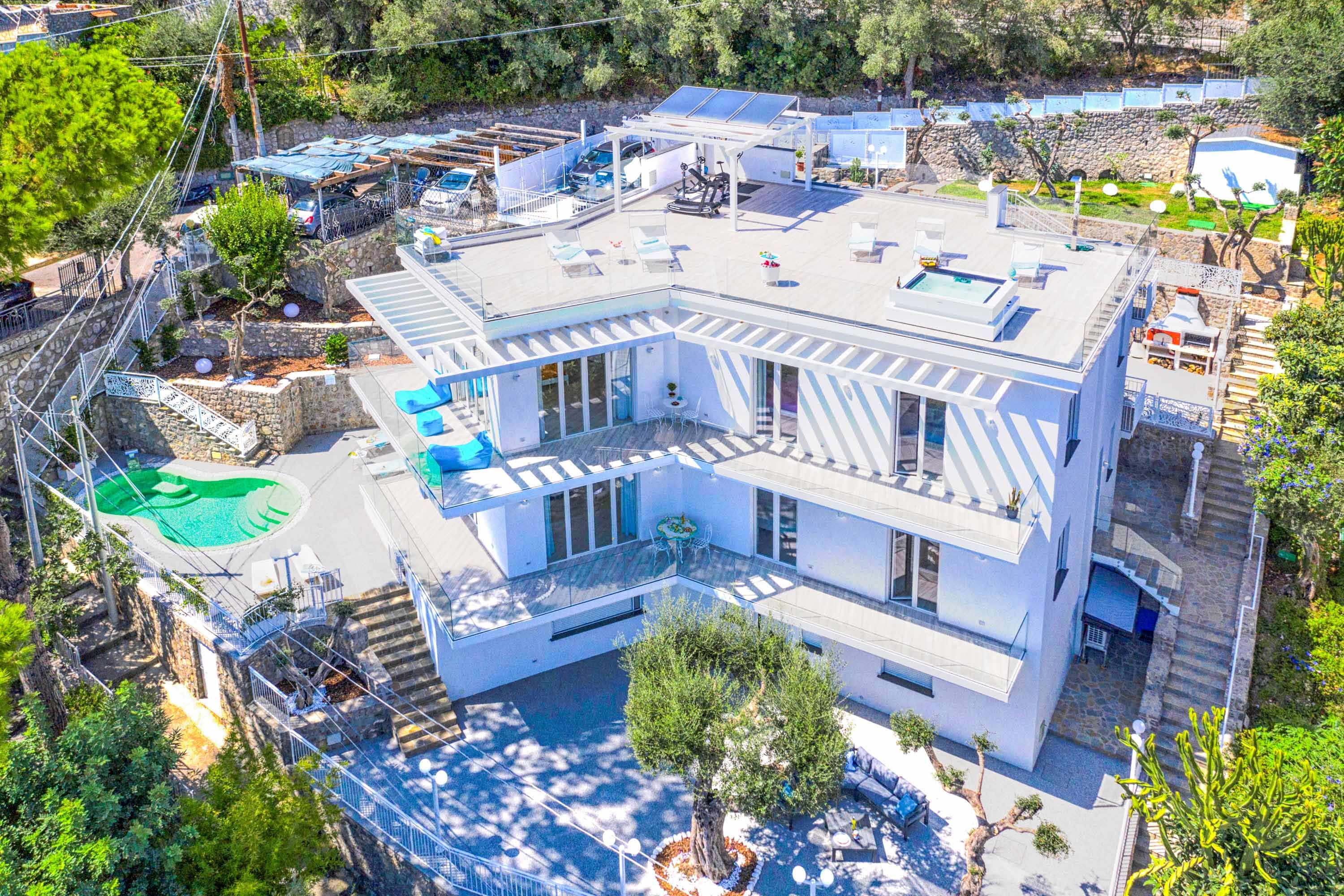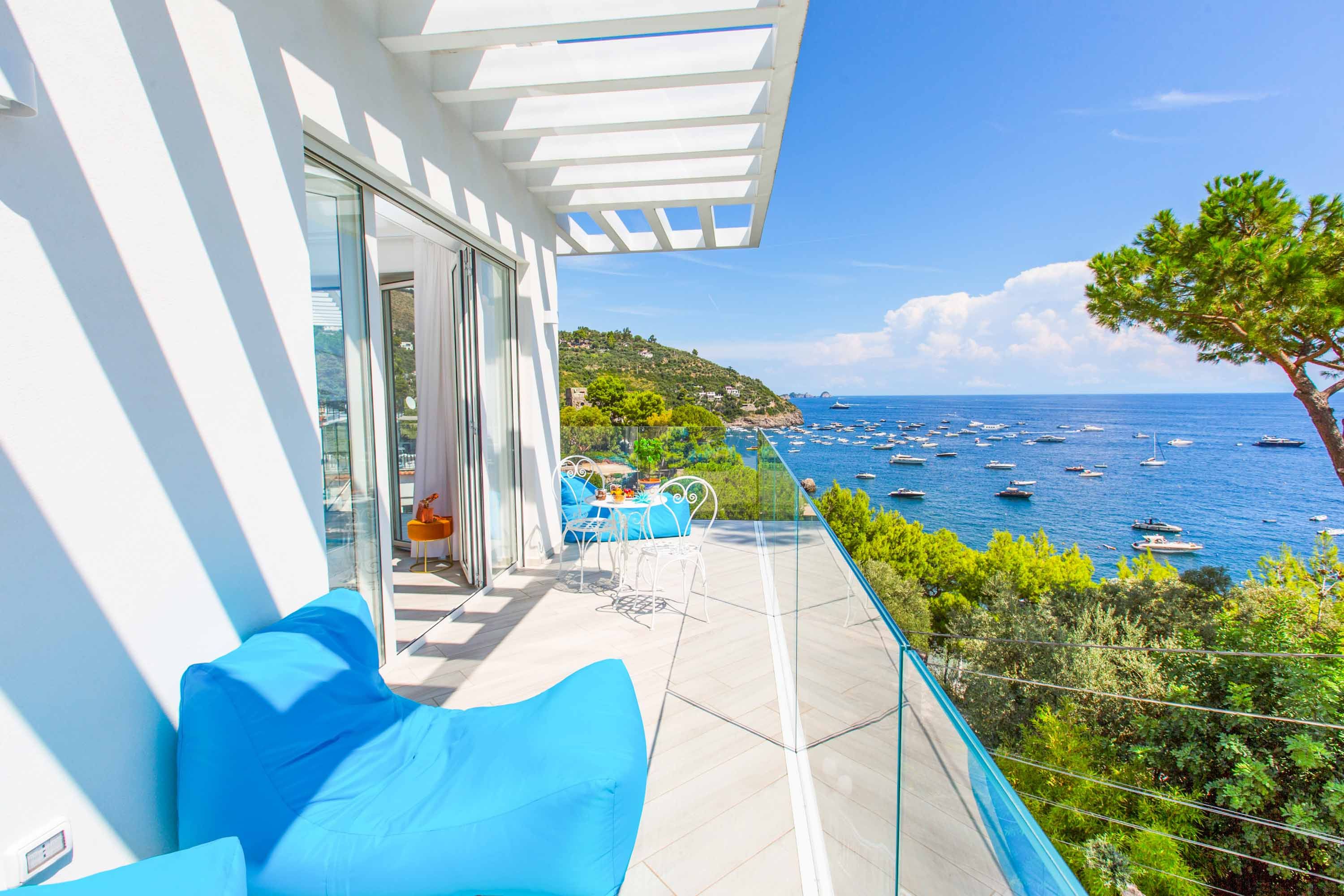 Just outside of the charming village of Nerano, this exquisite villa offers incredible views over the Tyrrhenian Sea. A stone’s throw from rows of authentic seafood restaurants and a pretty pebble beach, a great time can be had close to home, but we recommend renting a car so you can enjoy day drips to Massa Lubrenese and Sorrento. The villa itself boasts several terraces and balconies, so you can take in the mountainscapes from several spots, from the balcony to the luxurious Jacuzzi. There’s even an outdoor gym if you’re keen on keeping up the fitness routine, and a kidney-shaped pool in the garden.