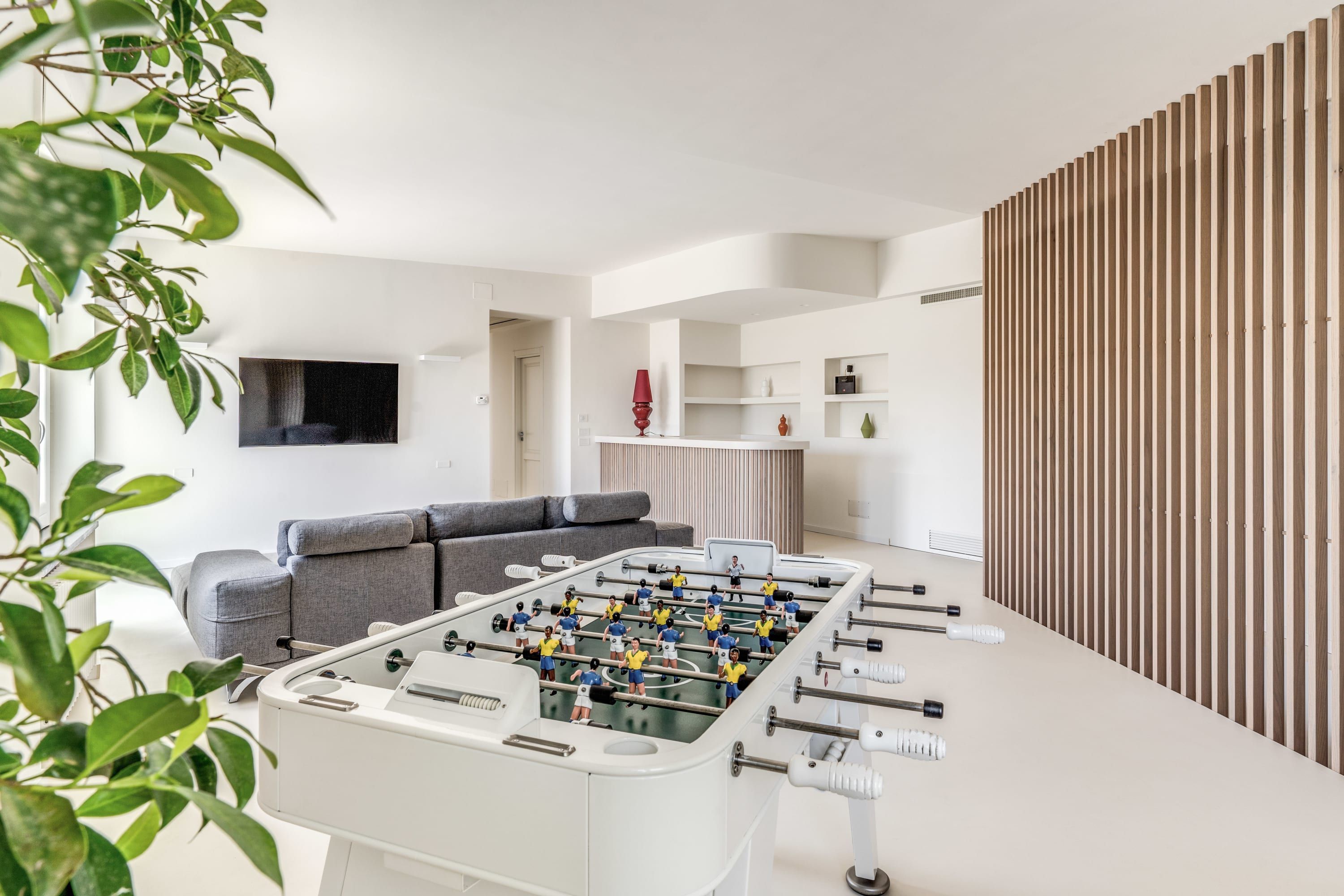 The villa is modern and stylish, with heaps of space. You can spend time together as a group, but also slip away for a quiet moment here. The home gym means you needn’t miss out on workouts, and the elegant spa-like bathtub means you can relax just as easily.