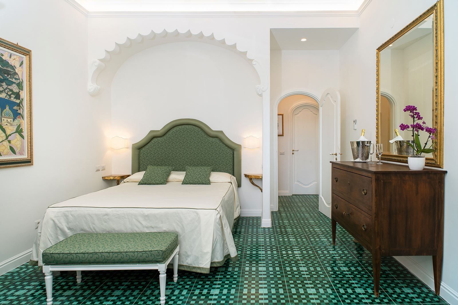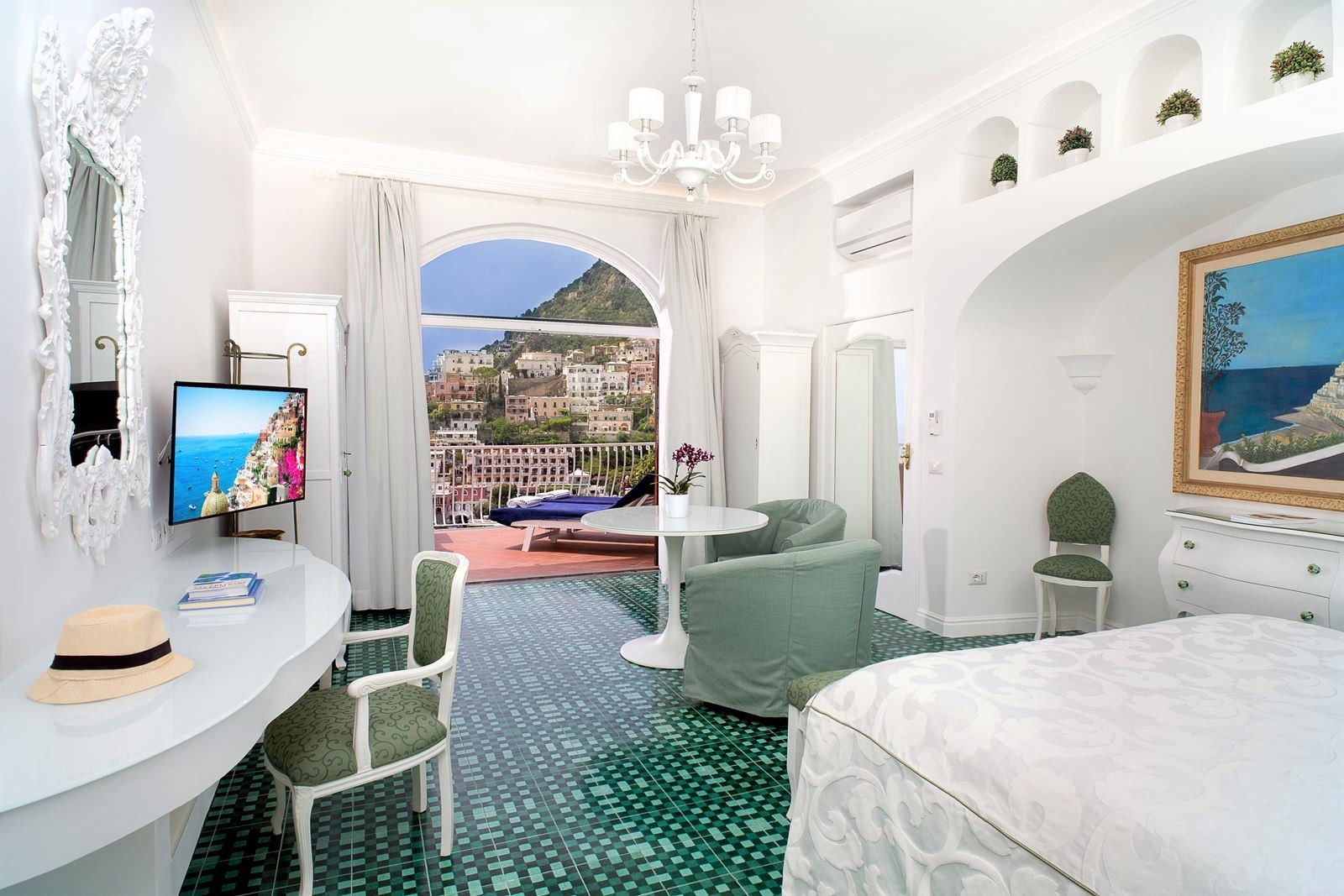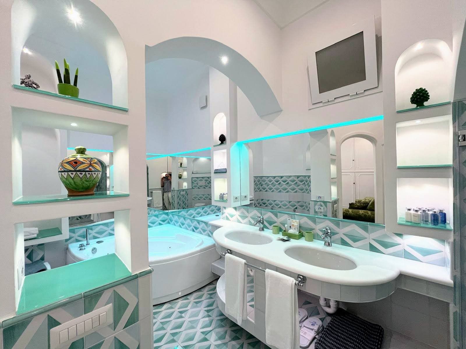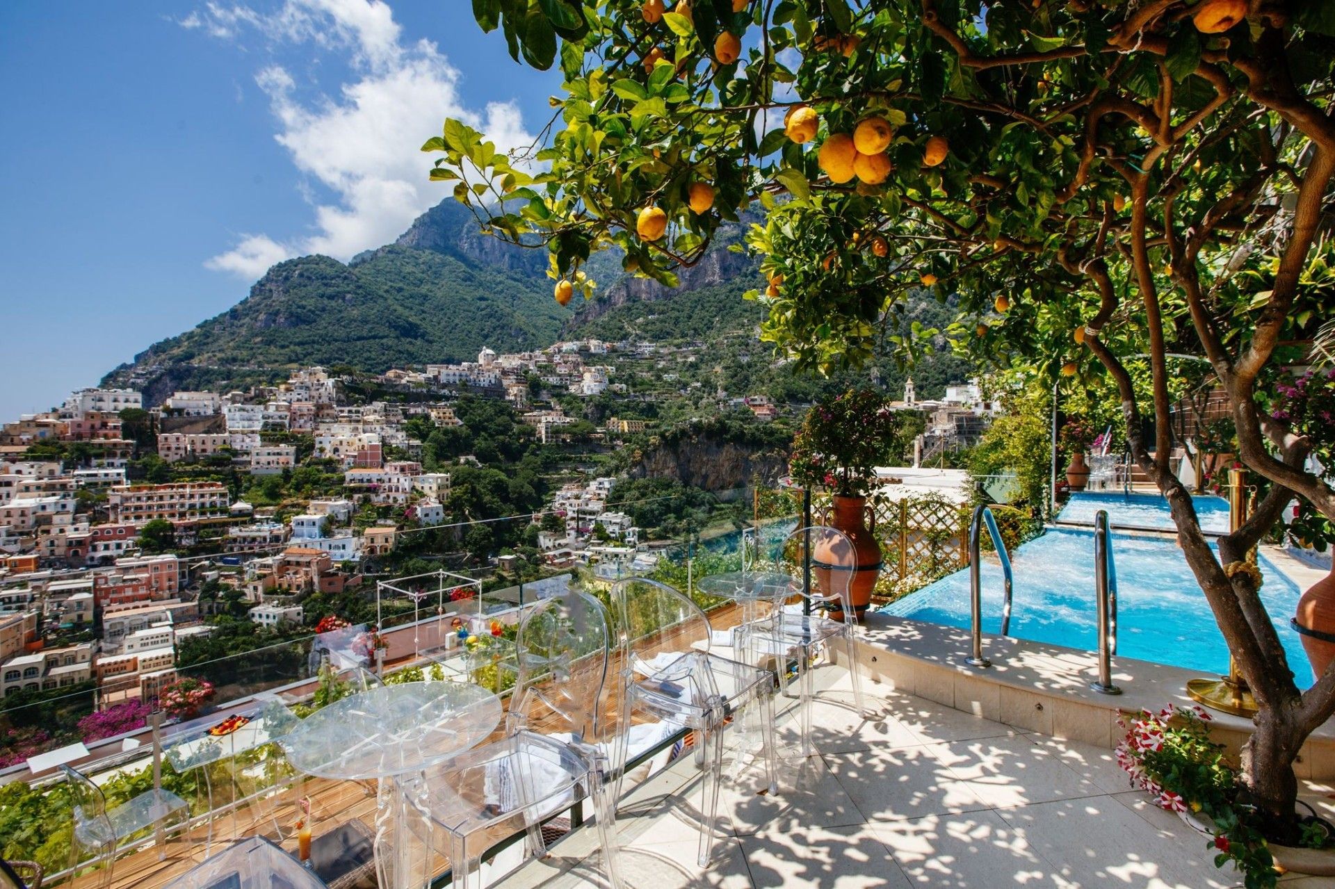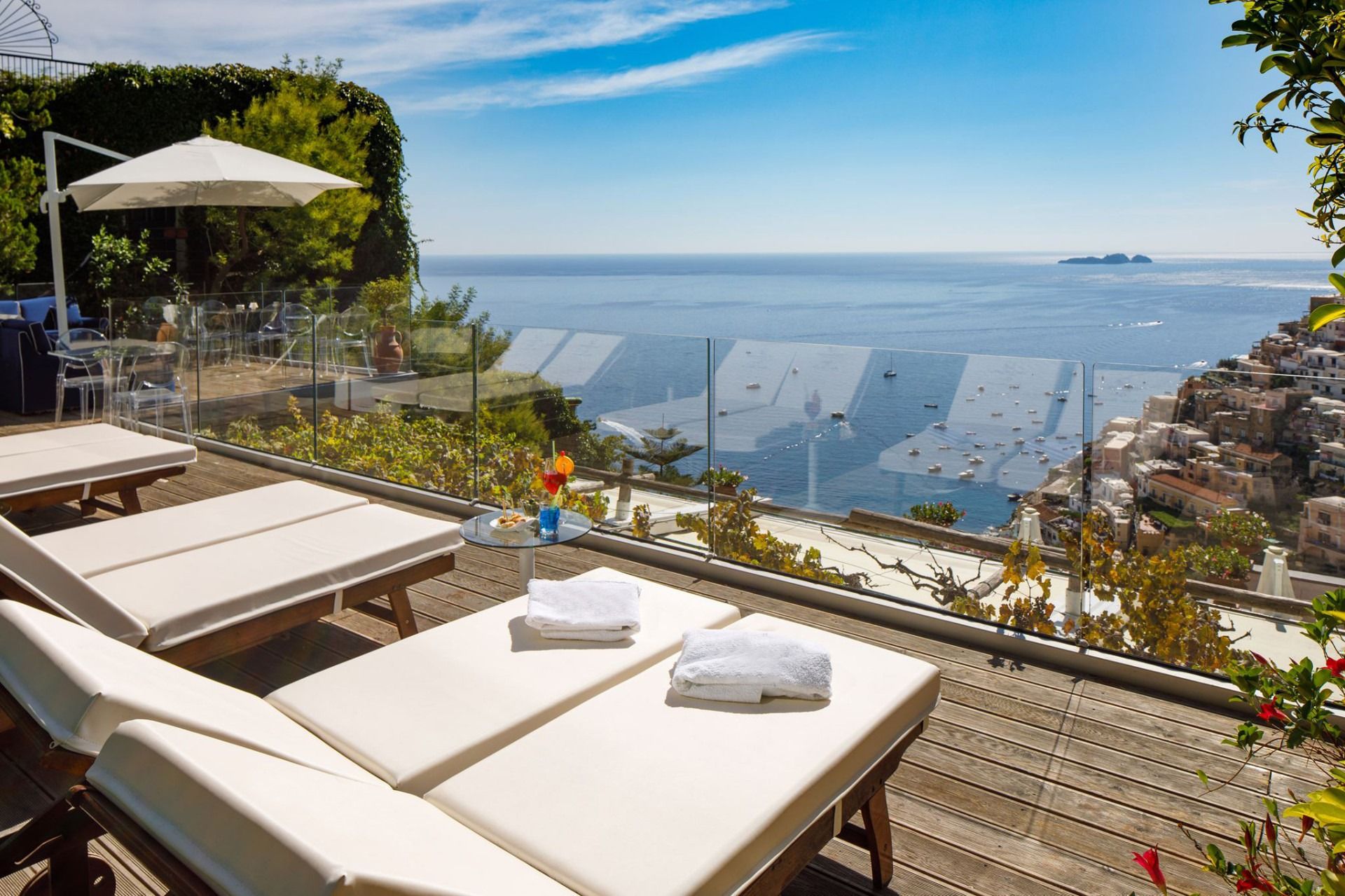 Perched high above the glittering coastline, this elegant Positano apartment offers breathtaking views of the Amalfi Coast and its iconic pastel houses. The private terrace is perfect for long breakfasts, included with your stay, and sunset aperitifs. Inside, sea-view bedrooms, a cosy living area, and a fully equipped kitchen create a welcoming space. The bathrooms feel like a private spa. One features a whirlpool tub and the other has a hydro-massage shower – perfect for unwinding after a day of exploring. Step out to the rooftop infinity pools and panoramic lounge, shared with other guests, for an unforgettable swim with the coastline as your backdrop. With the beach, boutiques, and trattorias just a five-minute stroll away, this is a rare blend of beauty, comfort, and quintessential Amalfi charm.