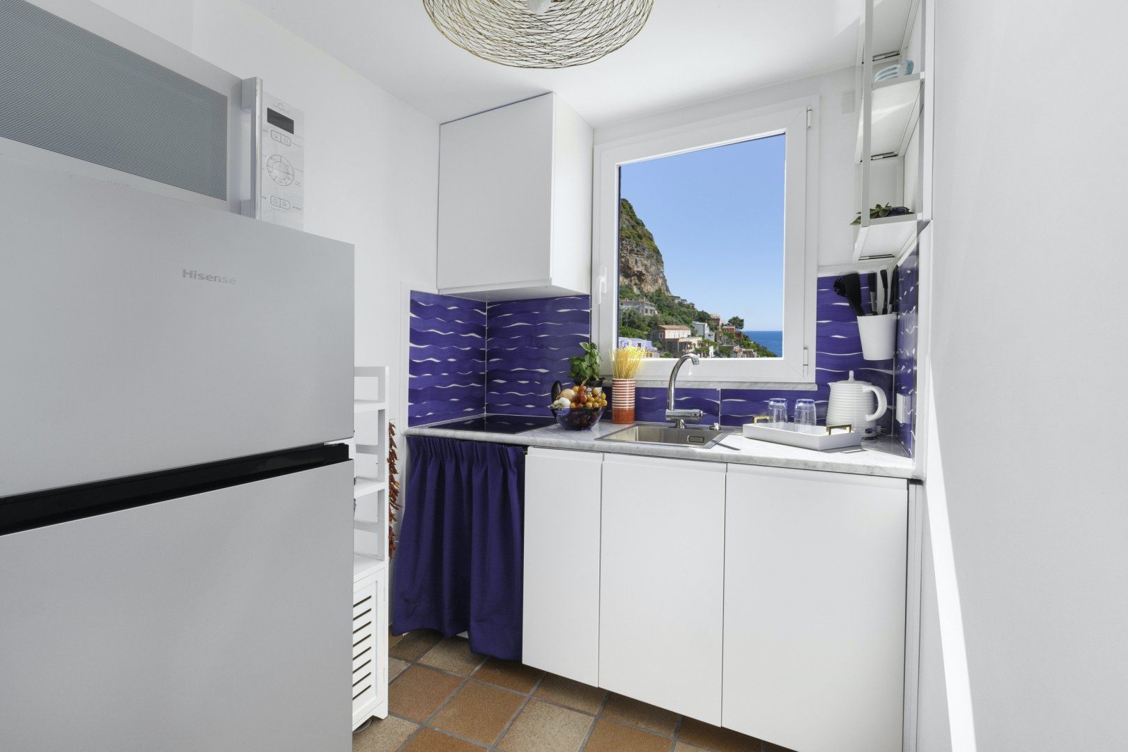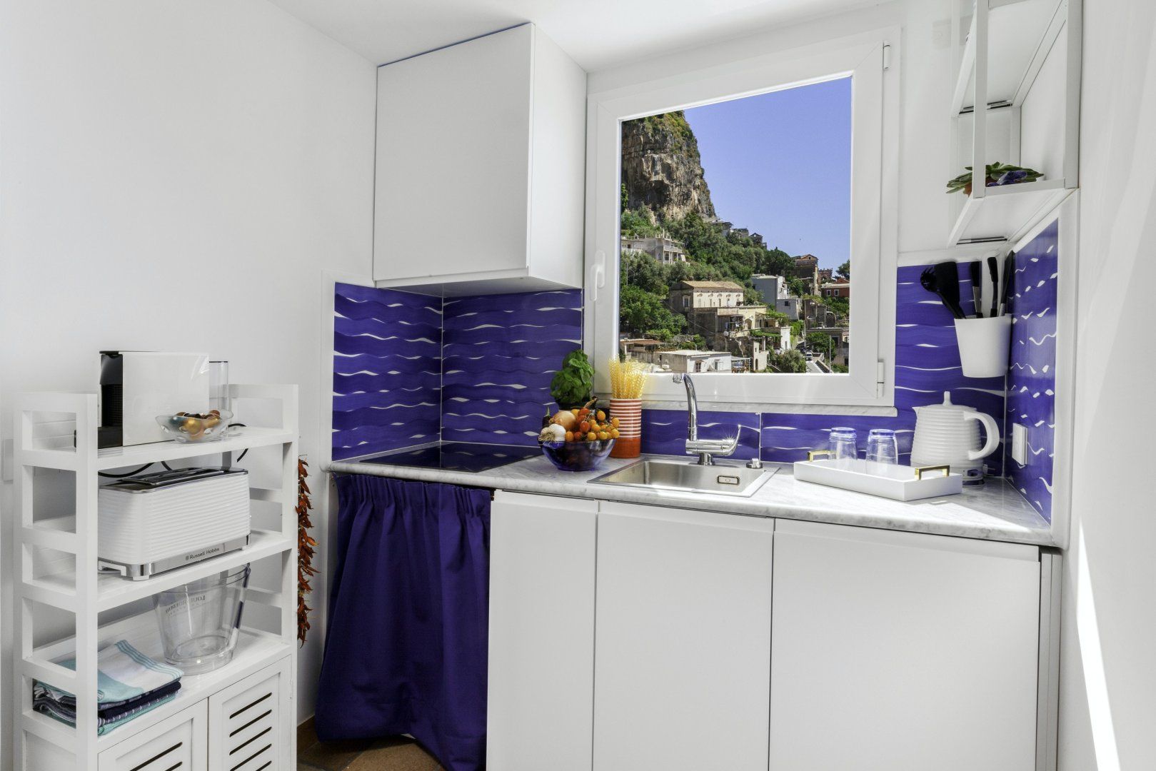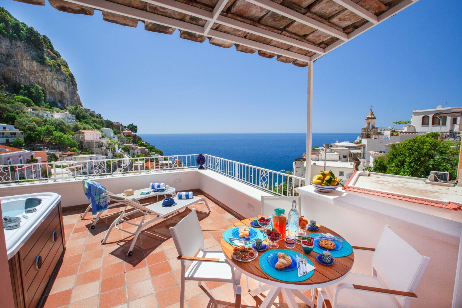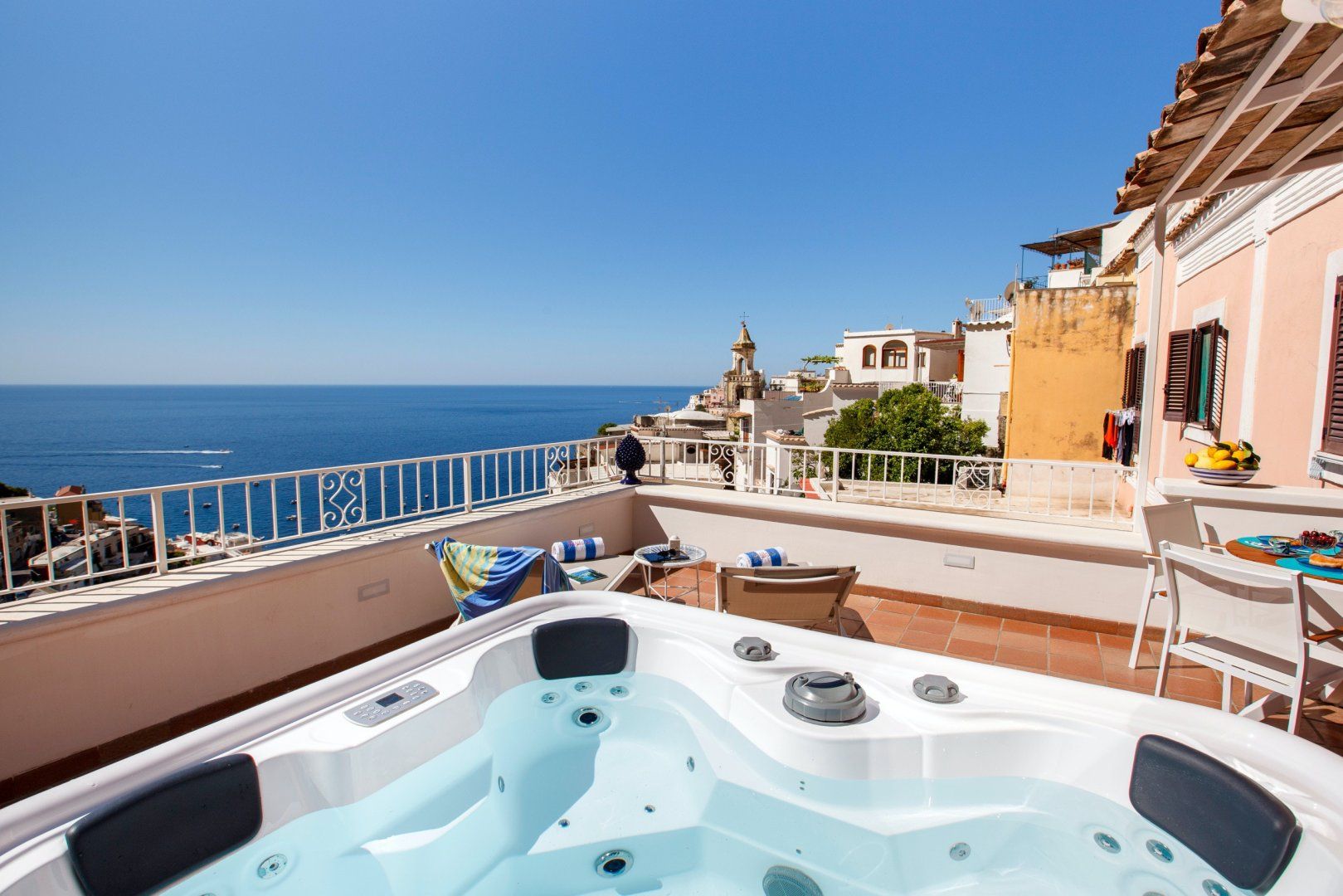 Come on into this coastal-coloured home, where the bold splashes of blue bring the waterside ambiance indoors. Wander into the kitchen and prepare an Italian breakfast, then plan out your itinerary at this intimate dining table for two. If you want to feel that sea breeze in the morning, simply walk out on your sun-soaked terrace and enjoy the bird's eye view. We think that this is the perfect spot for unwinding in the hot tub after sightseeing, and watching a romantic sunset with your partner as you sample some local limoncello.