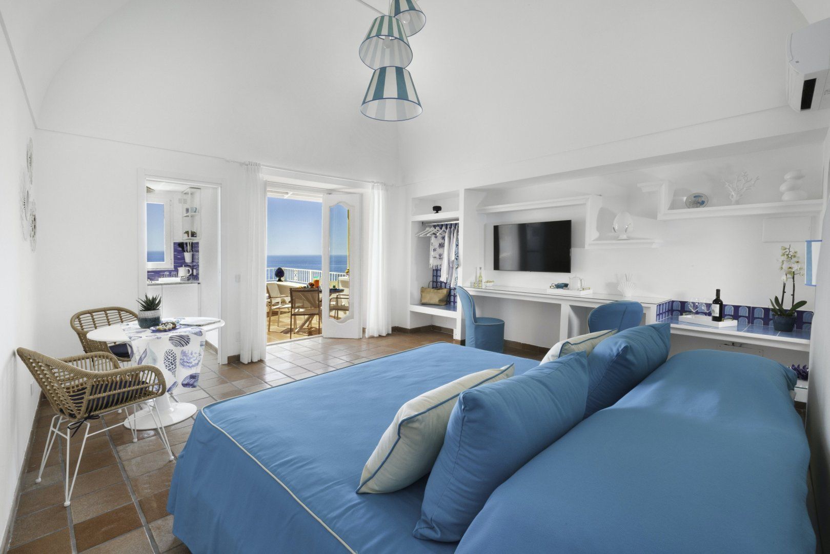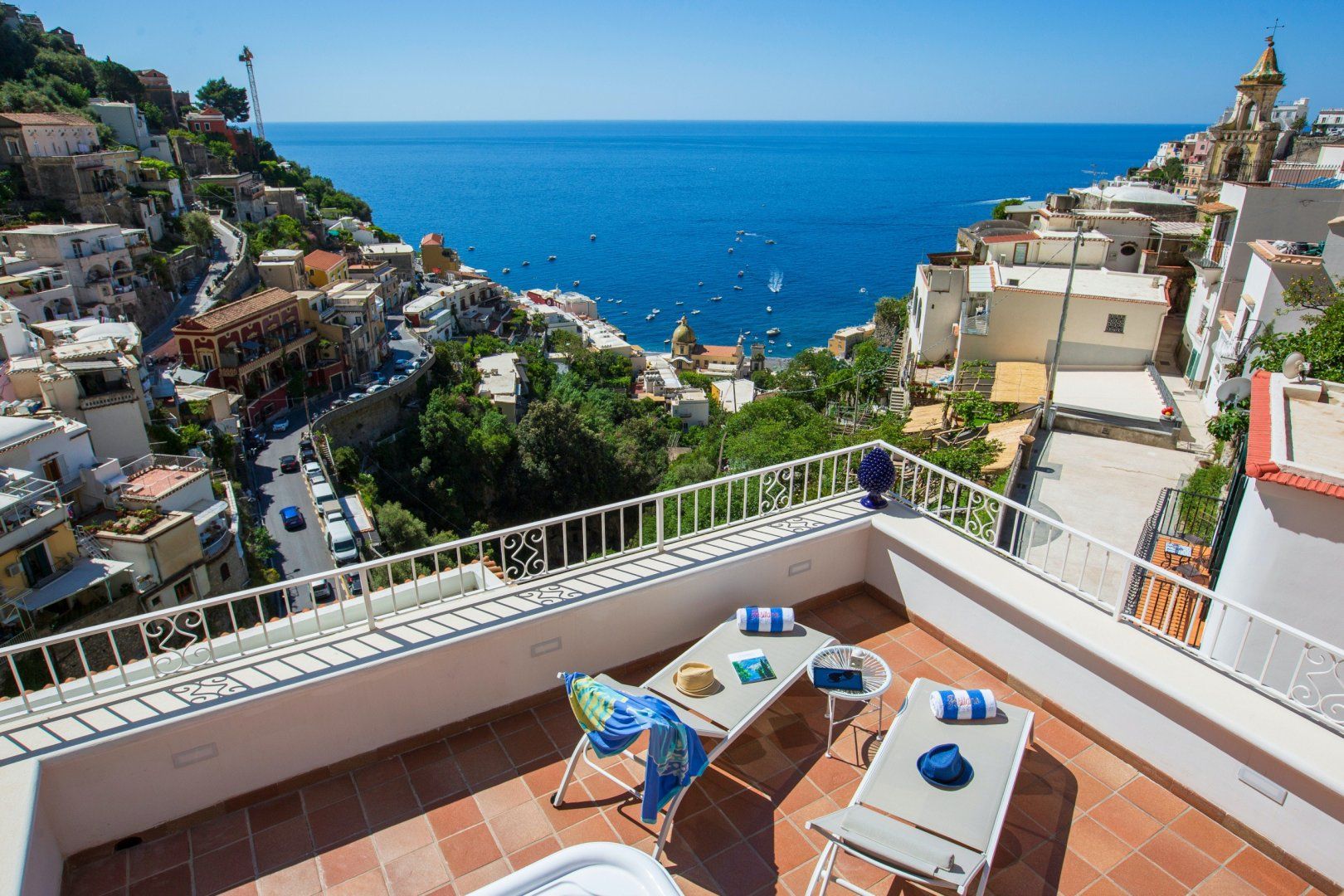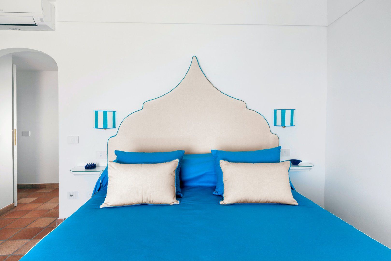 Come on into this coastal-coloured home, where the bold splashes of blue bring the waterside ambiance indoors. Wander into the kitchen and prepare an Italian breakfast, then plan out your itinerary at this intimate dining table for two. If you want to feel that sea breeze in the morning, simply walk out on your sun-soaked terrace and enjoy the bird's eye view. We think that this is the perfect spot for unwinding in the hot tub after sightseeing, and watching a romantic sunset with your partner as you sample some local limoncello.