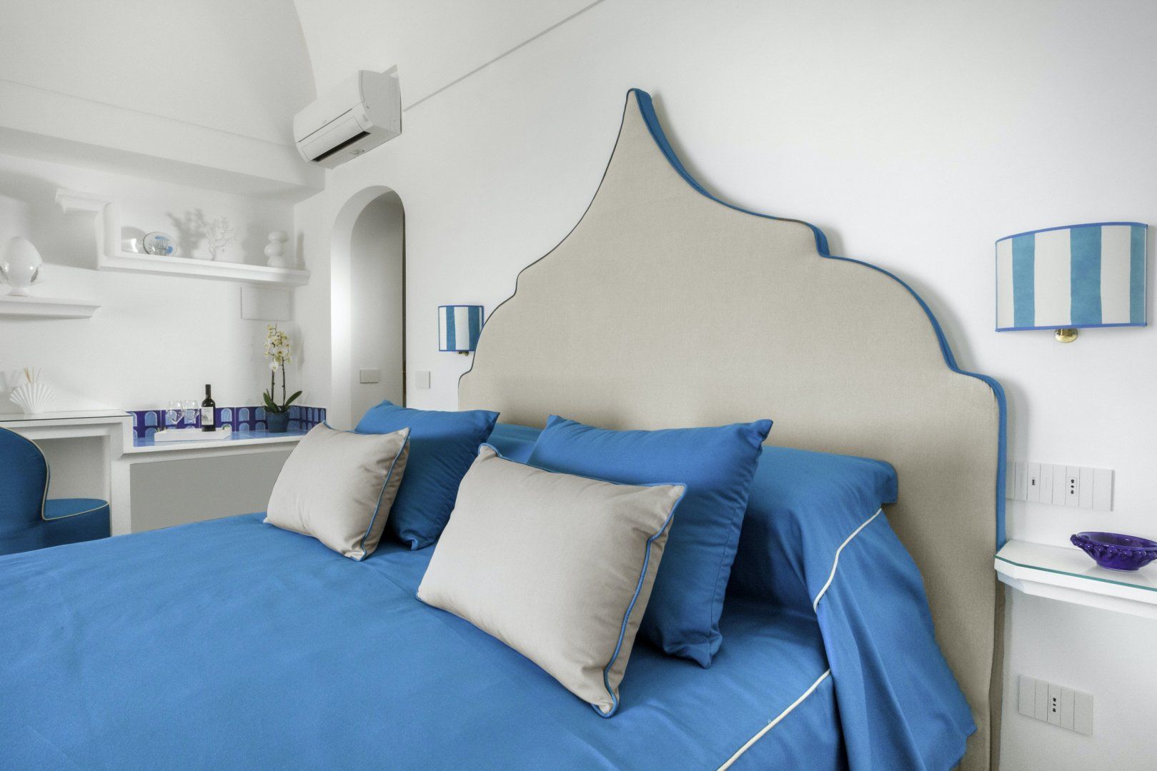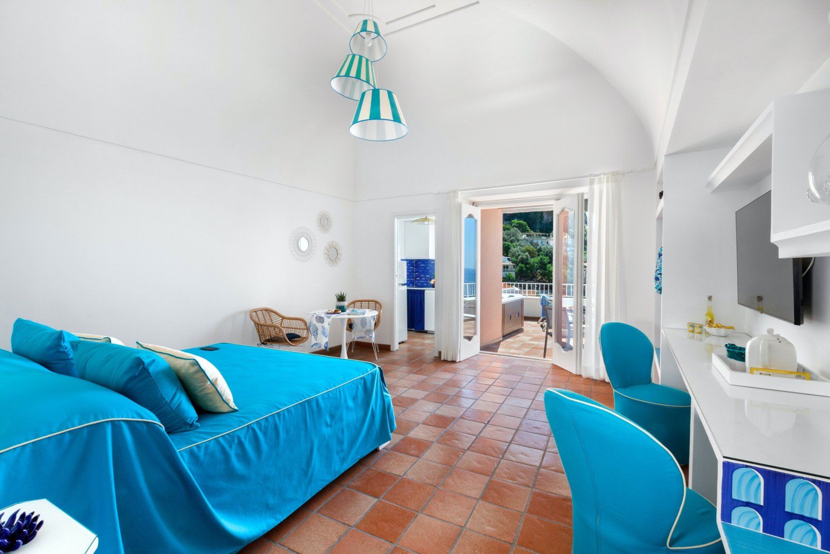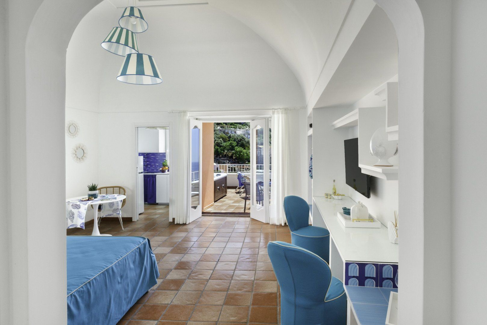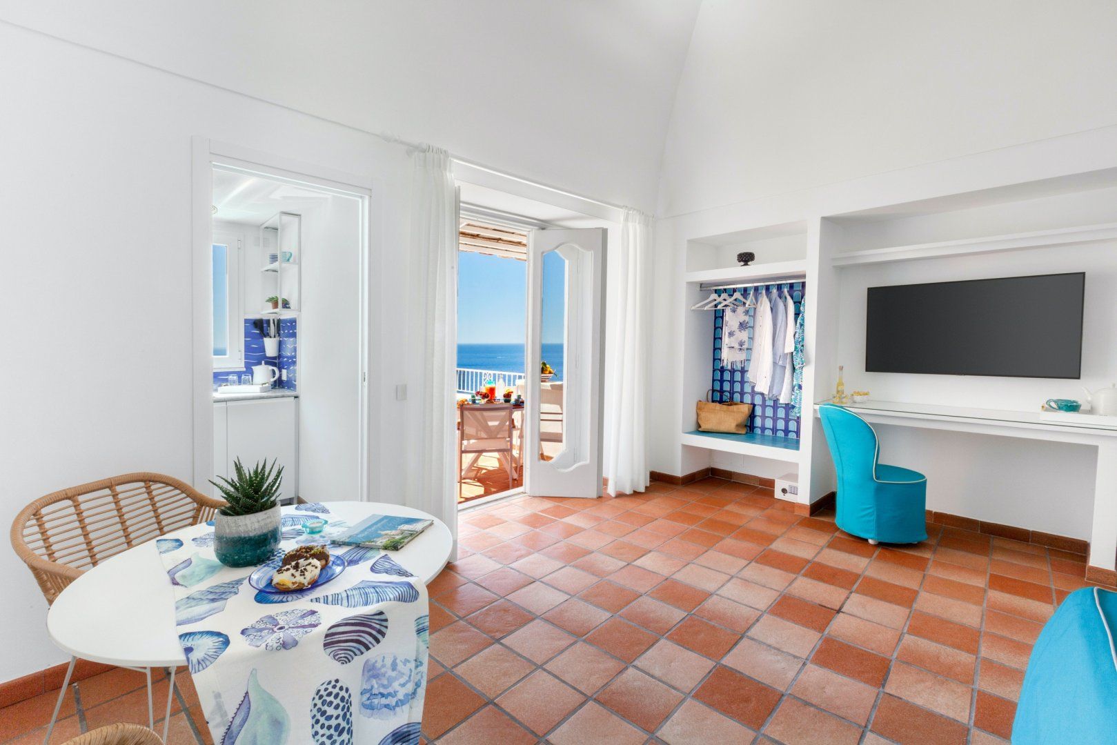 Come on into this coastal-coloured home, where the bold splashes of blue bring the waterside ambiance indoors. Wander into the kitchen and prepare an Italian breakfast, then plan out your itinerary at this intimate dining table for two. If you want to feel that sea breeze in the morning, simply walk out on your sun-soaked terrace and enjoy the bird's eye view. We think that this is the perfect spot for unwinding in the hot tub after sightseeing, and watching a romantic sunset with your partner as you sample some local limoncello.