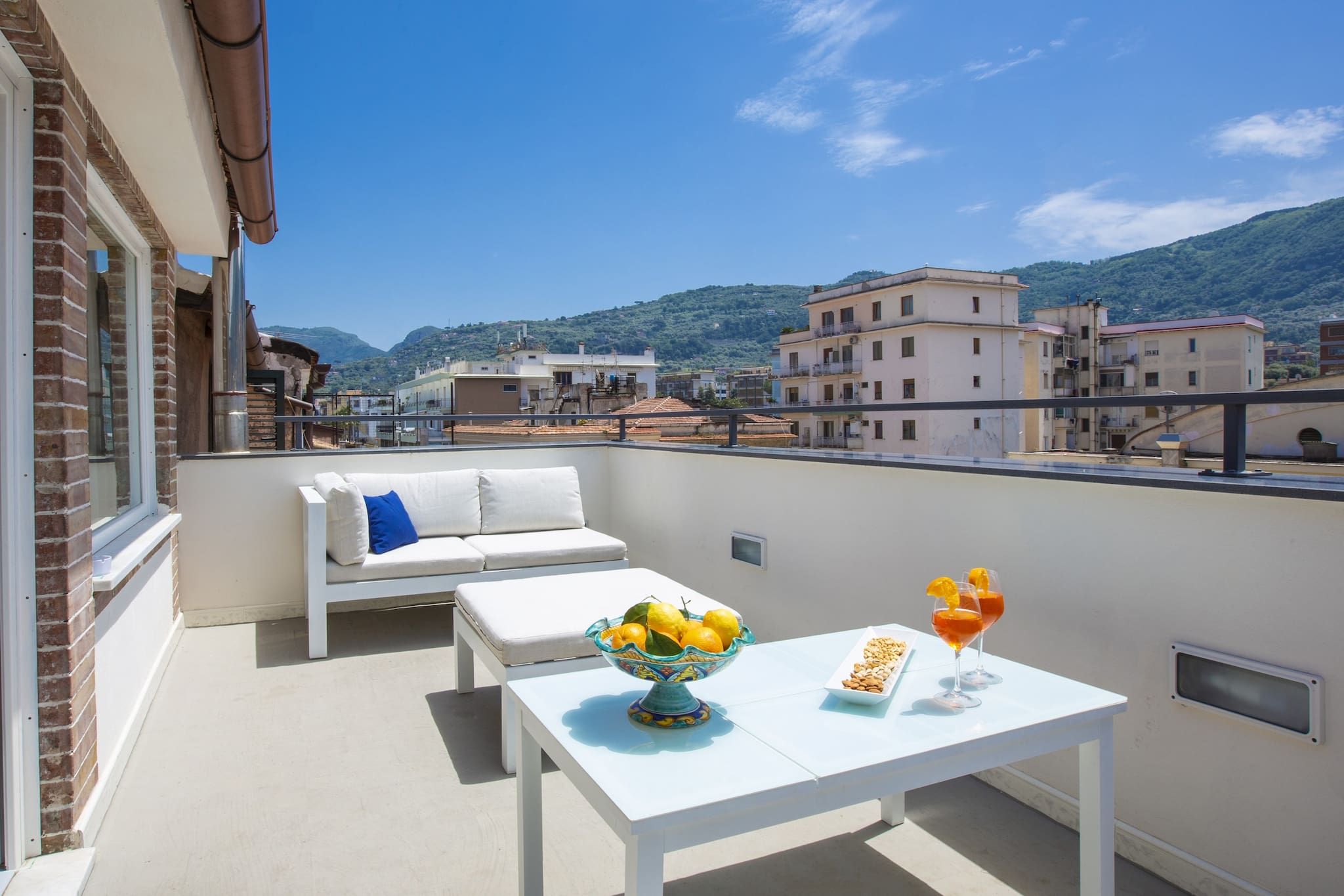 Keen to be in the heart of Sorrento? If yes, this studio apartment, perched above the bustling Corso Italia, may be the one for you. All you'll need is within walking distance here, be it beaches and bus stations or shops and restaurants. And if the location doesn't win you over, the two private outdoor spaces likely will. One is perfect for sunbathing and sundowners, while the second overlooking the street is ideal for people-watching. Inside, the open-plan layout won't suit everyone – nor will the compact kitchen – but we think it does the job just fine.
