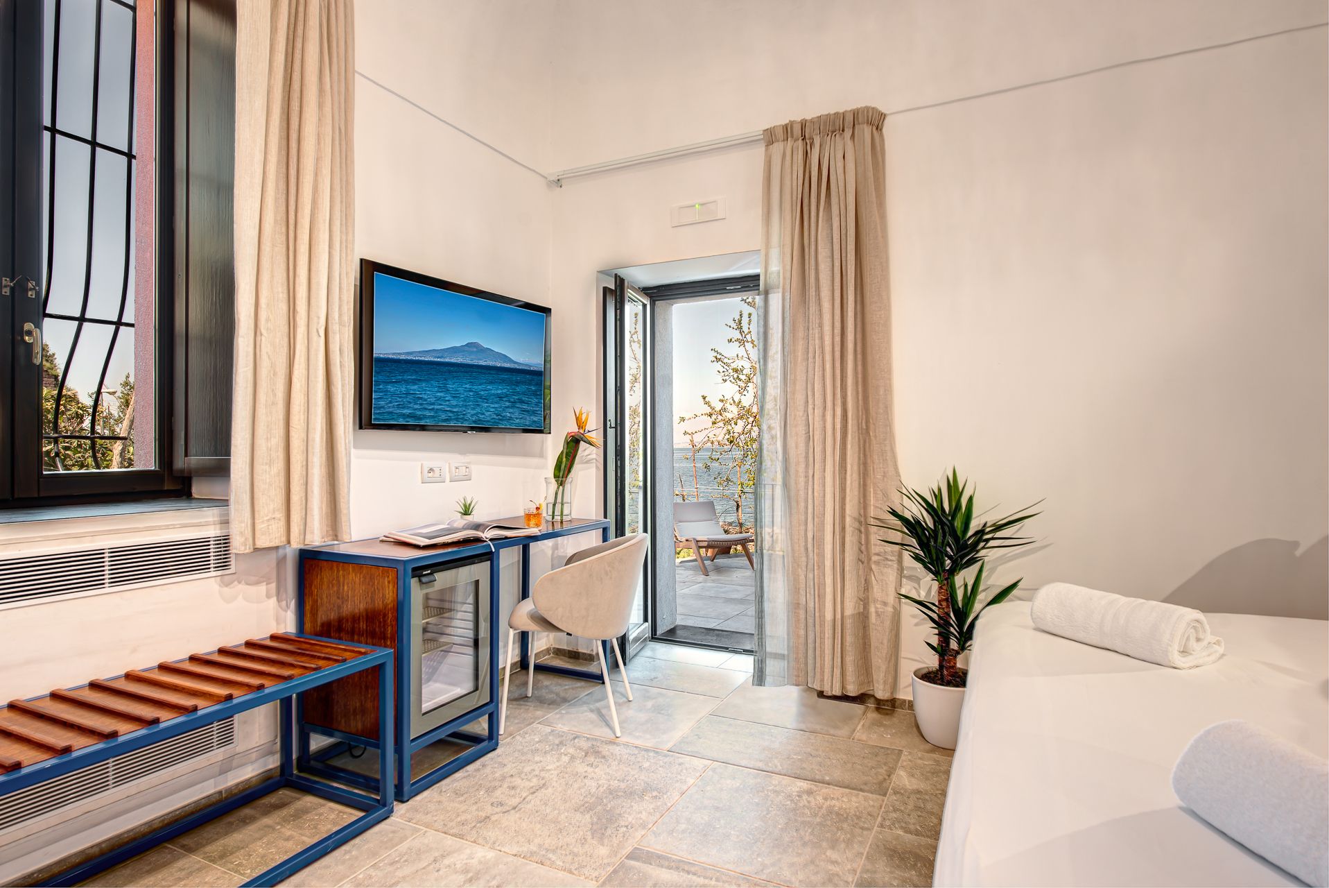 This collection of waterfront villas with views of the Gulf of Naples and Mount Vesuvius is the perfect retreat for families and large groups. Made up of four villas with King rooms, kitchenettes, and private terraces, each group has everything they need. There's a private outdoor pool, terraces with sun loungers and outdoor dining areas, and hot tubs – all overlooking the breathtaking views. Stepping out of the complex, the beach is a three-minute walk away, and there's a great mix of authentic restaurants and bars in Seiano. For a day out, you can drive to Sorrento in thirty minutes, or Naples in under an hour. For a truly relaxing and sociable stay, this is the spot.