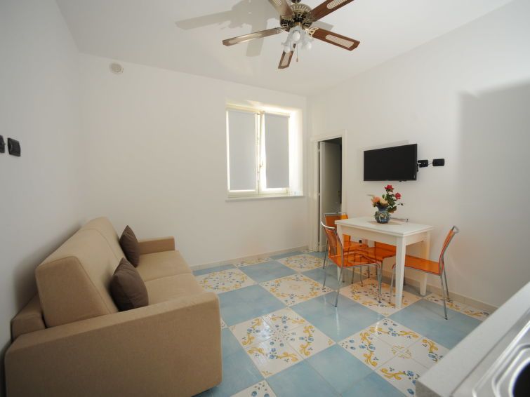 "Mimì", 2-room apartment 60 m2 on 1st floor. Practical and cosy furnishings: living/sleeping room with 1 double sofabed, dining table and TV (flat screen). 1 double bedroom. Kitchenette (2 hot plates, microwave). Shower/bidet/WC. Heating (extra). Facilities: washing machine. Parking space n 1 (extra) at the house.