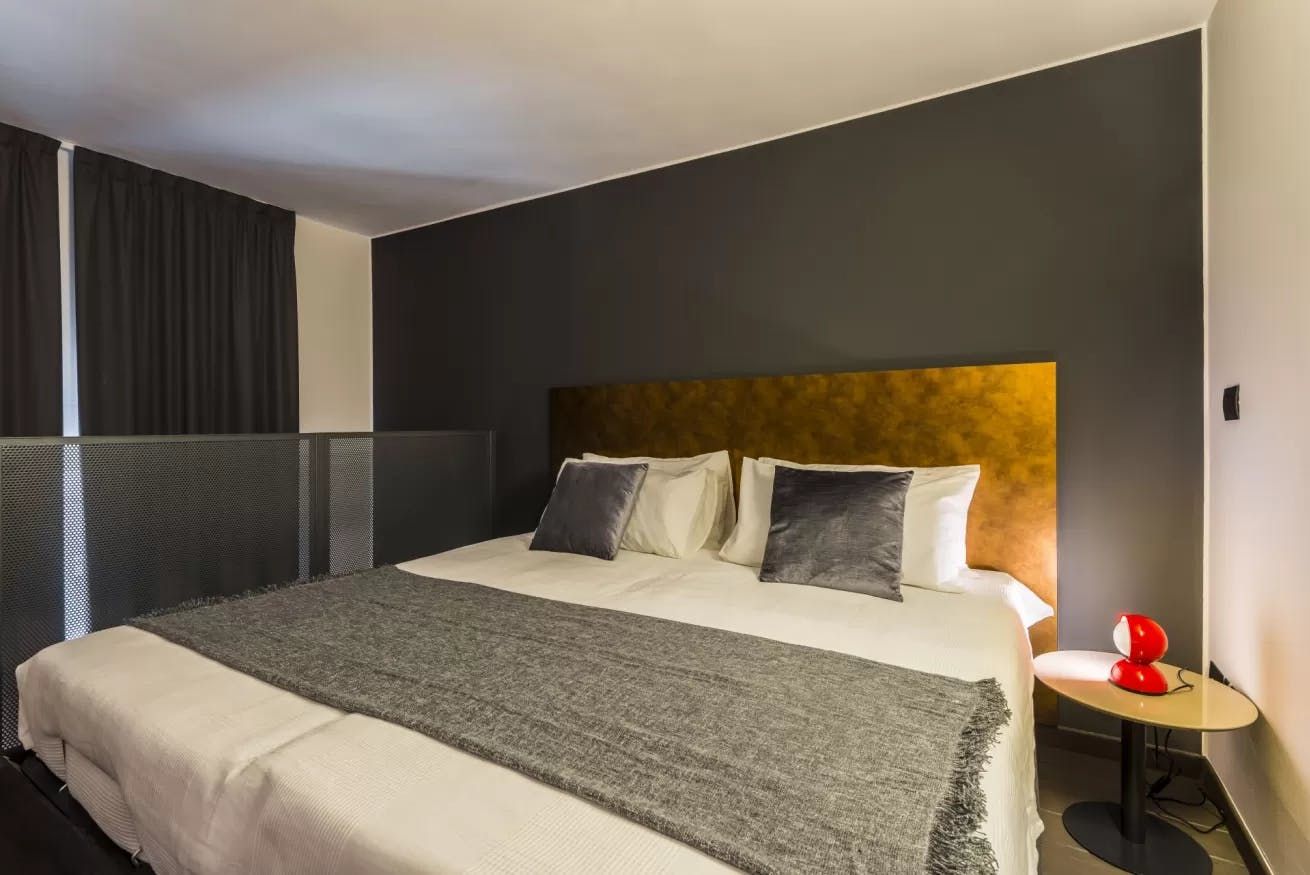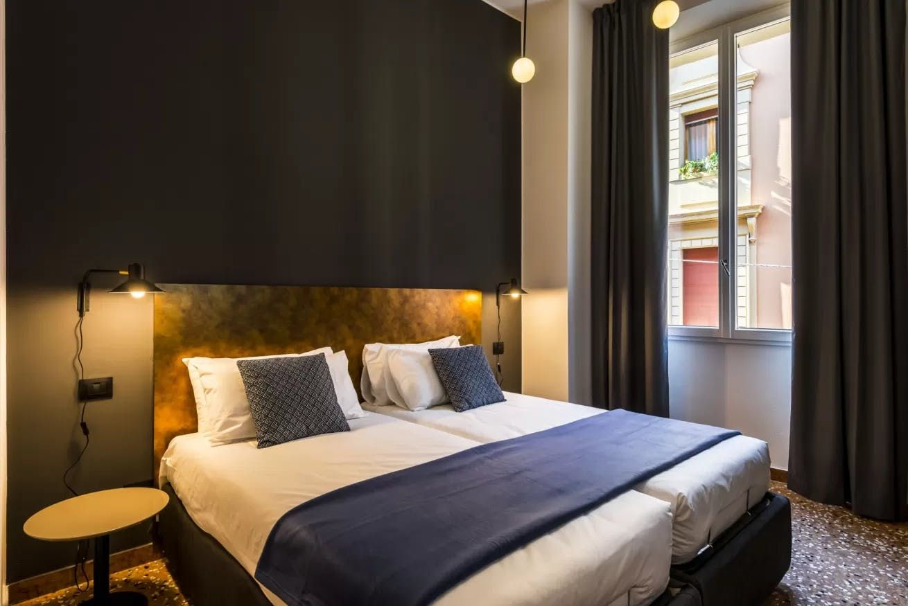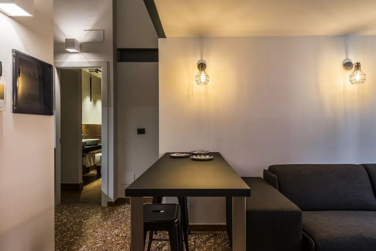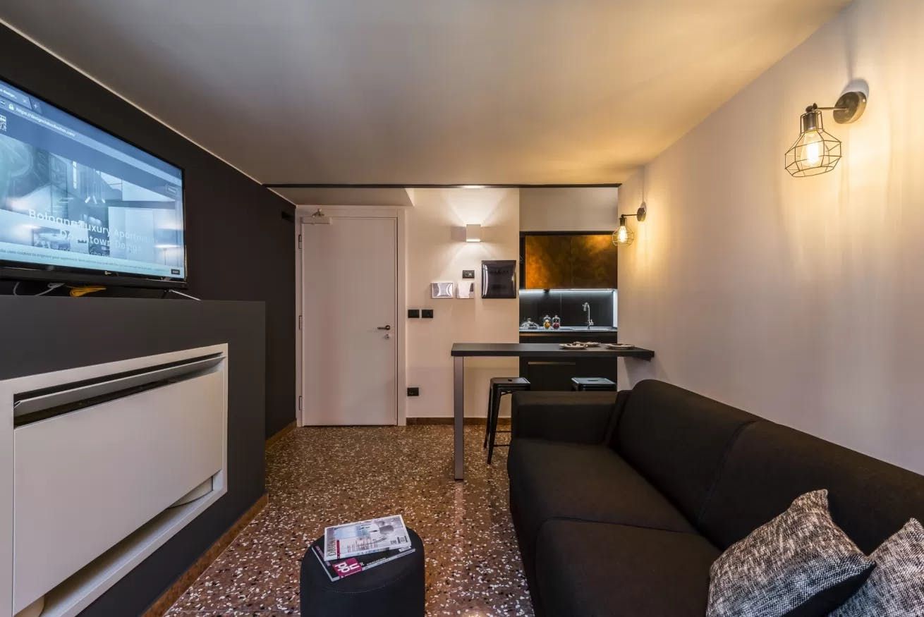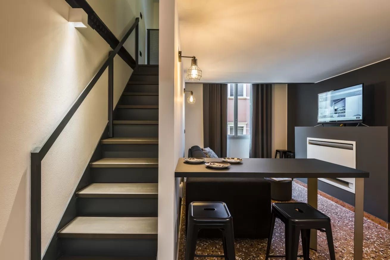 Once you’ve filled up on tortelloni and mortadella, head back to your quiet city bolthole to enjoy an espresso at the sleek breakfast bar. Slate-grey and ink-black dominate the decor, with industrial touches like cage lamps and silver cogs on display. Though your apartment is a sleek world of modern monochrome, you just have to glance out the bedroom windows to remind yourself you’re ensconced in a rose-hued medieval old town.