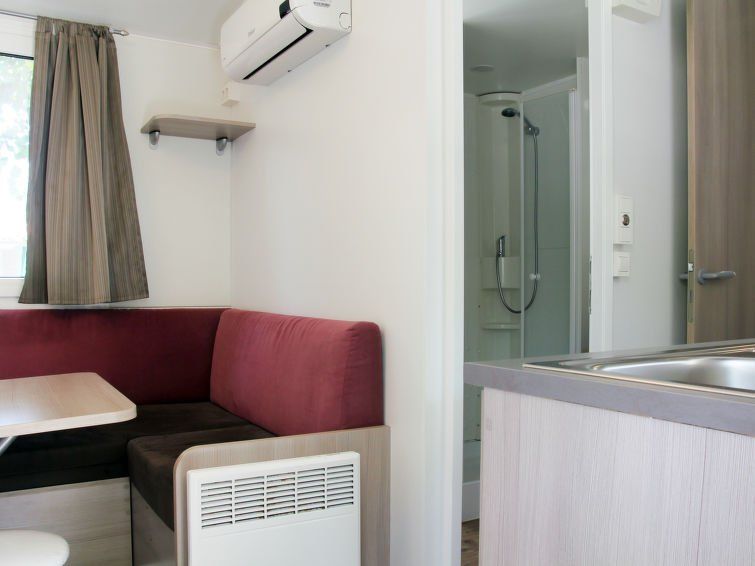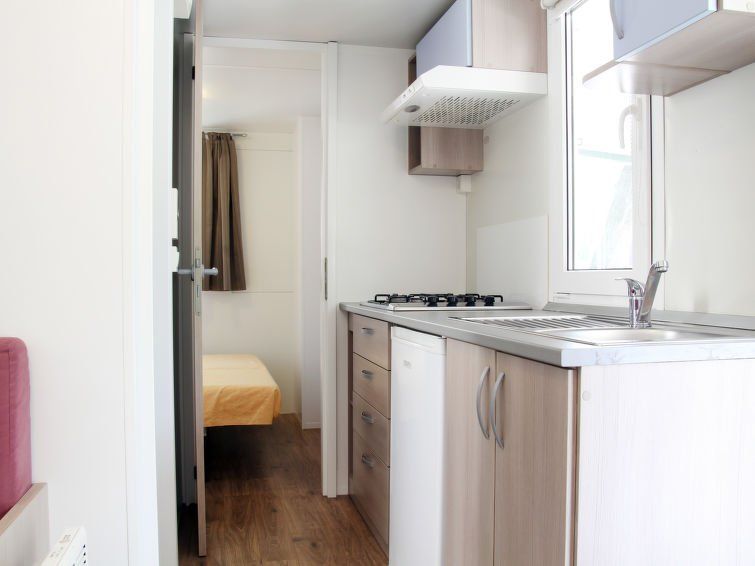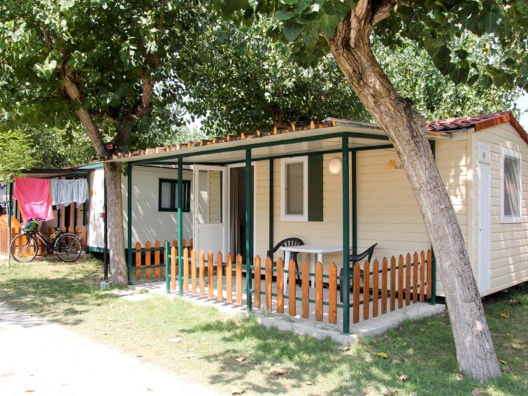"Mobilhome Adria", 2-room mobile home 15 m2. Practical furnishings: small living/dining room with dining nook, satellite TV, air conditioning and forced-air heating. 1 small room with 1 french bed (140 cm). Small, open kitchen (4 gas rings). Shower/WC. Terrace 12 m2, roofed. Terrace furniture.
