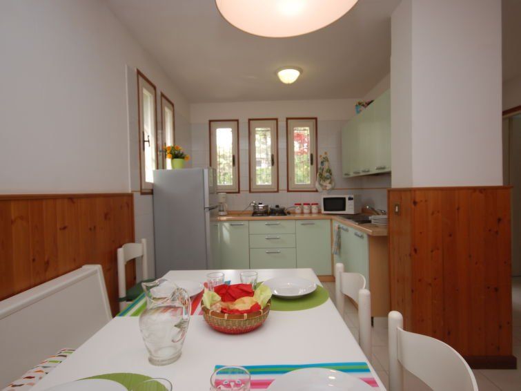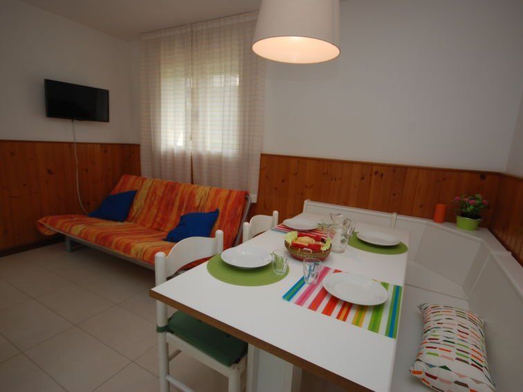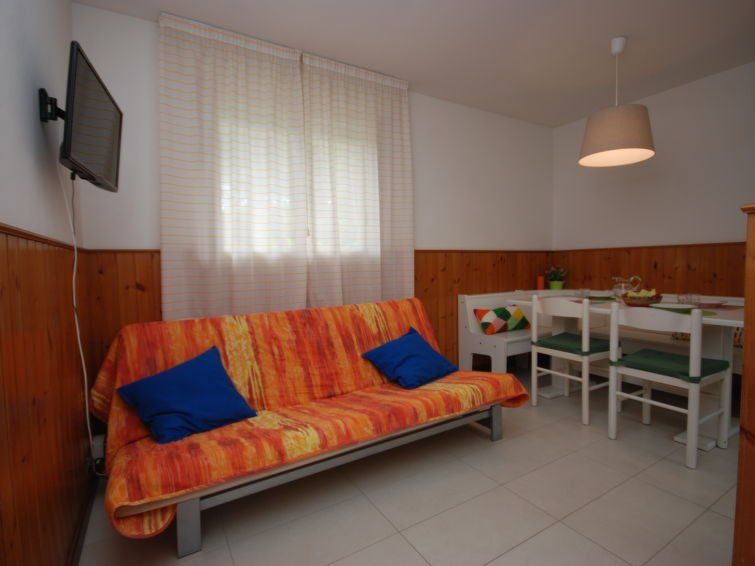 3-room apartment 55 m2 on 2 levels, on the ground floor. Practical furnishings: living/sleeping room with 1 double sofabed, dining table and satellite TV. Exit to the patio. 1 double bedroom. 1 room with 3 beds. Kitchenette (1 hot plate, oven, Gas stove, 3 gas rings, microwave, freezer, electric coffee machine).
