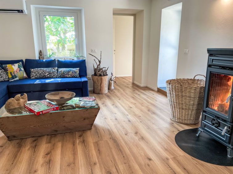 4-room house 98 m2 on 2 levels. Rustic and cosy furnishings: living/sleeping room with 1 sofabed, dining table and digital TV. Exit to the garden. 1 double bedroom. (oven, dishwasher, 4 induction hot plates, toaster, kettle, freezer, electric coffee machine) with wood-burning stove.