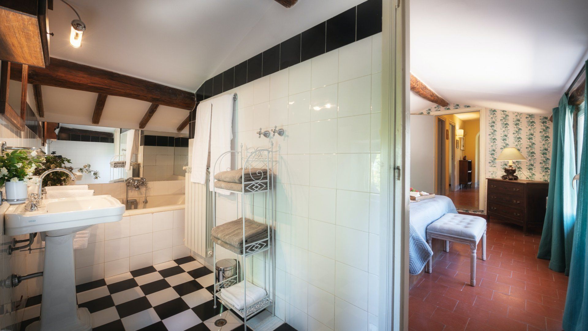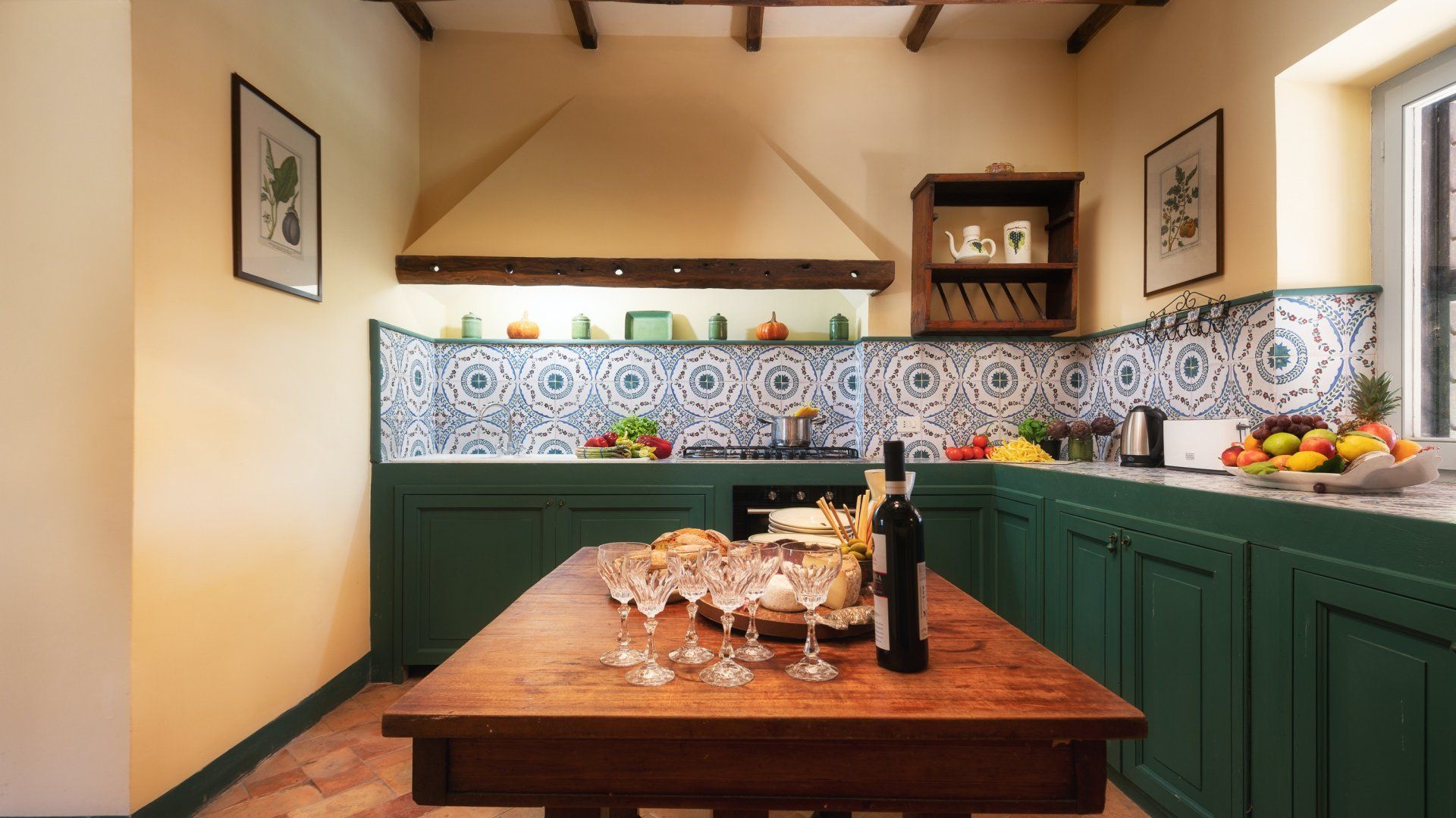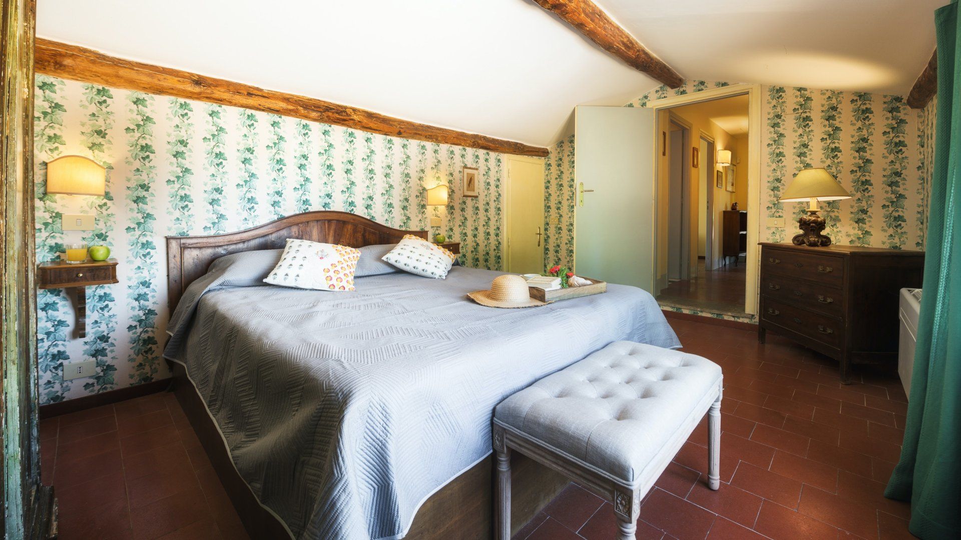 Inside, the home embodies the quintessential Italian country home dressed with exposed chestnut-wooden beams, stone walls, terracotta flooring, furnishings, and upholstery in warm colours. You'll find the annexe just twenty metres from the main house, boasting its own living room, kitchenette and bedroom-bathroom suite – the ideal set-up for grandparents joining you on a family getaway or those travelling with a nanny.