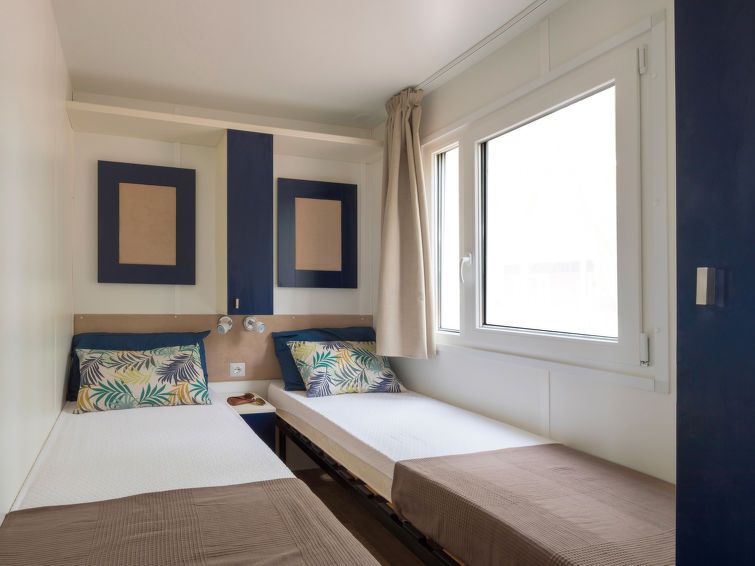 "Elite", 4-room mobile home 33 m2. Modern furnishings: living/dining room with dining table and digital TV. 1 room with 1 french bed (140 cm). 2 rooms, each room with 2 beds (70 cm). Kitchenette (4 gas rings, freezer). Shower/WC, sep. WC. Air-conditioning, forced-air heating. Terrace partly roofed.