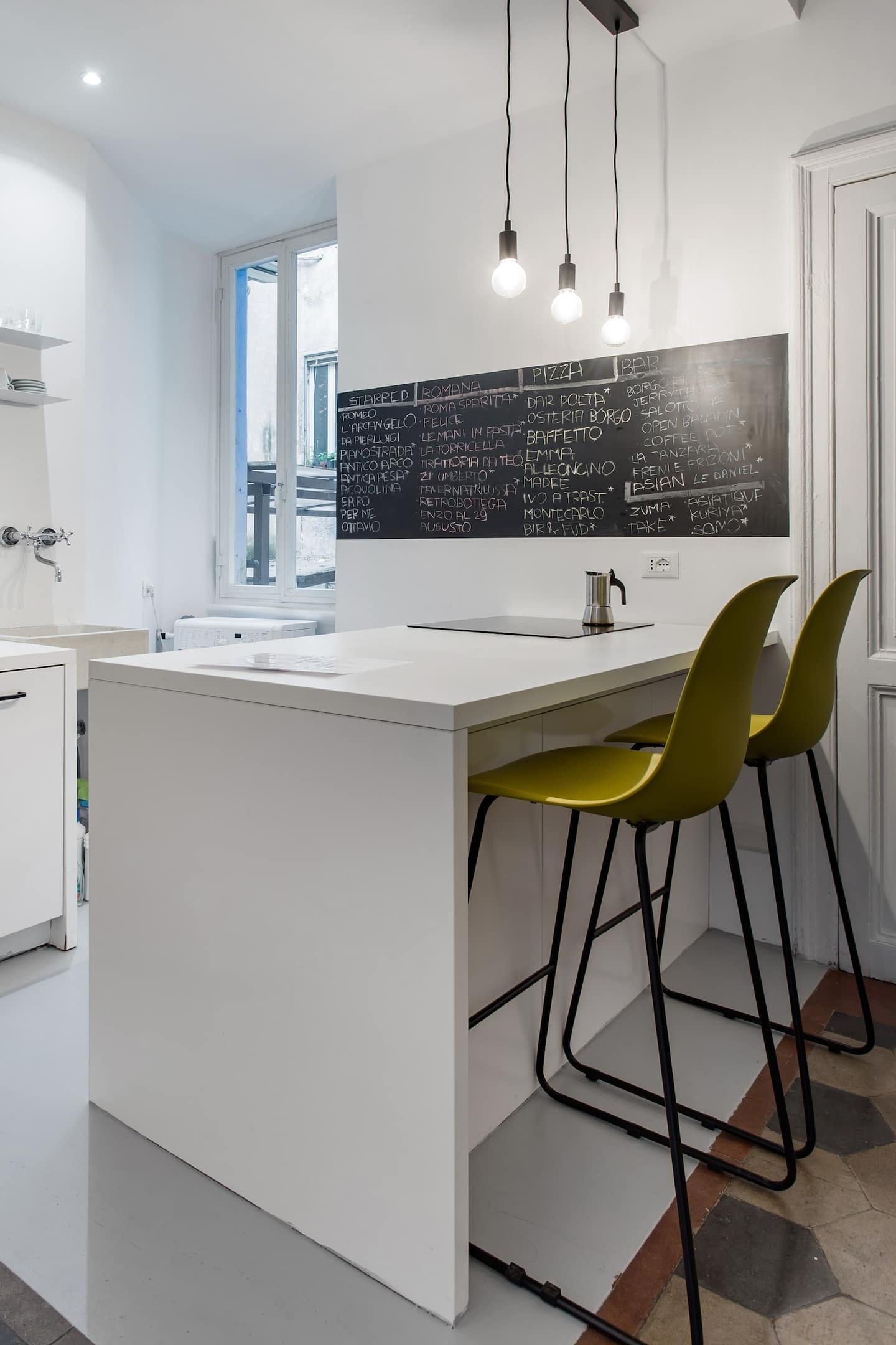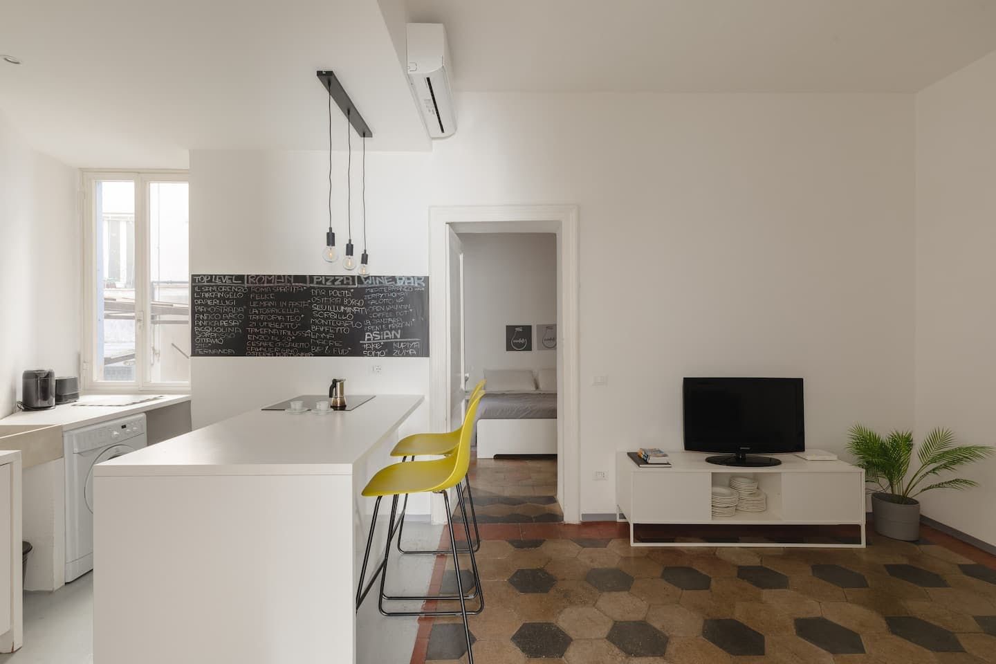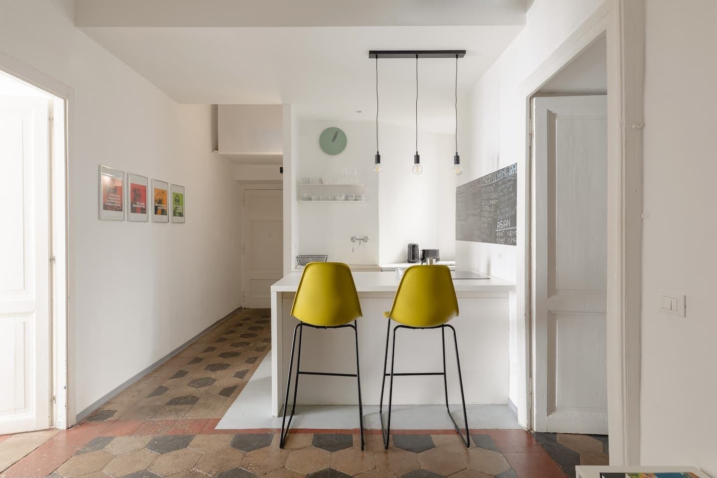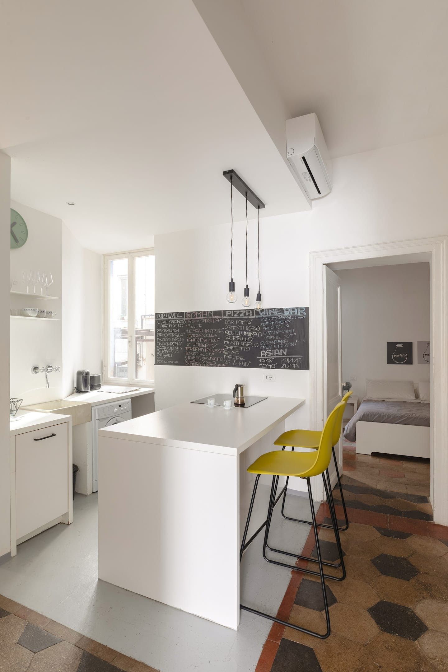 Against an effortlessly cool backdrop of stark white walls and tiled flooring, much of the interior design embraces industrial-chic trends, from the bare lightbulbs hanging from the ceiling and the chalkboard on the kitchen wall to the bright yellow stools at the kitchen surface. We're also big fans of the Basquiat artworks and the sleek bathroom.