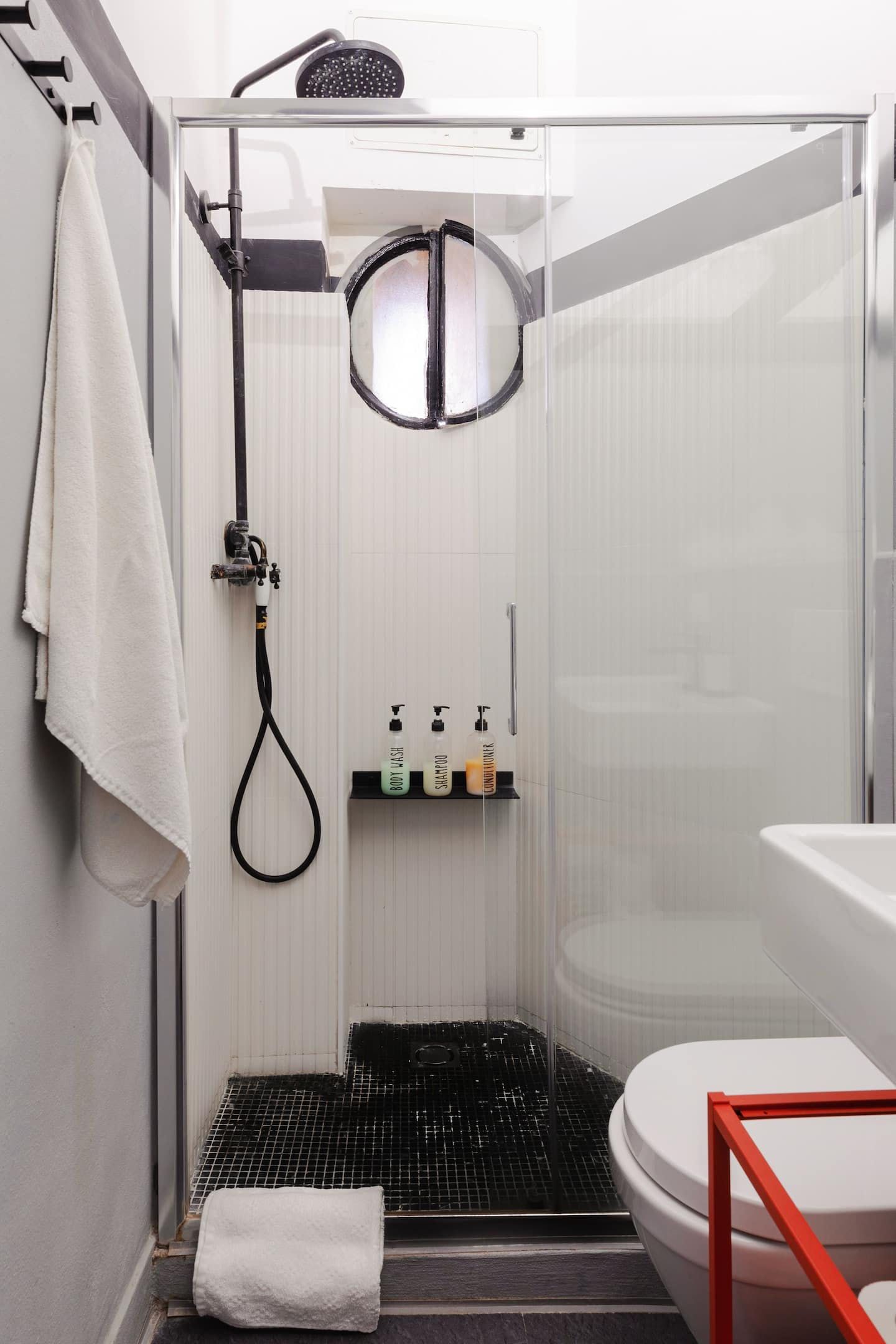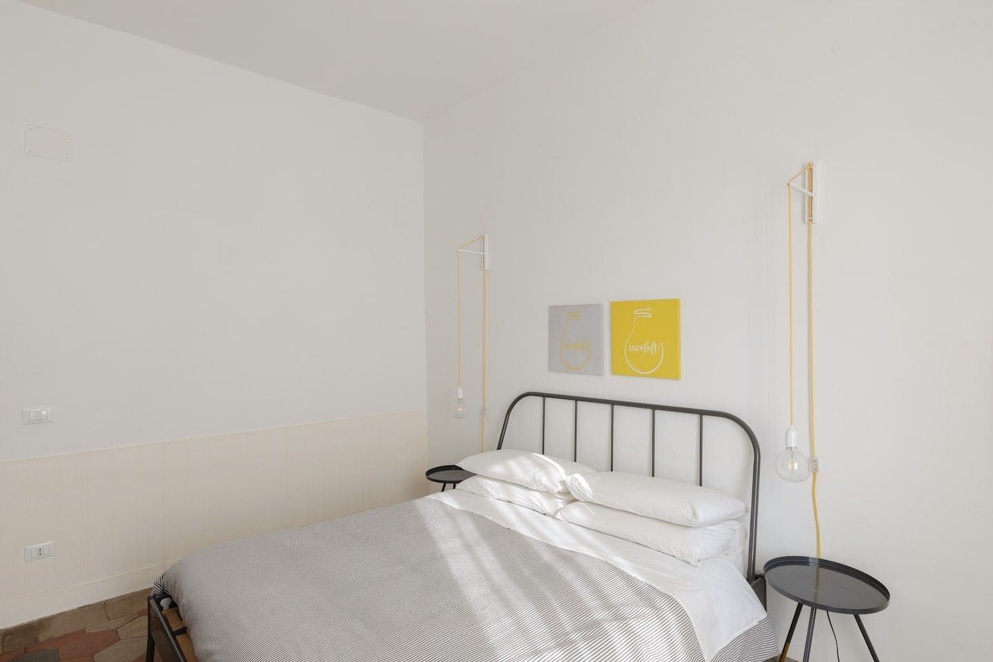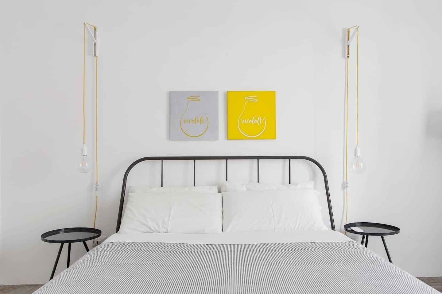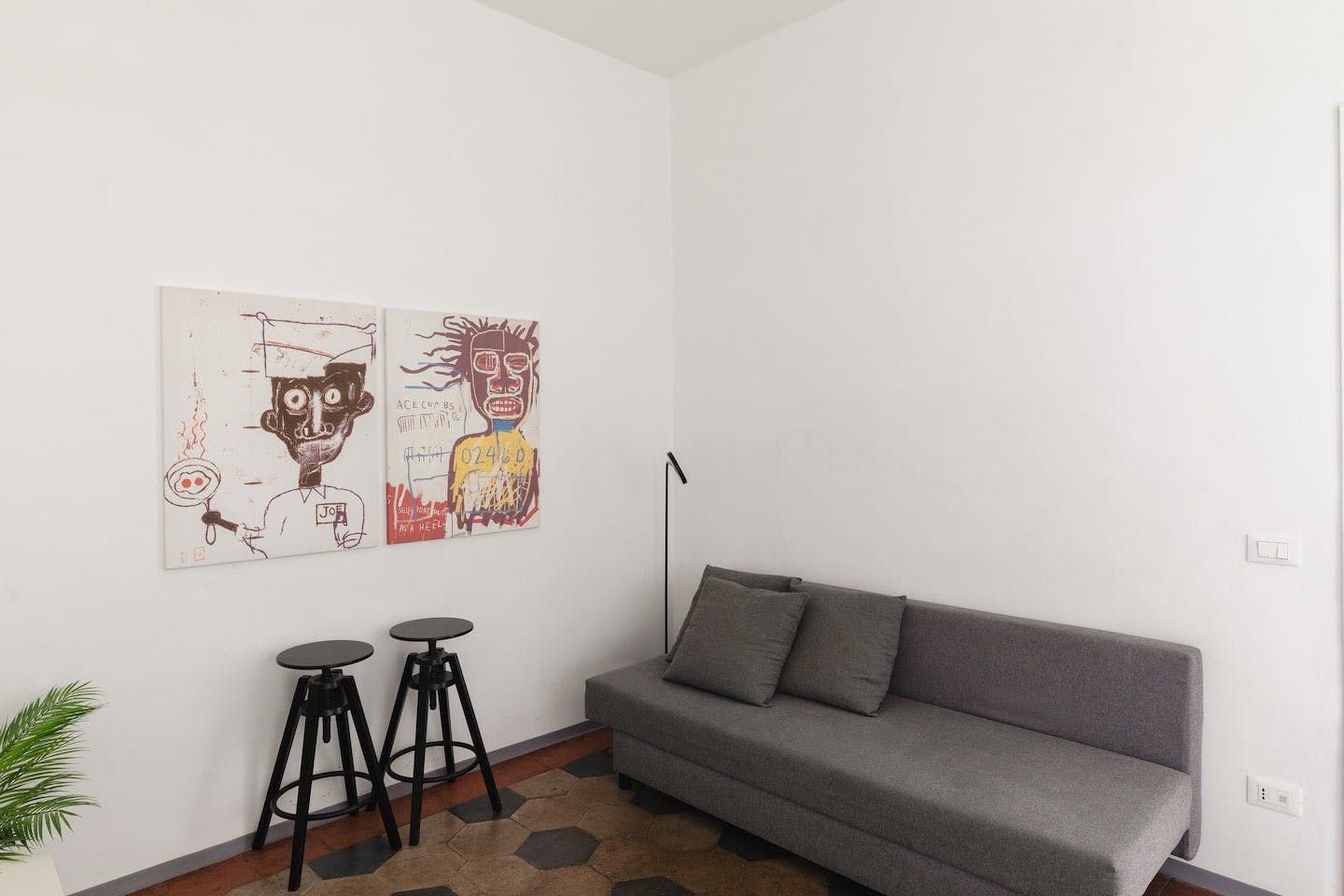 Against an effortlessly cool backdrop of stark white walls and tiled flooring, much of the interior design embraces industrial-chic trends, from the bare lightbulbs hanging from the ceiling and the chalkboard on the kitchen wall to the bright yellow stools at the kitchen surface. We're also big fans of the Basquiat artworks and the sleek bathroom.