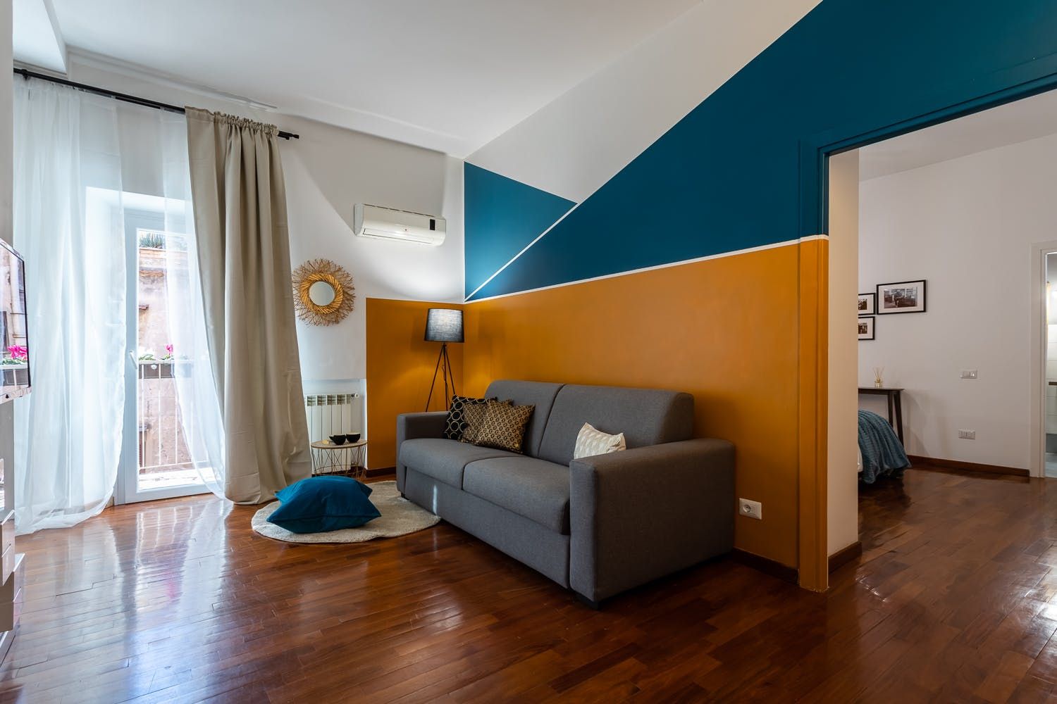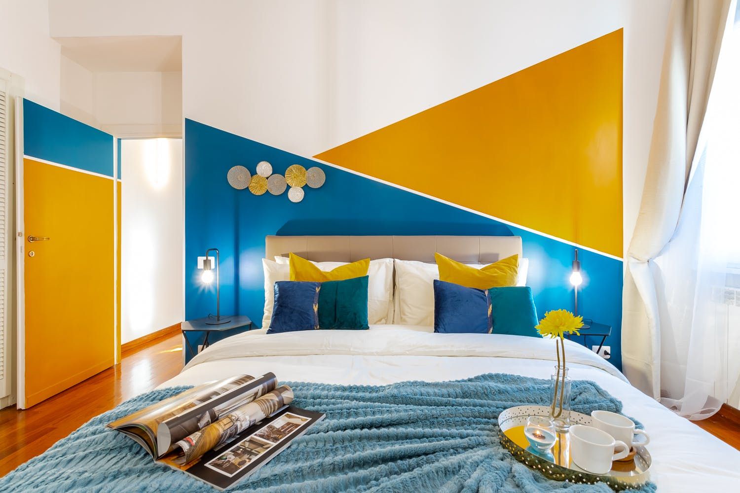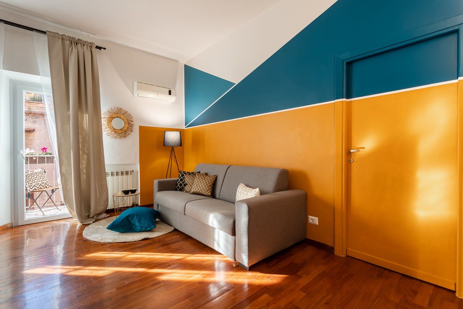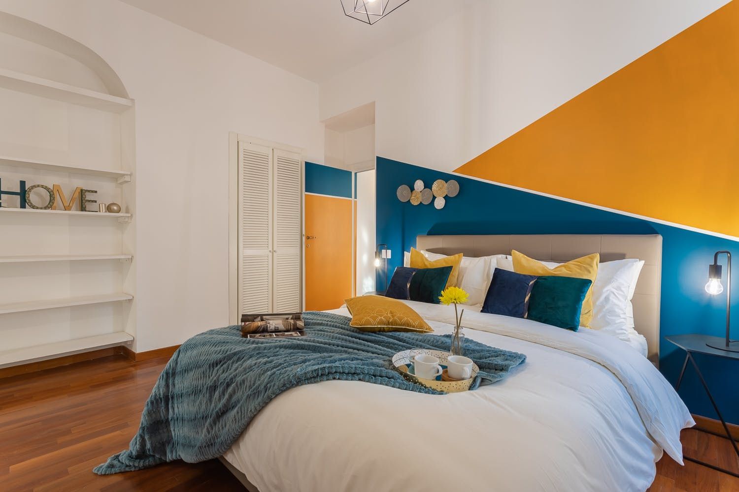 The balcony is furnished with a bistro set for two – perfect for a morning coffee or evening tipple as the sun sets over the rooftops of historic Rome. If you’re not exploring the gelato shops and pizzerias of your neighbourhood, perhaps cook something in the sunlight-filled kitchen. Its wood accents, pristine white walls and array of pot plants give a relaxed, boho feel. The bright blue and sunshine-yellow feature walls in the living room and bedroom add a touch of fun and traditional, tall windows in both rooms let the natural light pour in.
