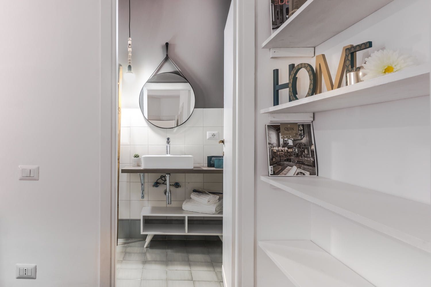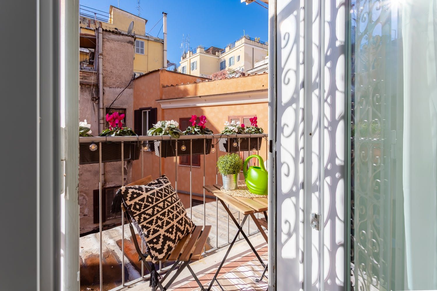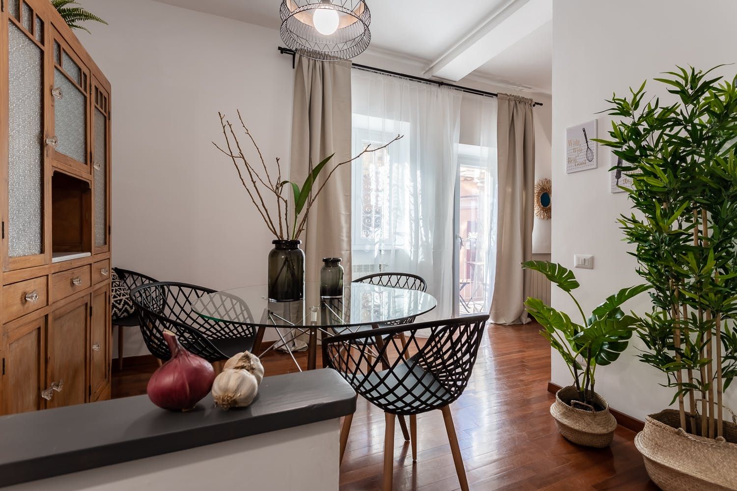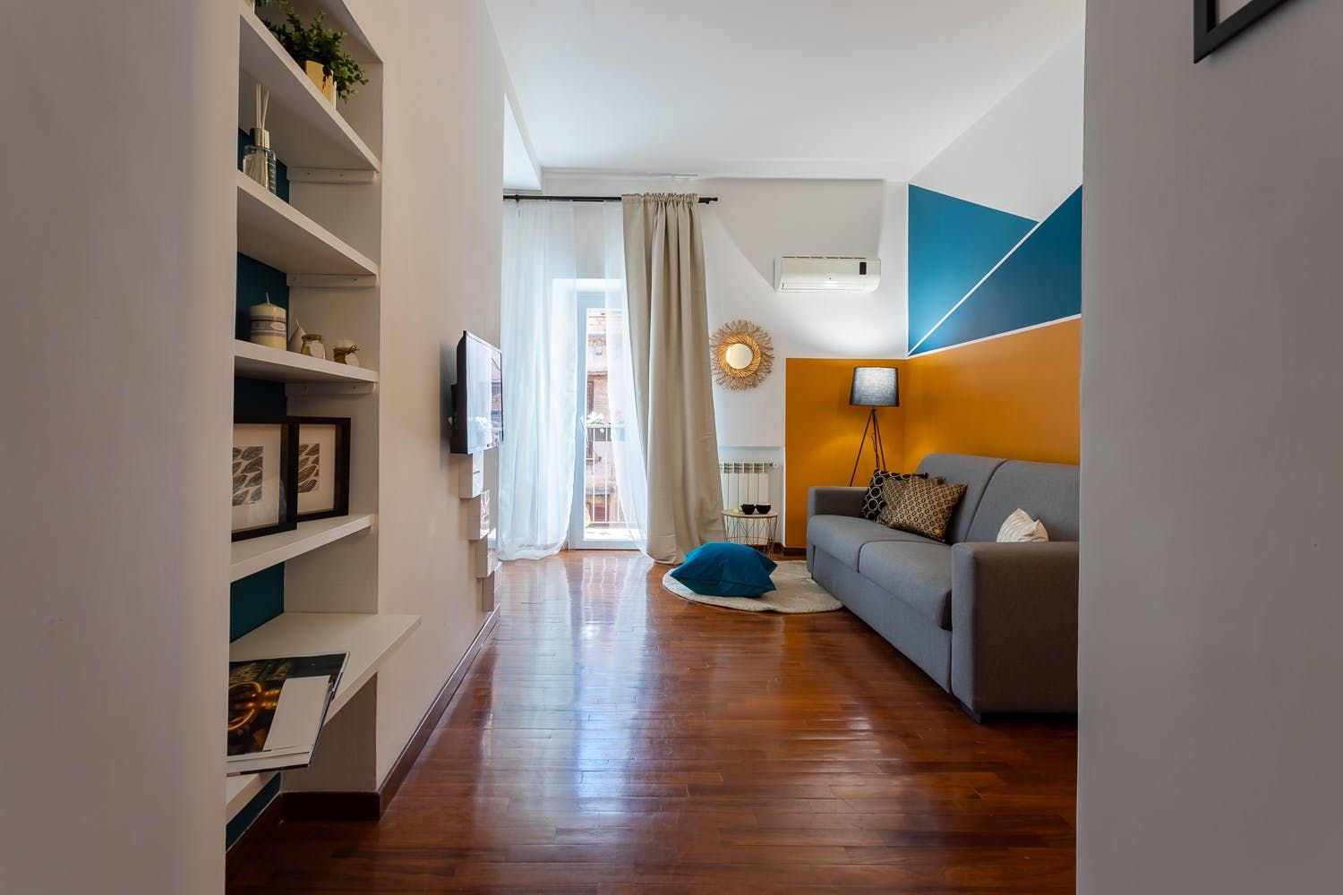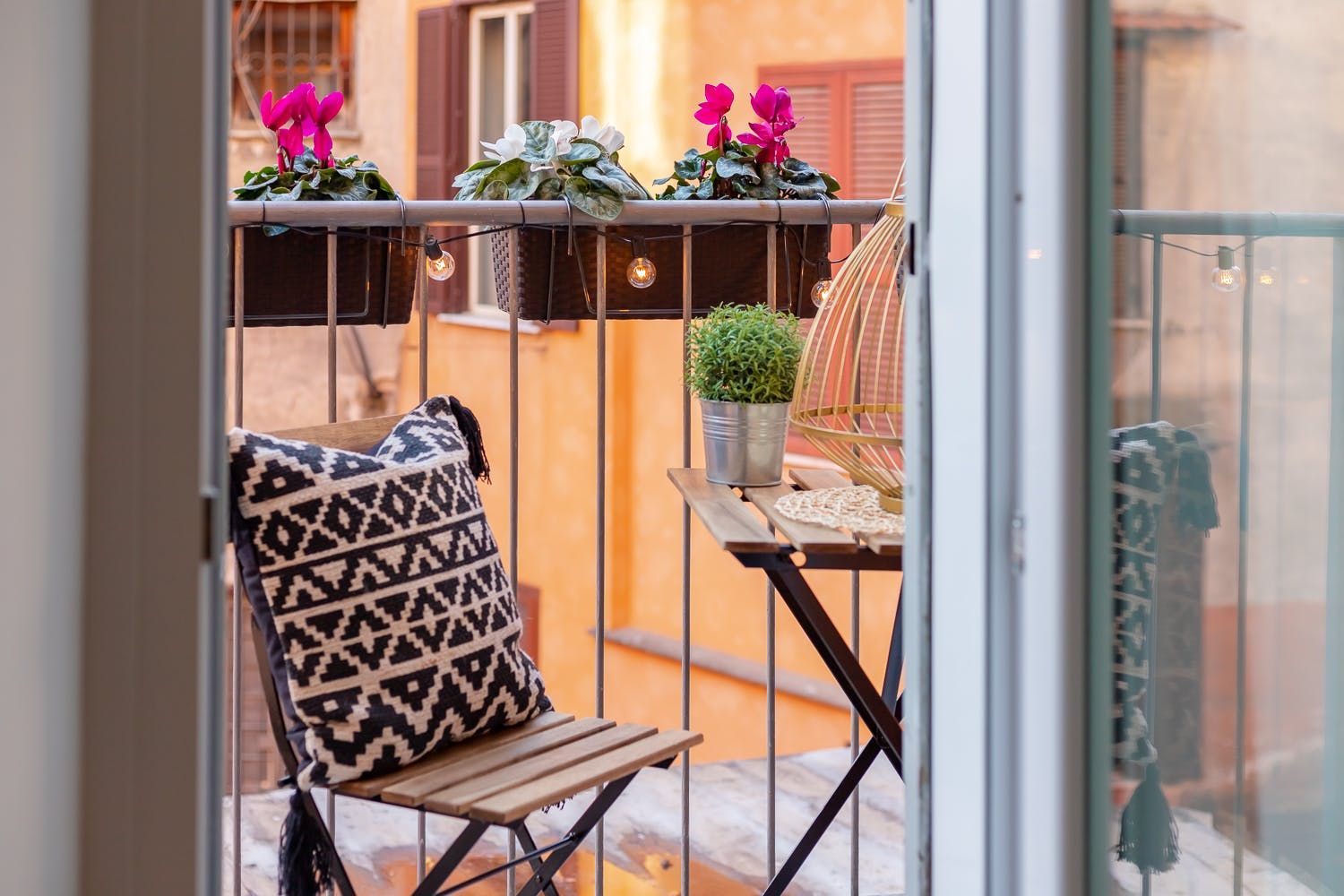 The balcony is furnished with a bistro set for two – perfect for a morning coffee or evening tipple as the sun sets over the rooftops of historic Rome. If you’re not exploring the gelato shops and pizzerias of your neighbourhood, perhaps cook something in the sunlight-filled kitchen. Its wood accents, pristine white walls and array of pot plants give a relaxed, boho feel. The bright blue and sunshine-yellow feature walls in the living room and bedroom add a touch of fun and traditional, tall windows in both rooms let the natural light pour in.