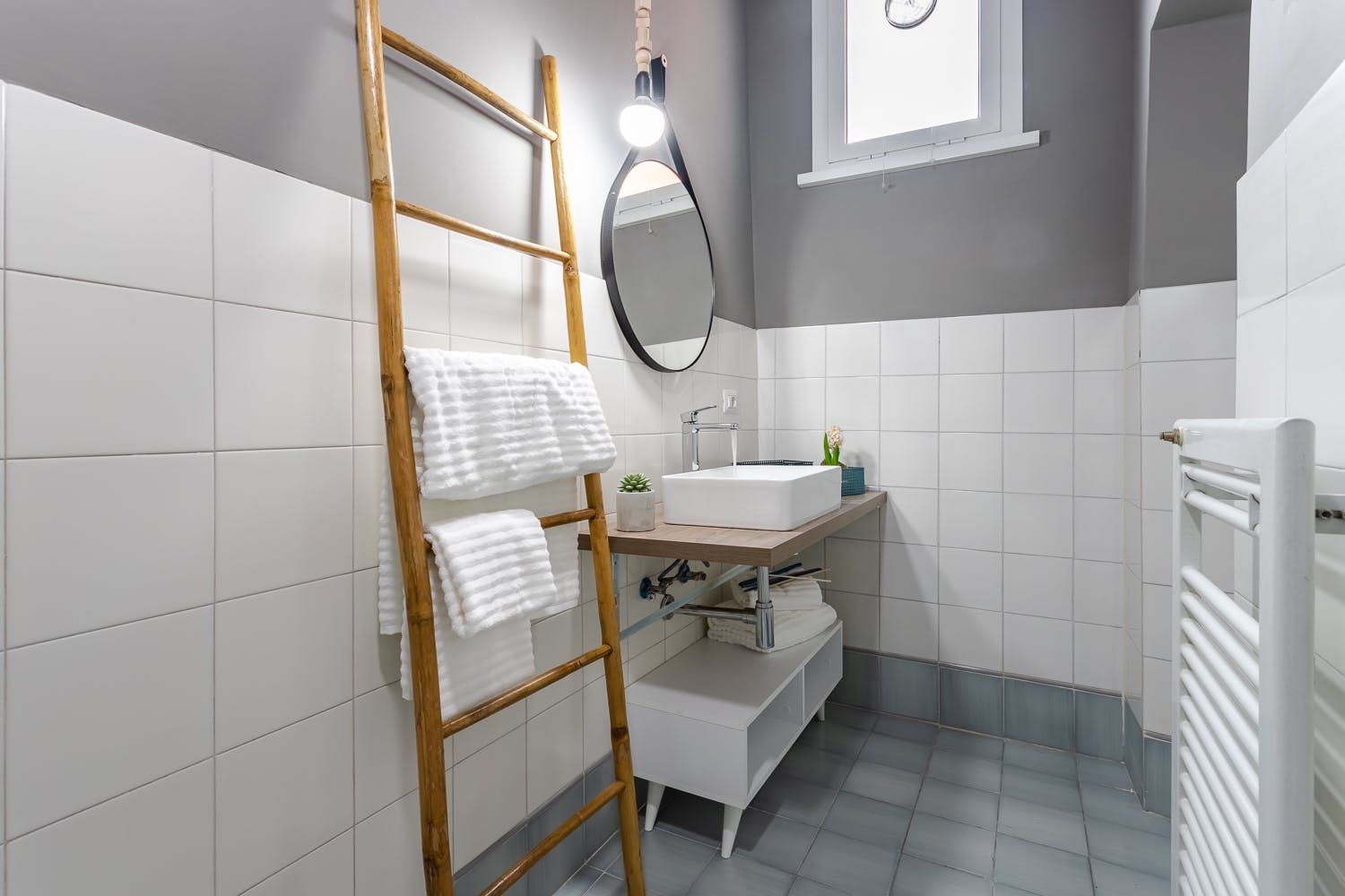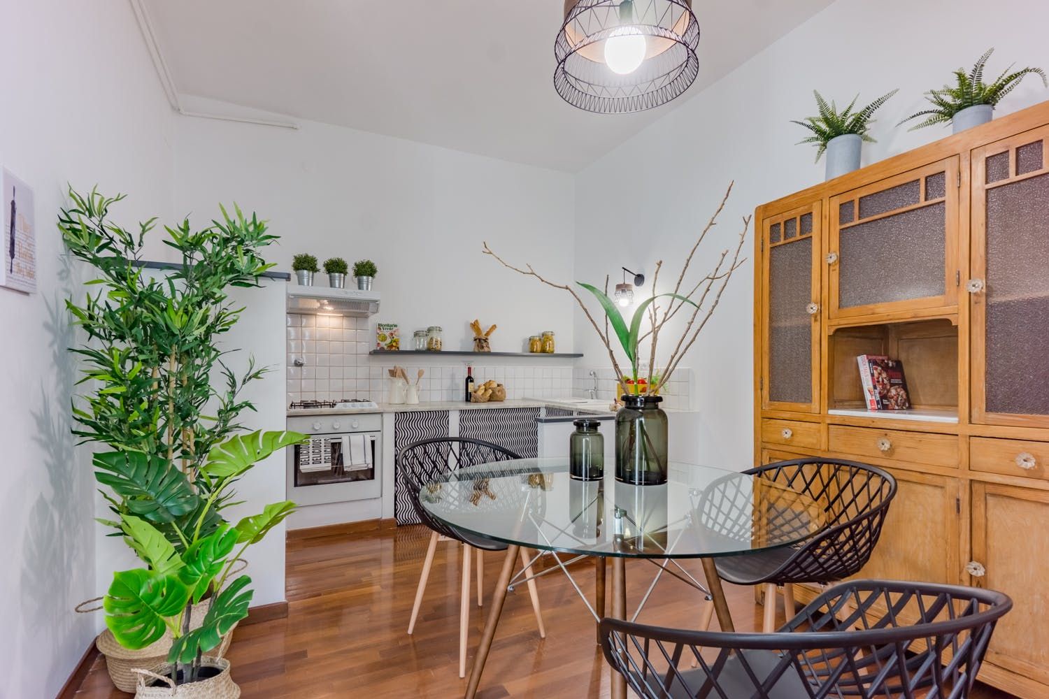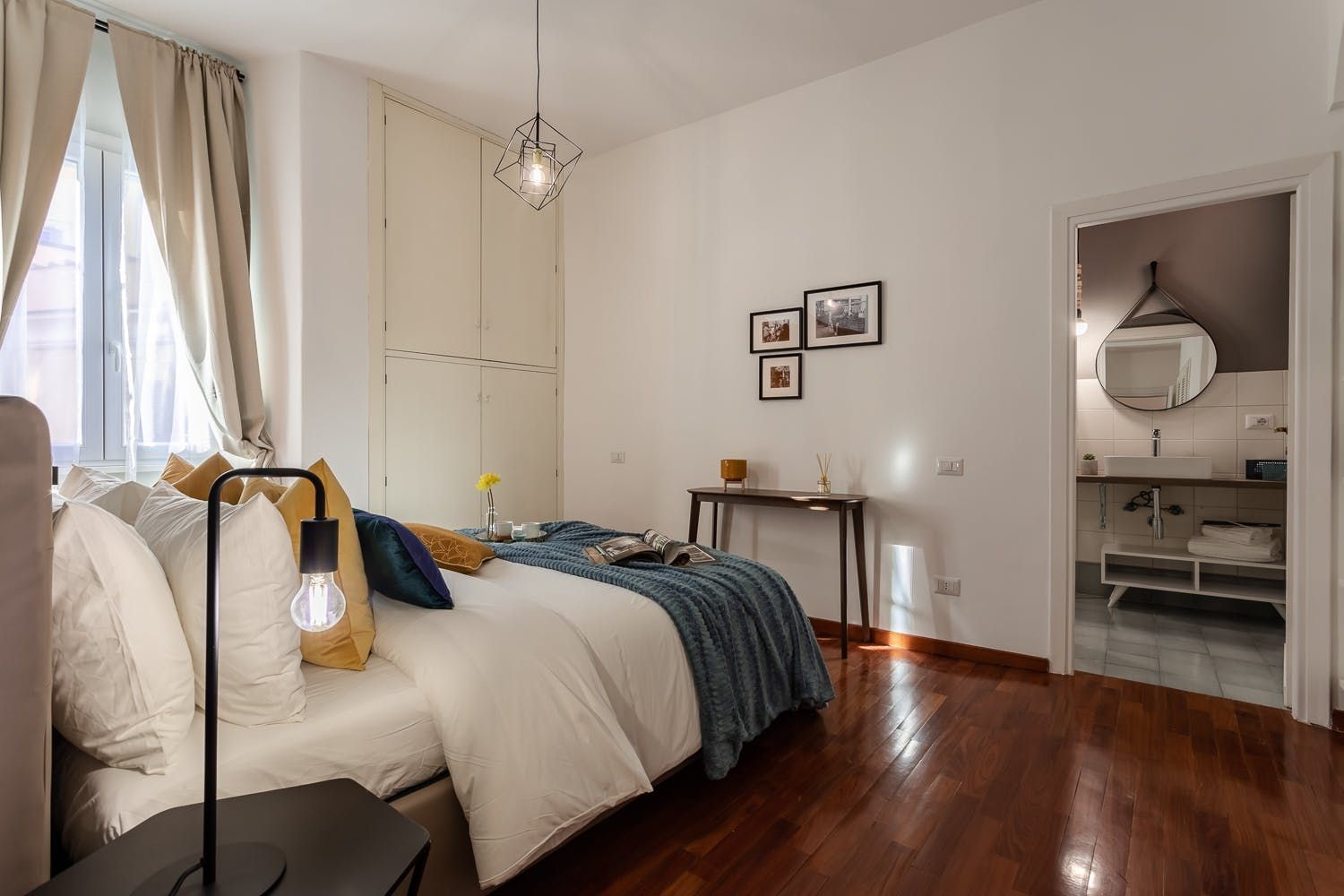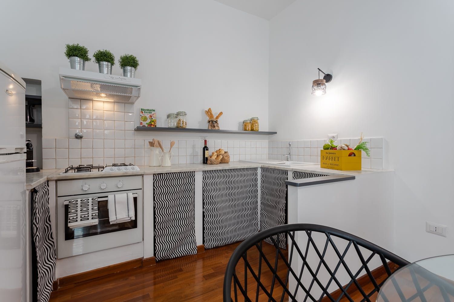 The balcony is furnished with a bistro set for two – perfect for a morning coffee or evening tipple as the sun sets over the rooftops of historic Rome. If you’re not exploring the gelato shops and pizzerias of your neighbourhood, perhaps cook something in the sunlight-filled kitchen. Its wood accents, pristine white walls and array of pot plants give a relaxed, boho feel. The bright blue and sunshine-yellow feature walls in the living room and bedroom add a touch of fun and traditional, tall windows in both rooms let the natural light pour in.