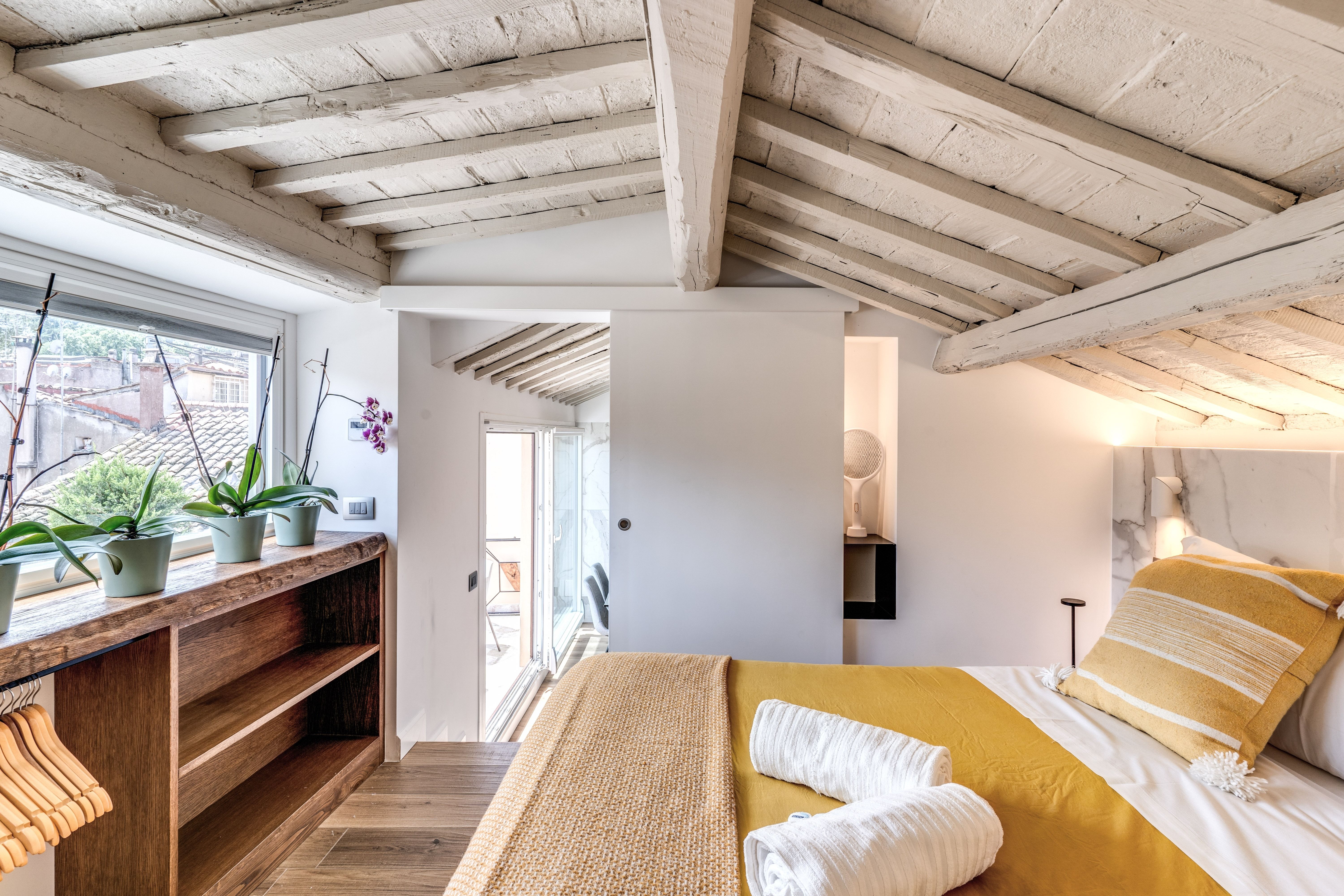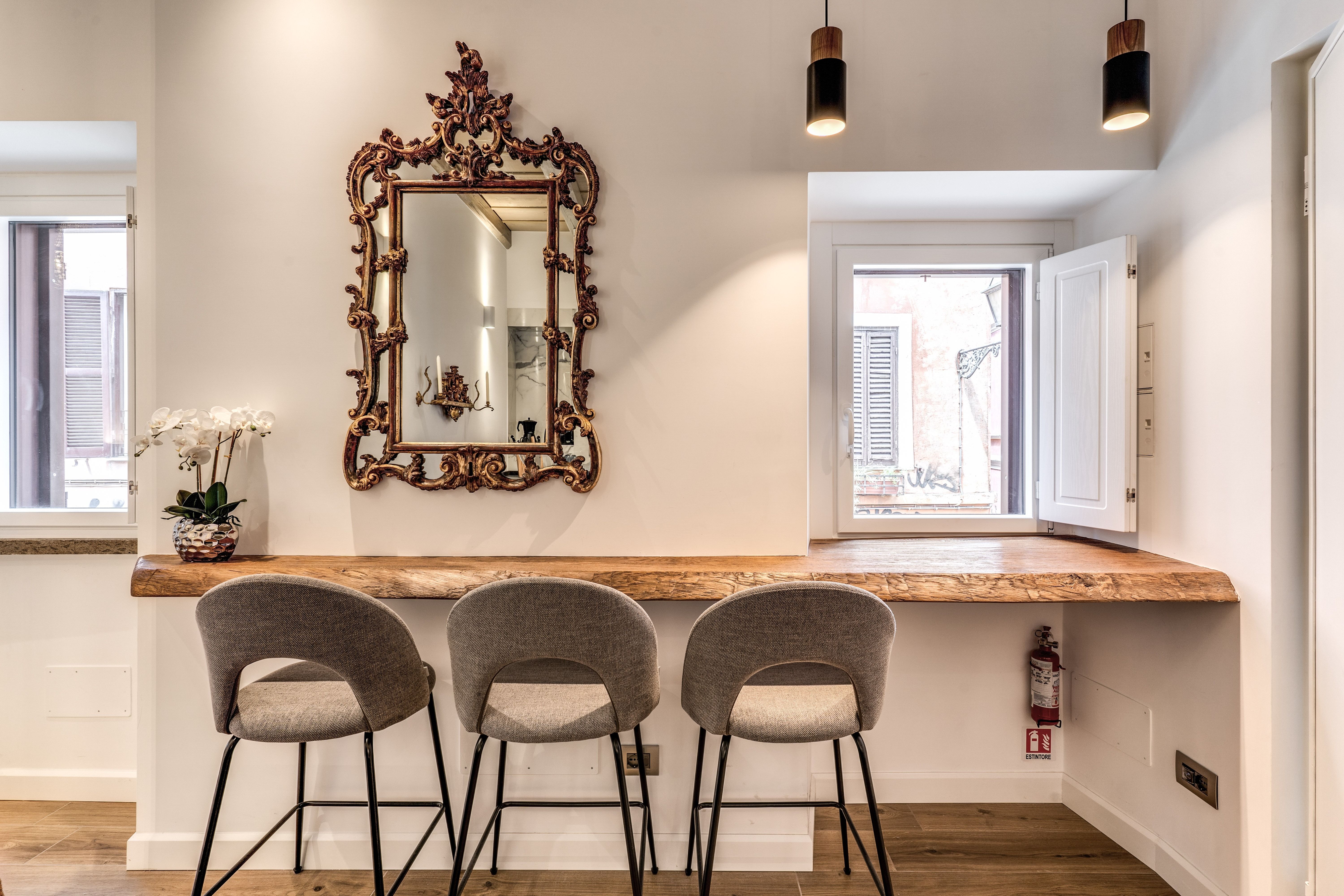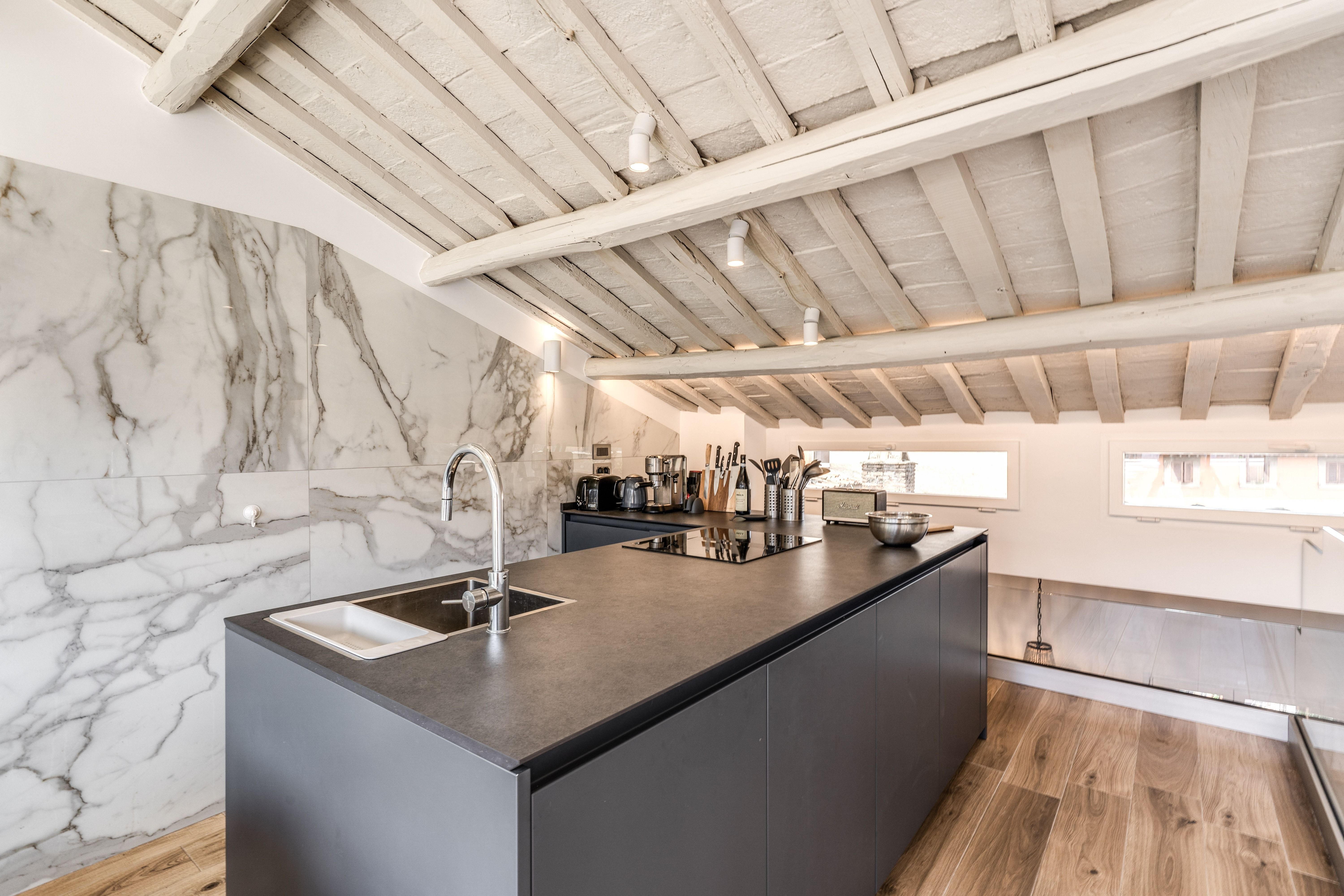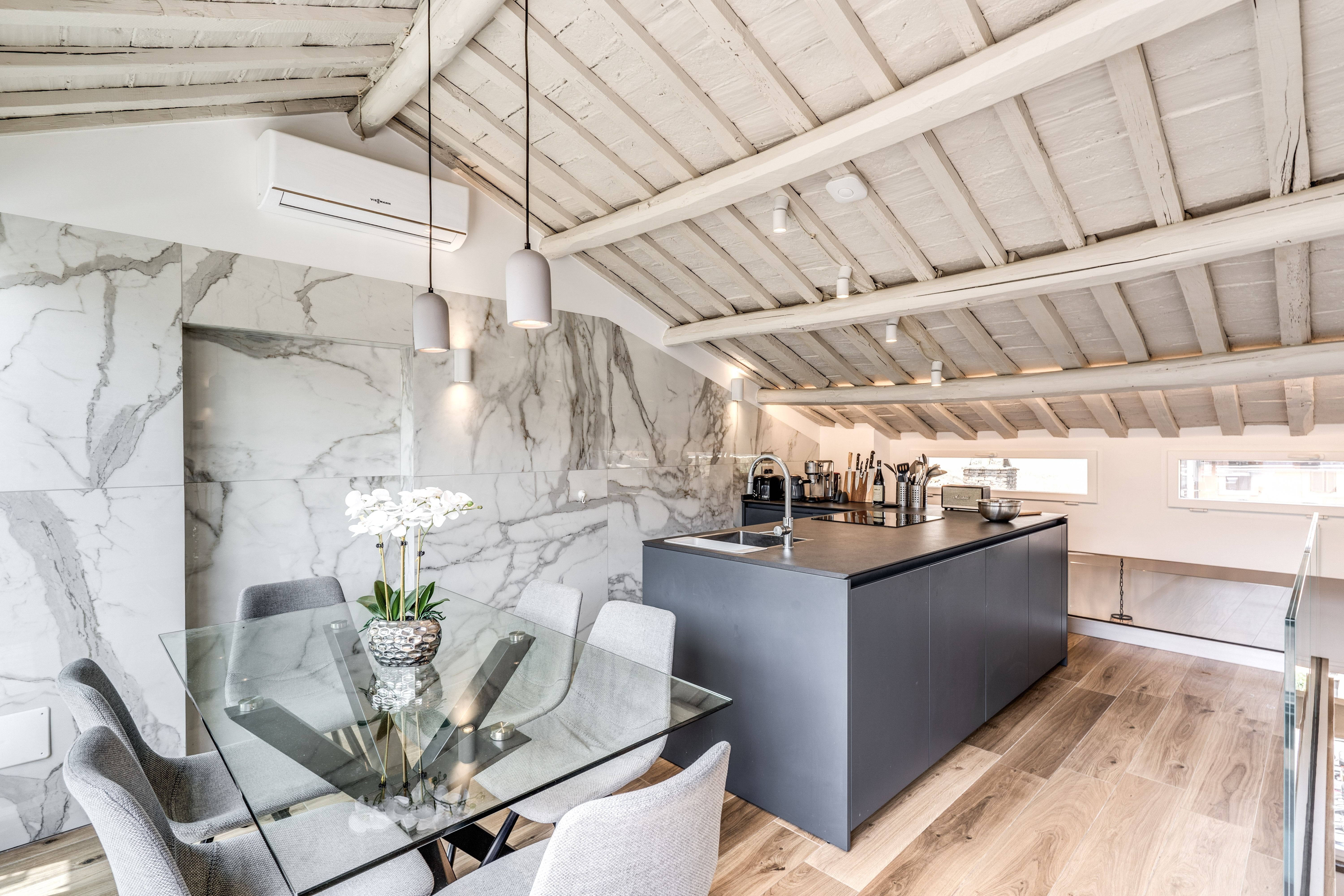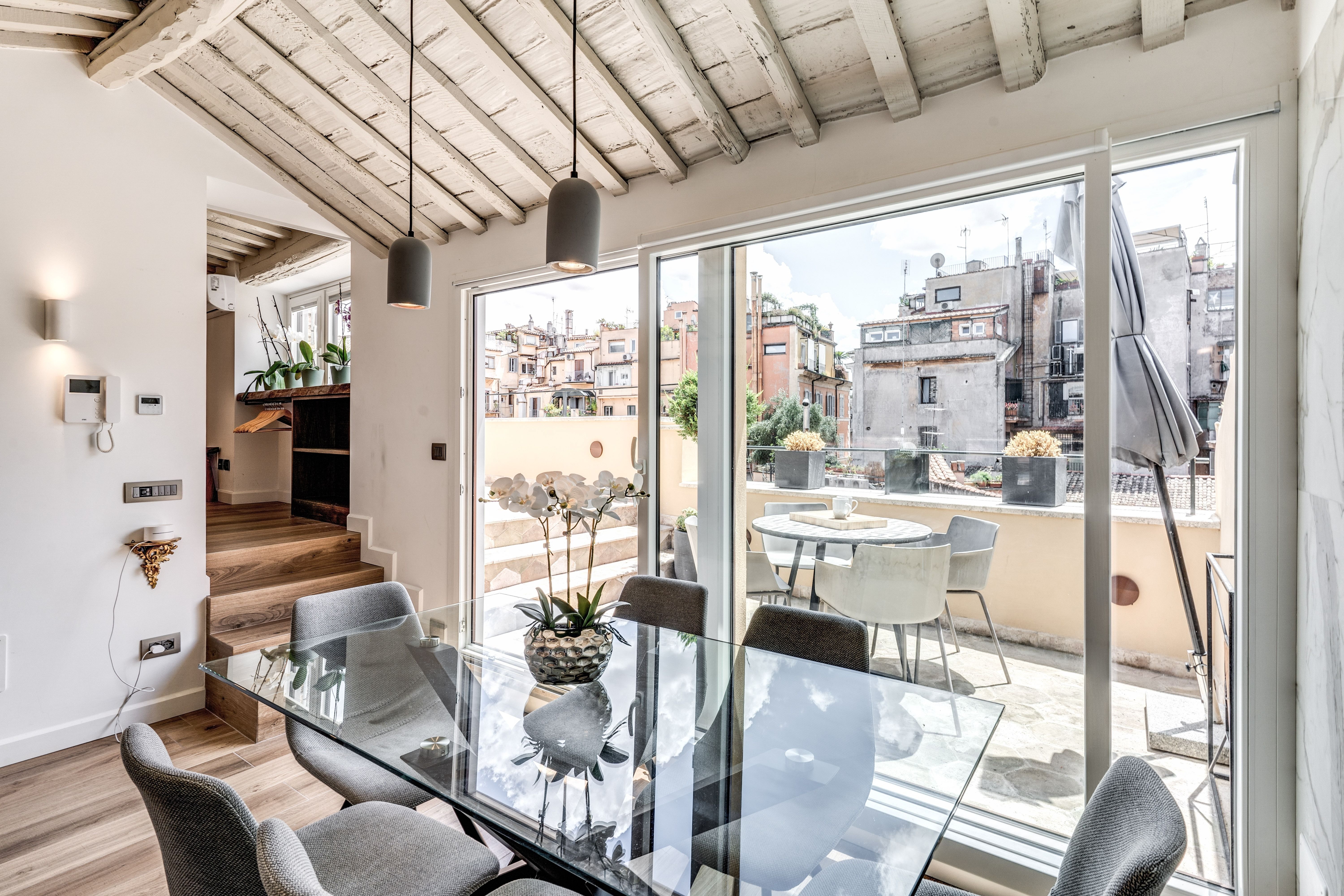 This contemporary Roman home feels like three homes in one – perfect for groups or families who like their own space. It's spread over four floors, with three modern kitchens and living areas. The top floor offers the most privacy, with an ensuite bathroom and dining room. It's also where you'll find the roof terrace, complete with a small dining table, seating for four and views of Trastevere rooftops. The central location is ideal for exploring – surrounded by authentic bars and restaurants – and Rome's most iconic sights, like the Colosseum or the Pantheon, are easy to reach on foot or by bus.