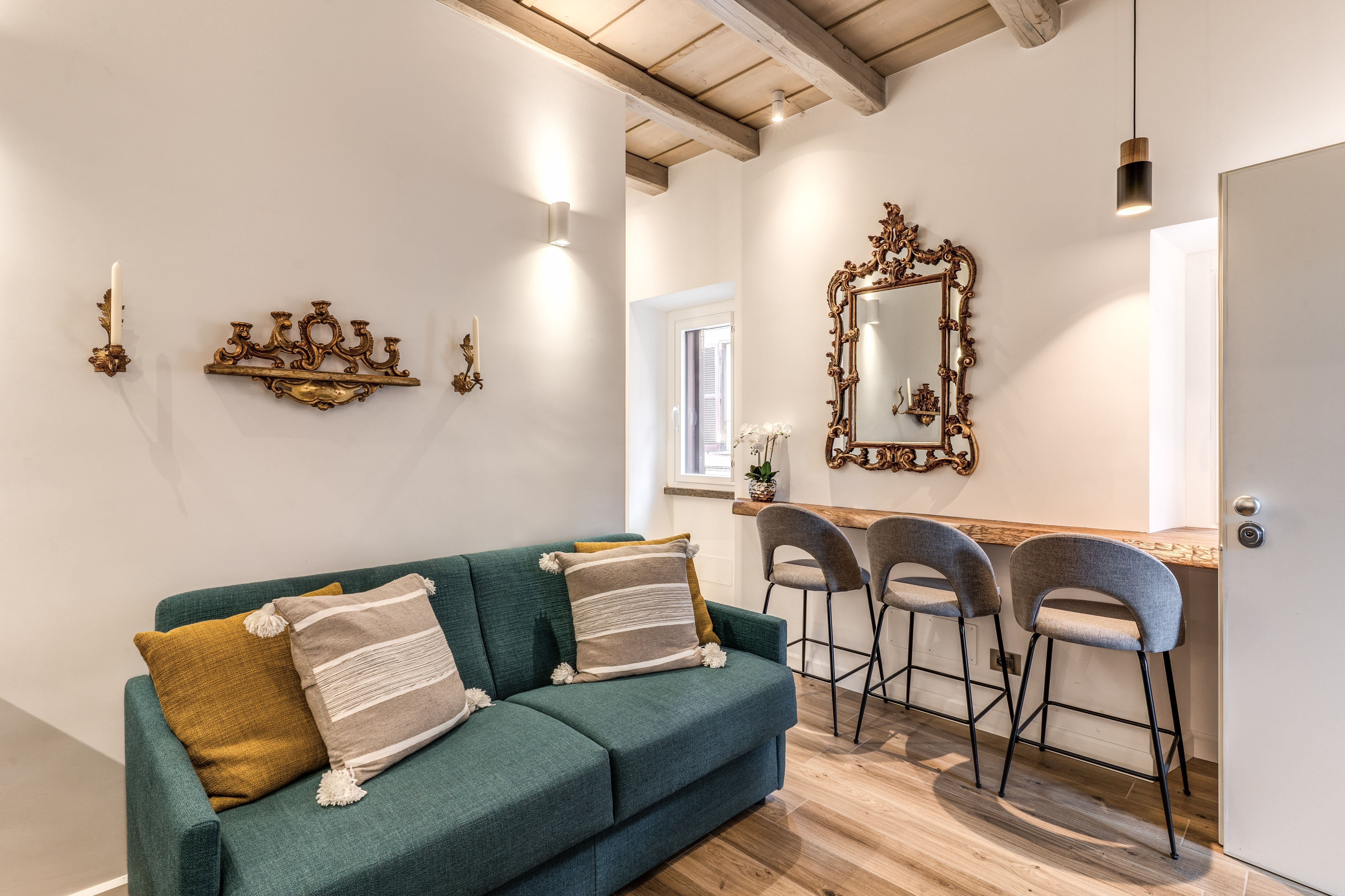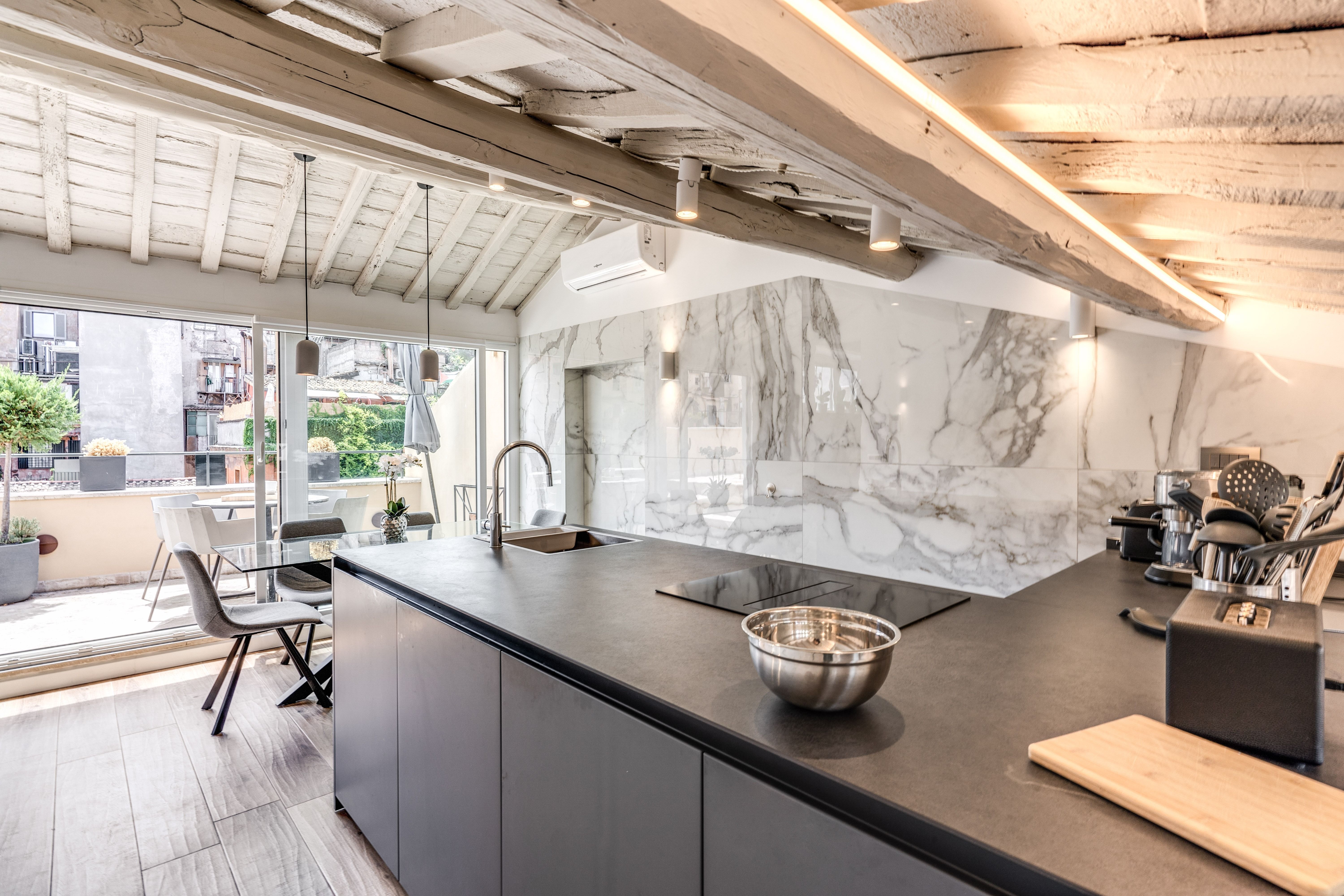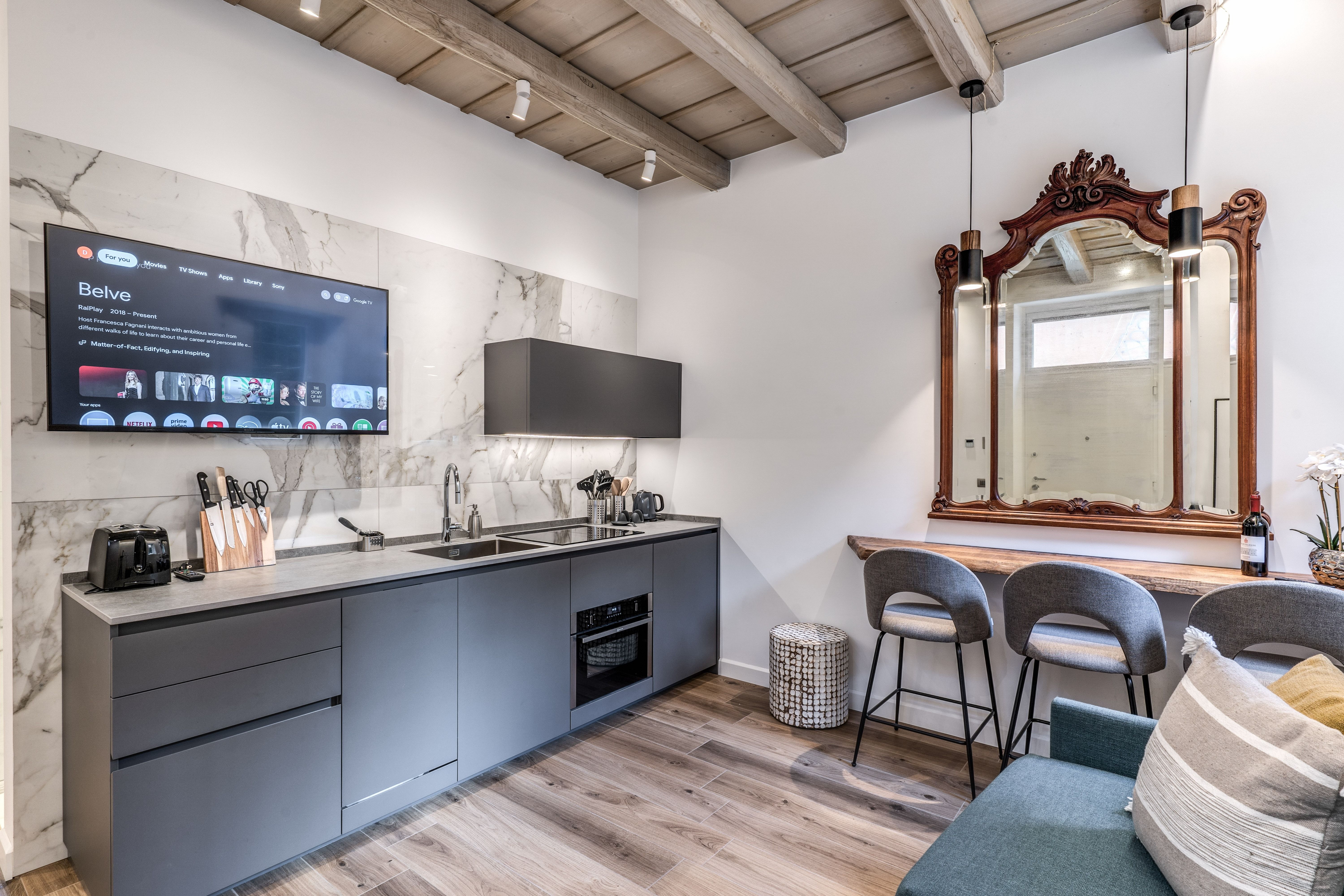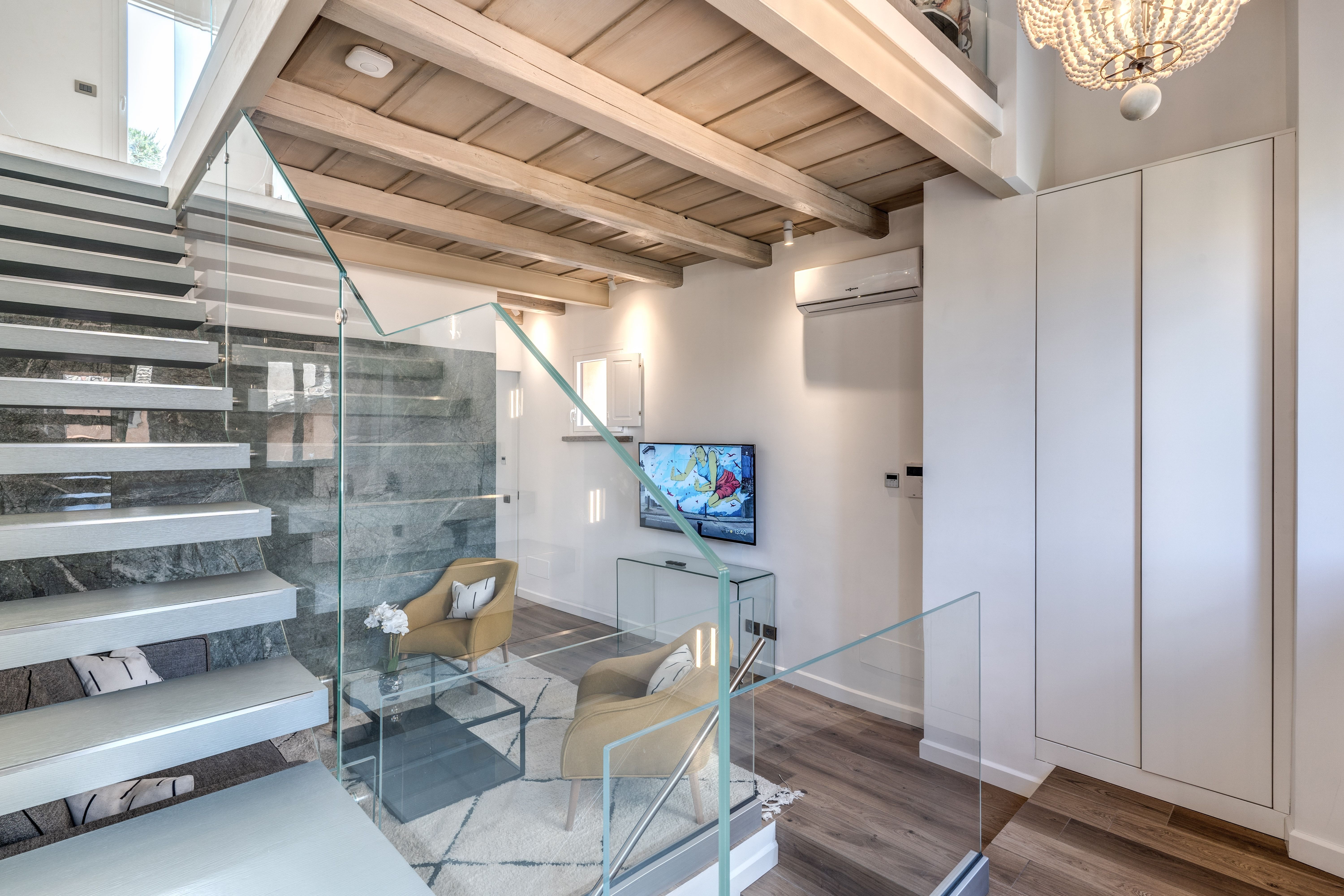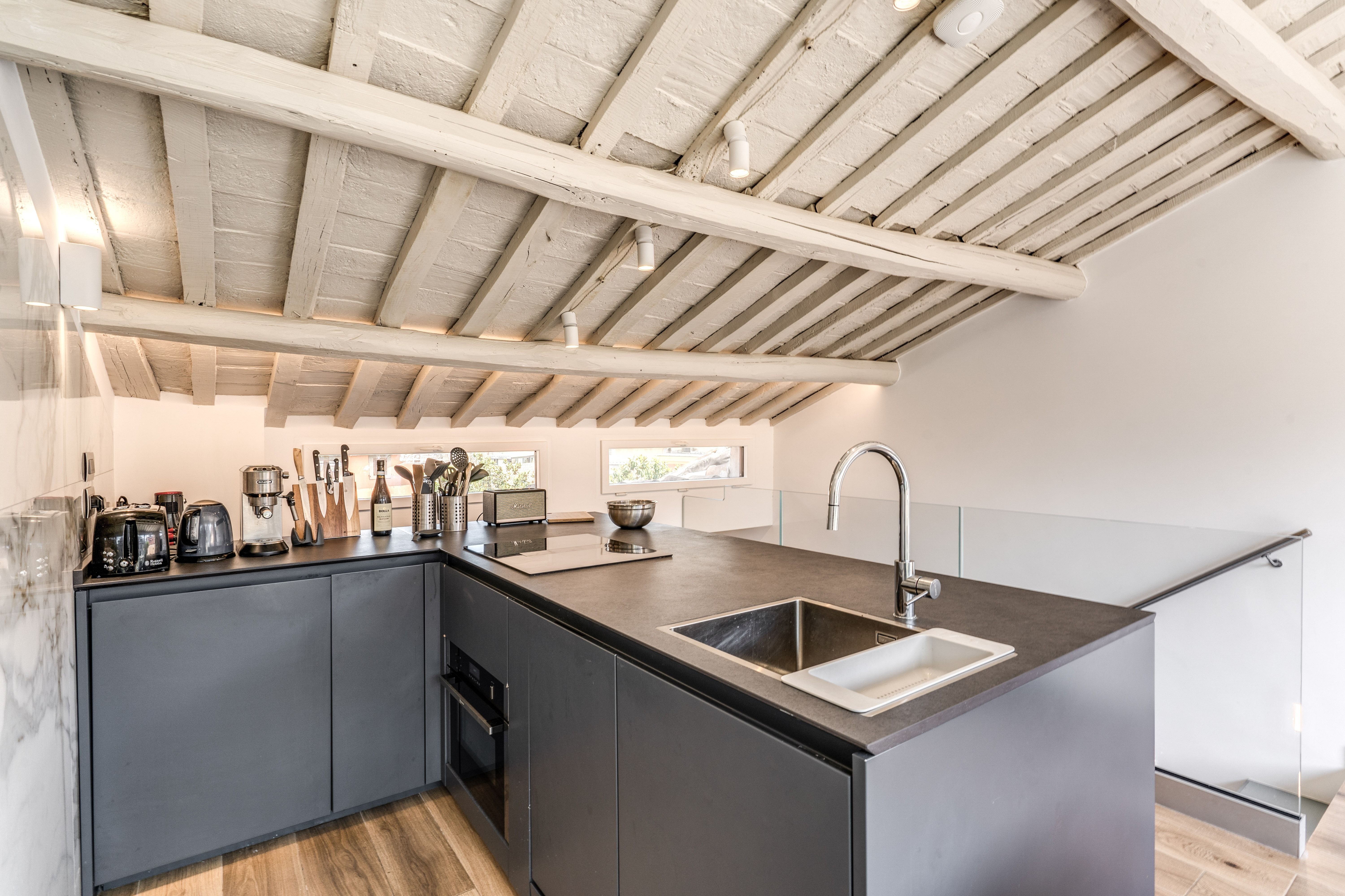 This contemporary Roman home feels like three homes in one – perfect for groups or families who like their own space. It's spread over four floors, with three modern kitchens and living areas. The top floor offers the most privacy, with an ensuite bathroom and dining room. It's also where you'll find the roof terrace, complete with a small dining table, seating for four and views of Trastevere rooftops. The central location is ideal for exploring – surrounded by authentic bars and restaurants – and Rome's most iconic sights, like the Colosseum or the Pantheon, are easy to reach on foot or by bus.