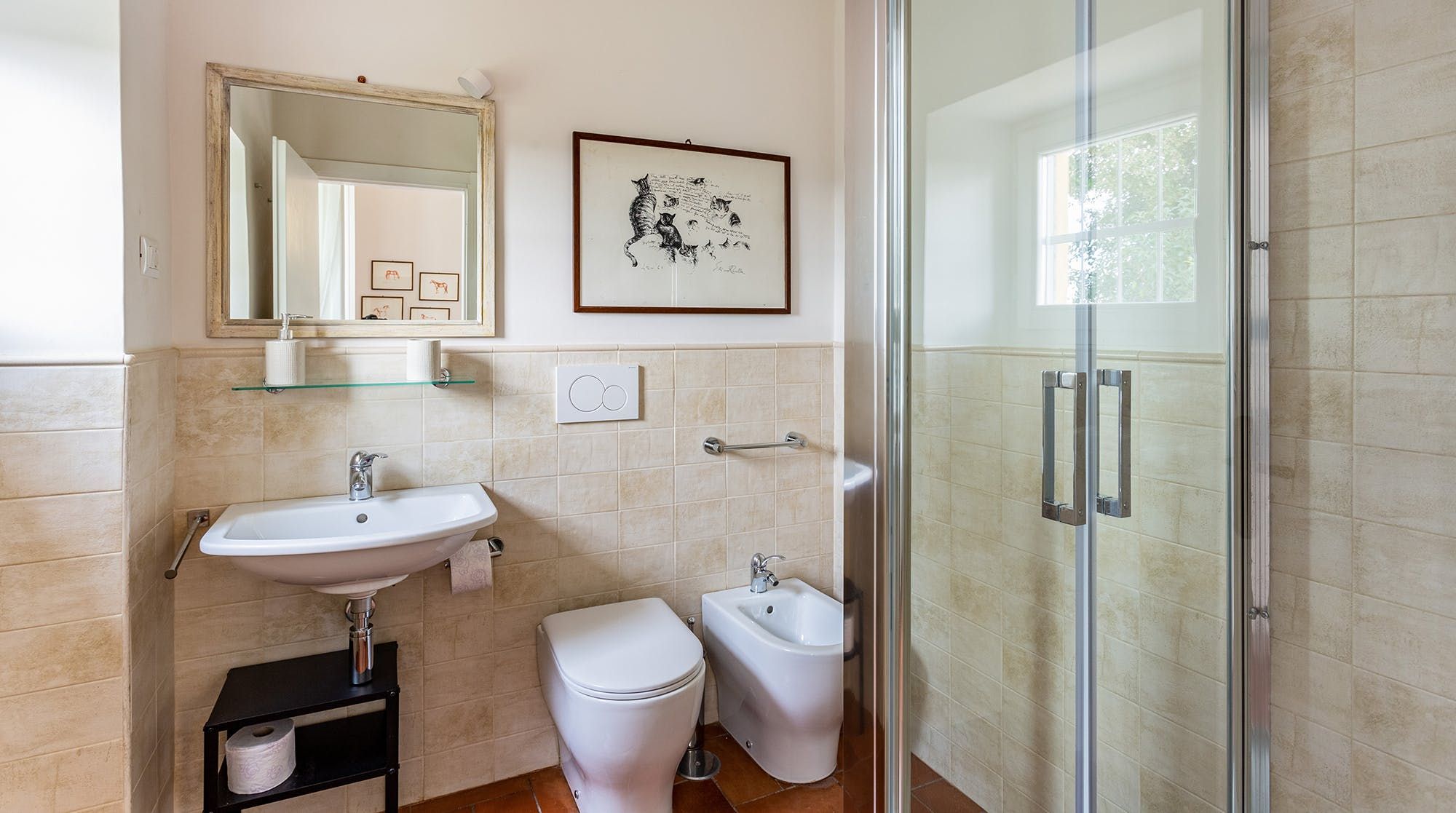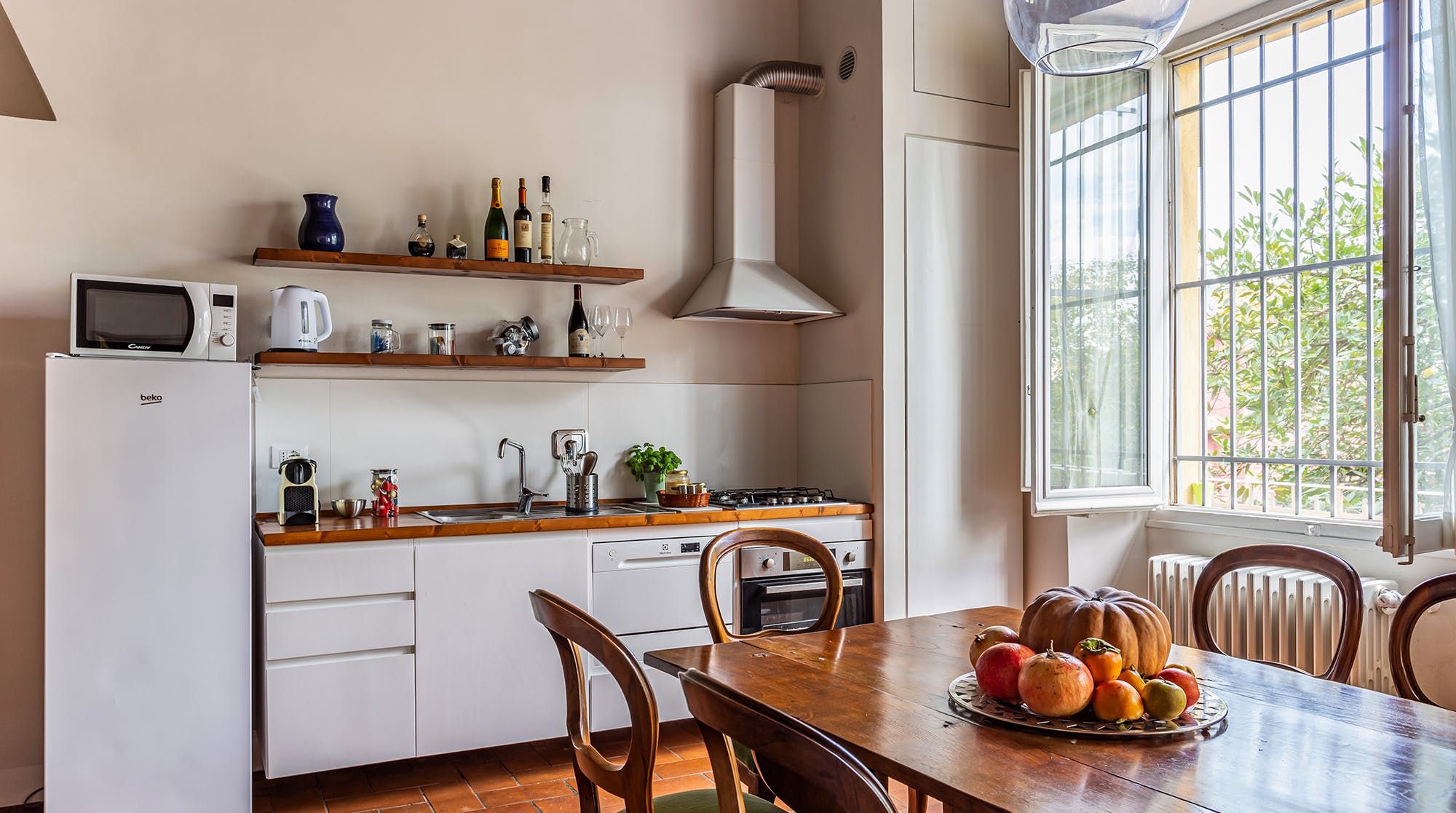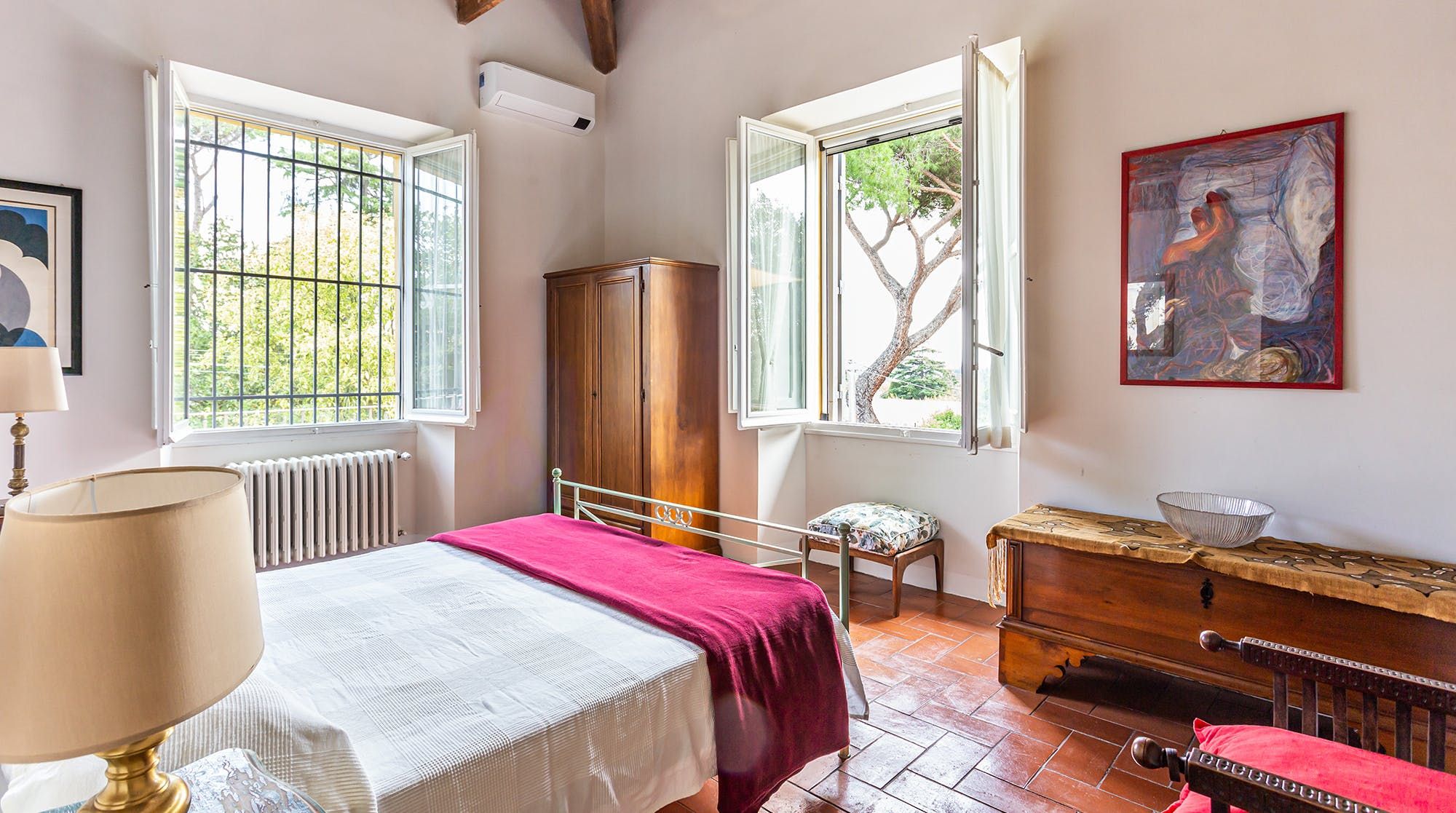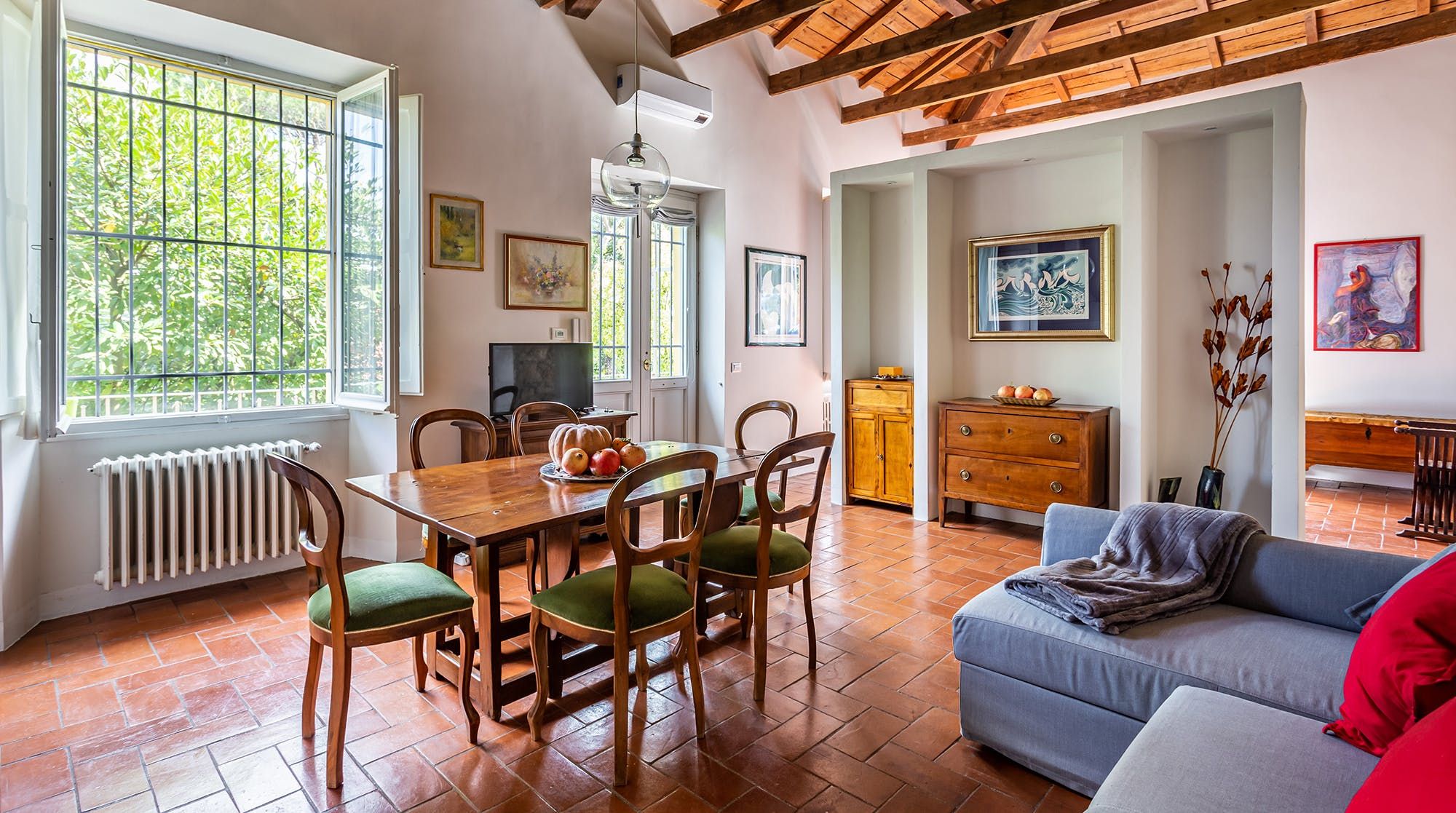 Continuing the homespun energy, the terracotta floors of the living room and kitchen support rustic furniture and unique artwork. The dining table facing a huge painting is the highlight, creating a cosy setting to share pasta and tiramisu.