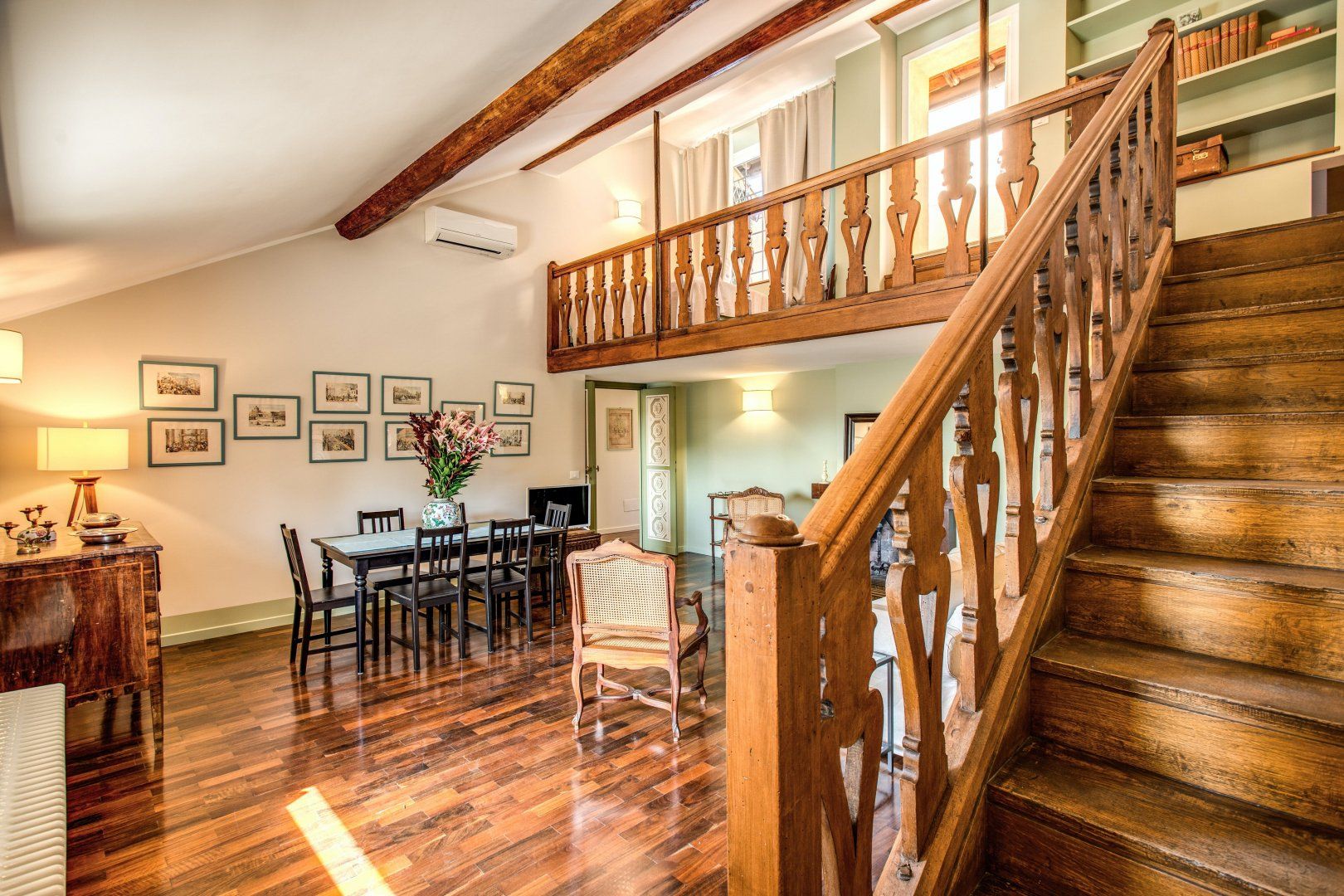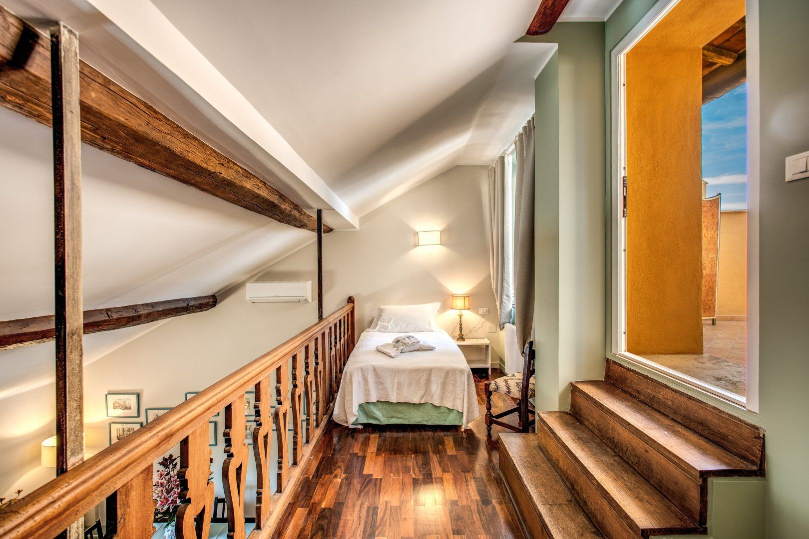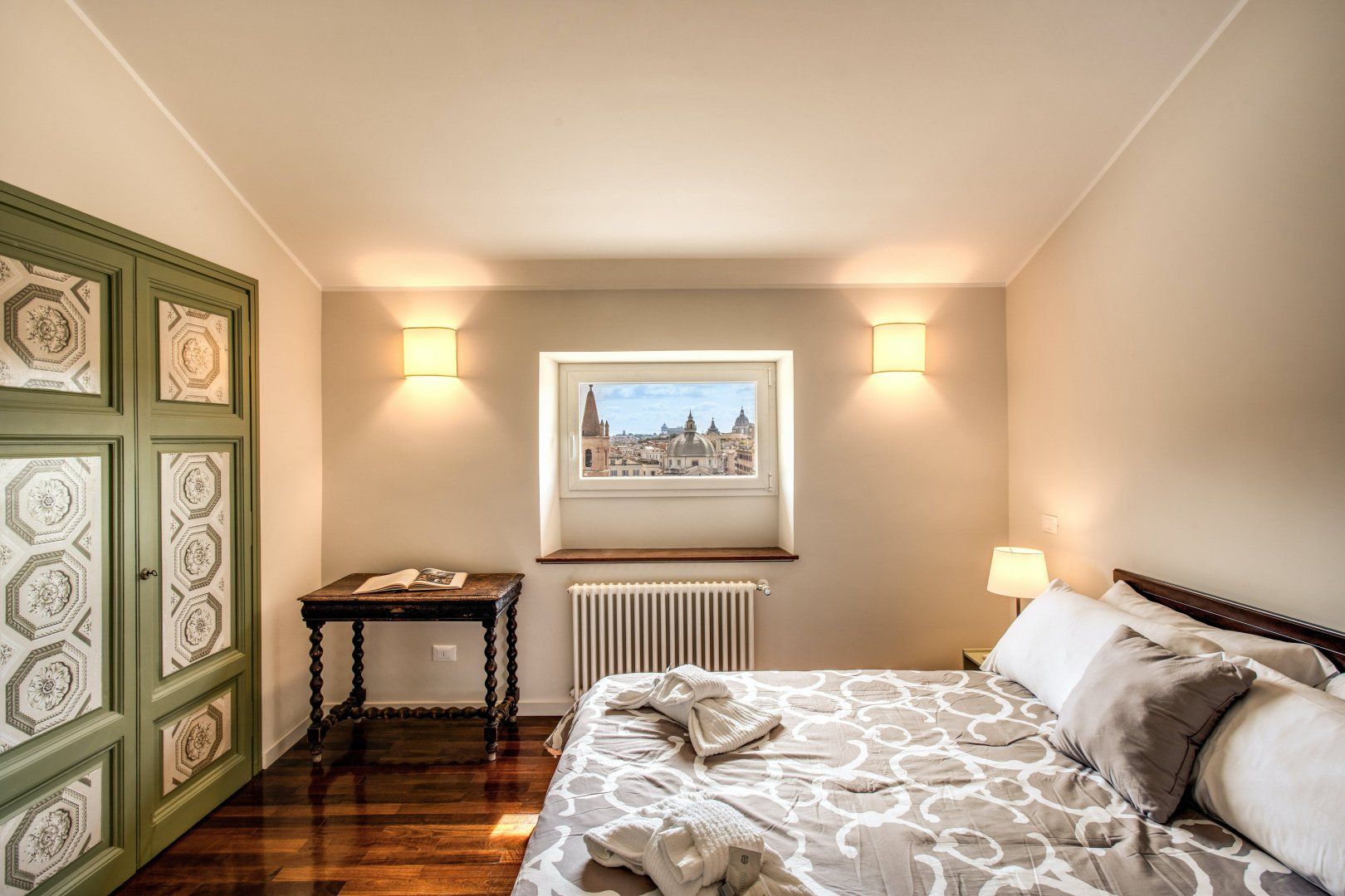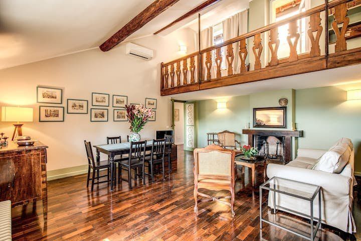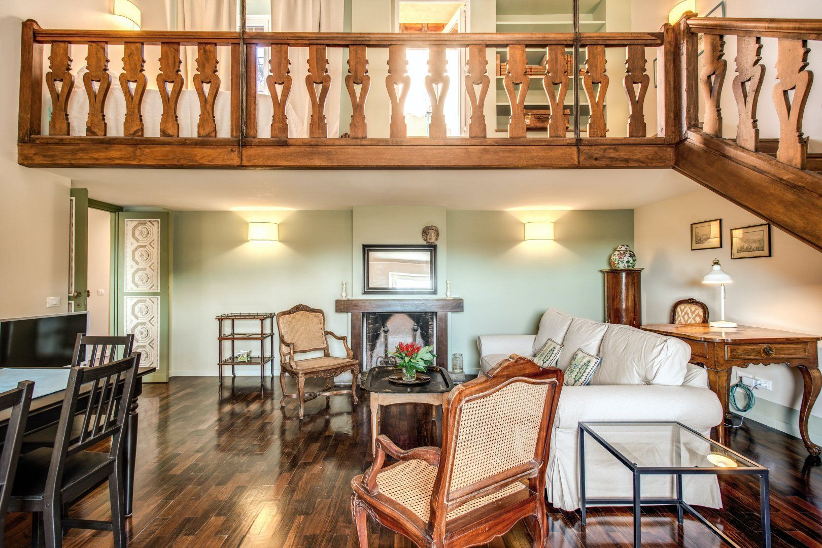 Sip a negroni cocktail on this home's private terrace right in front of Piazza Del Popolo, with its stunning panoramic views of Rome's historical heart – this is la dolce vita. Inside there are more of those inspiring views of the Eternal City to admire – they stopped us in our tracks when we visited – they look like paintings. The classic style living space has lovely polished wood floors, a feature fireplace and an ornate galleried landing. This home is ideal for a couple, business professional or family of three.