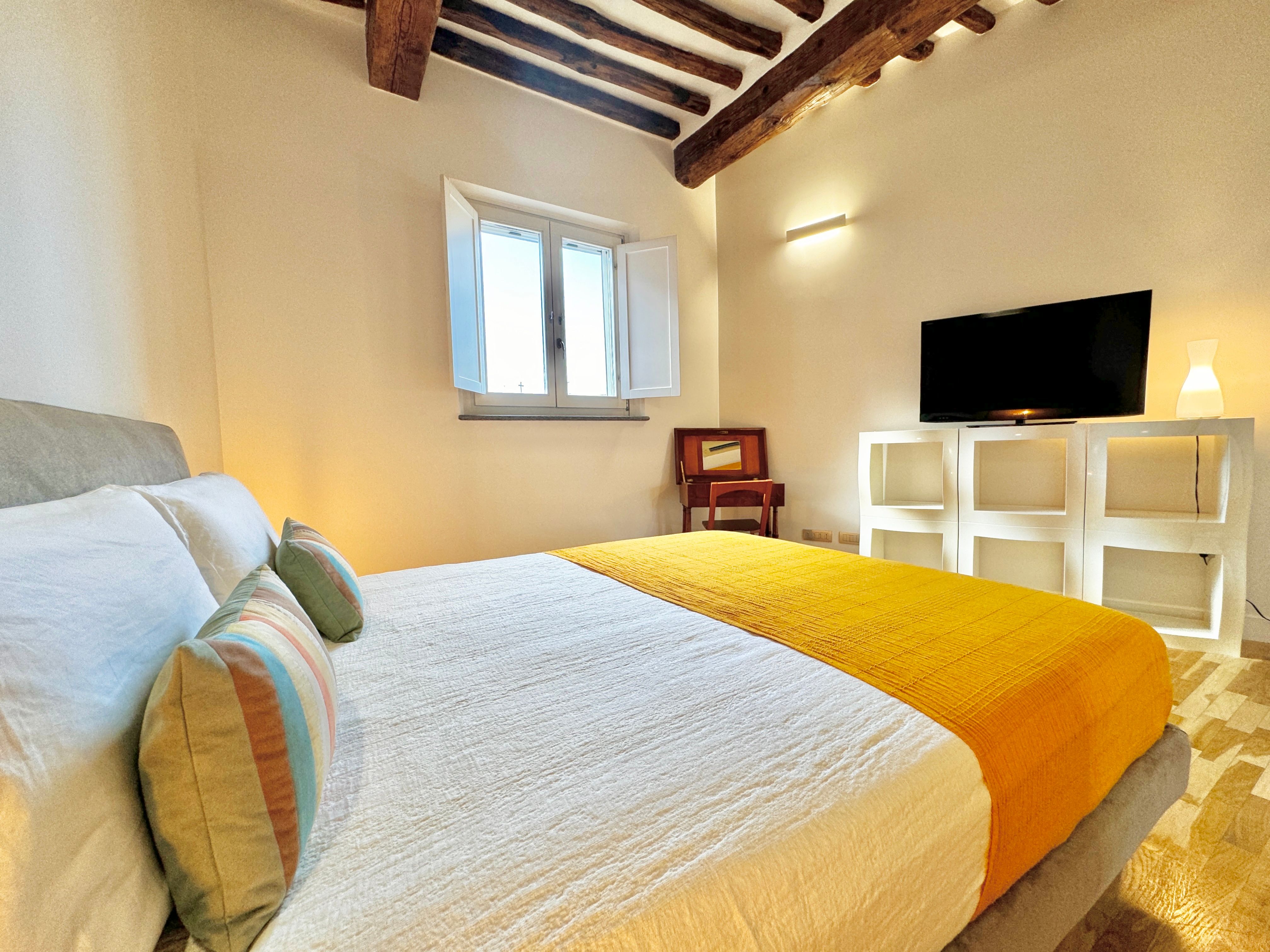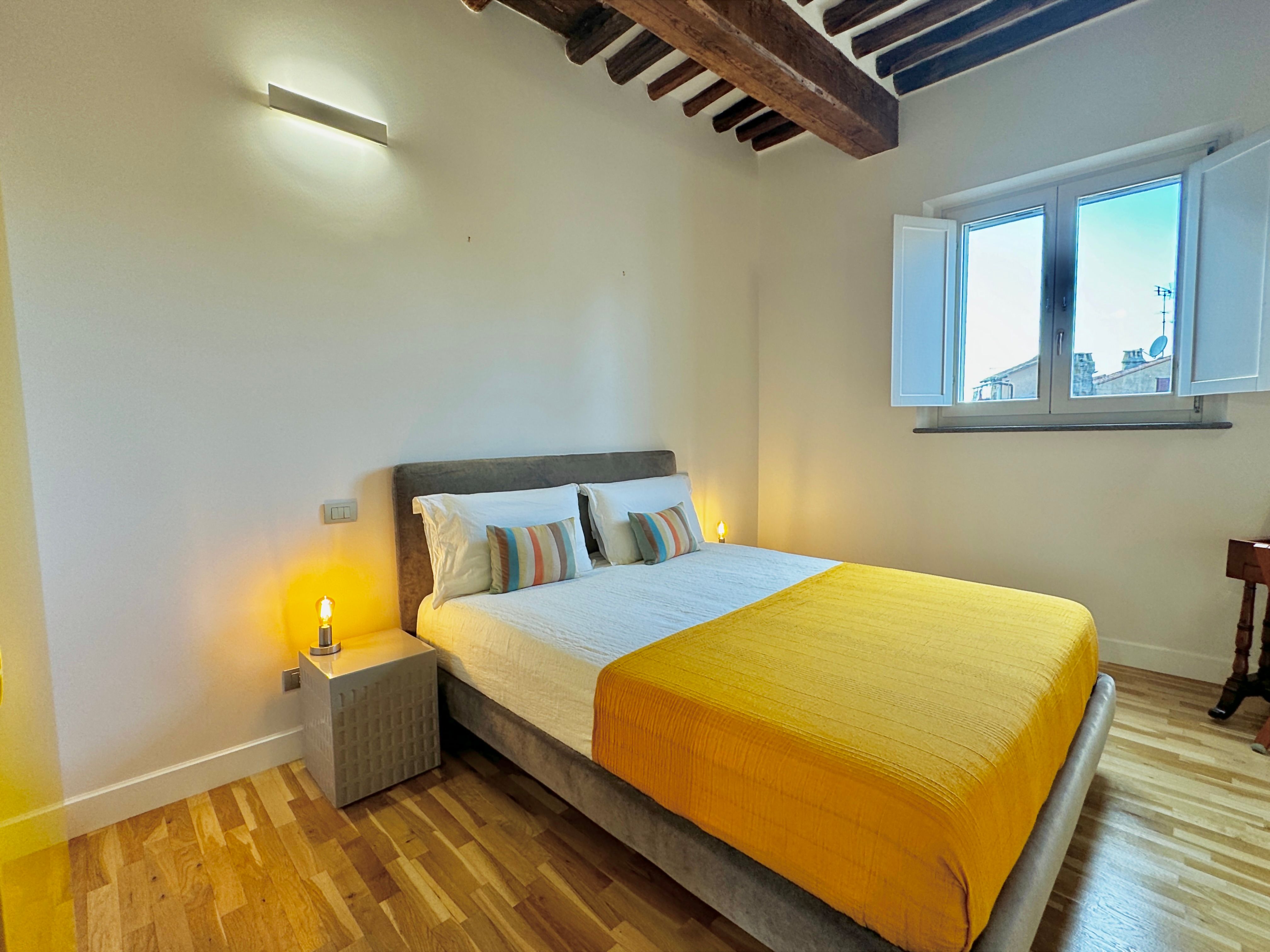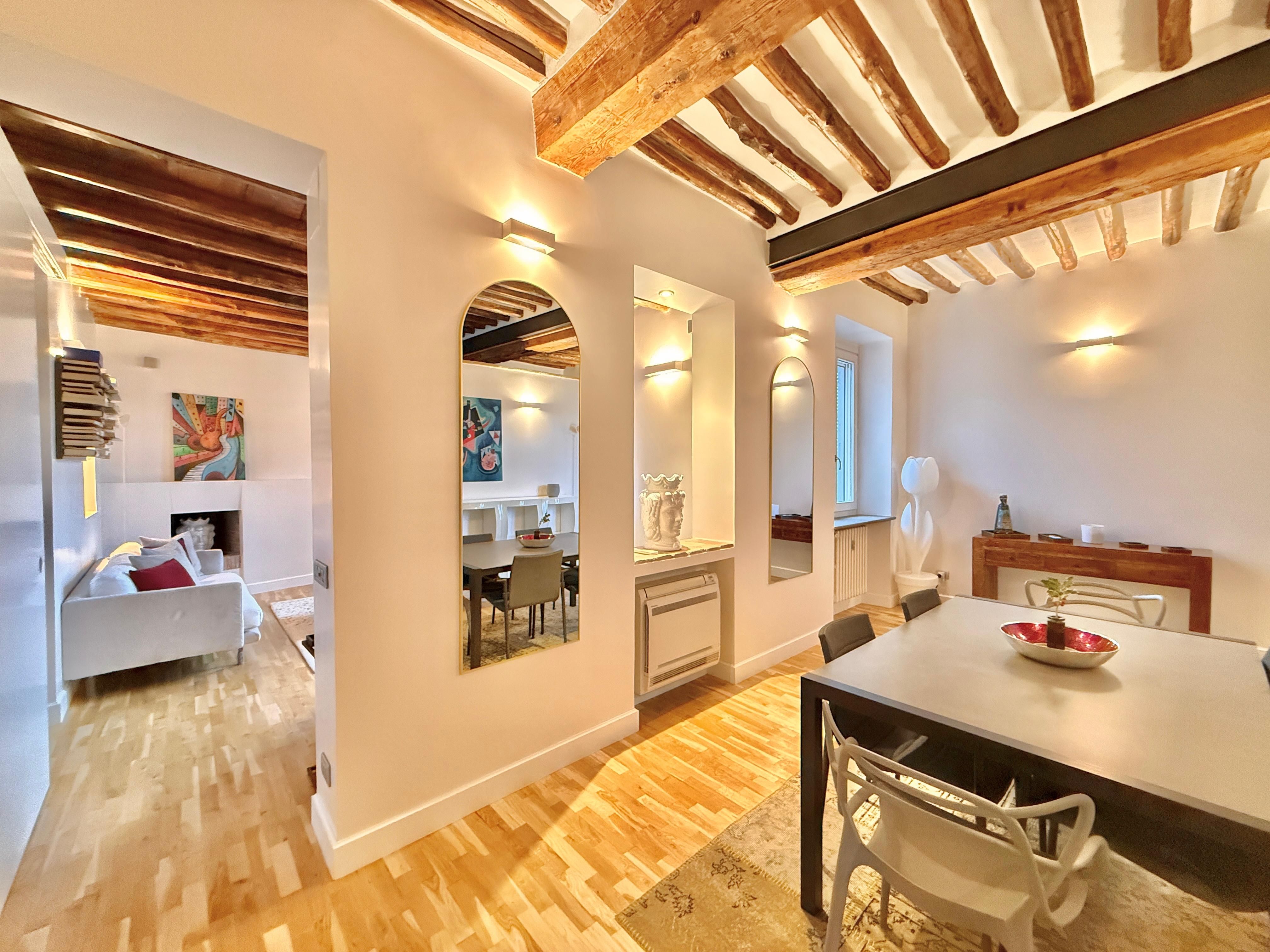 For a centrally located apartment in Rome, look no further. This elegant apartment is on the fourth floor of a historic building right in the heart of the city, a two-minute walk from Piazza Navona. The Pantheon, Campo dei Fiori, and Vatican are all within ten minutes of this delightful home. Look forward to 1800s parquet flooring and high, beamed ceilings, along with a cosy living space with views of Rome. Bright and comfortable, this apartment is suitable for long stays.