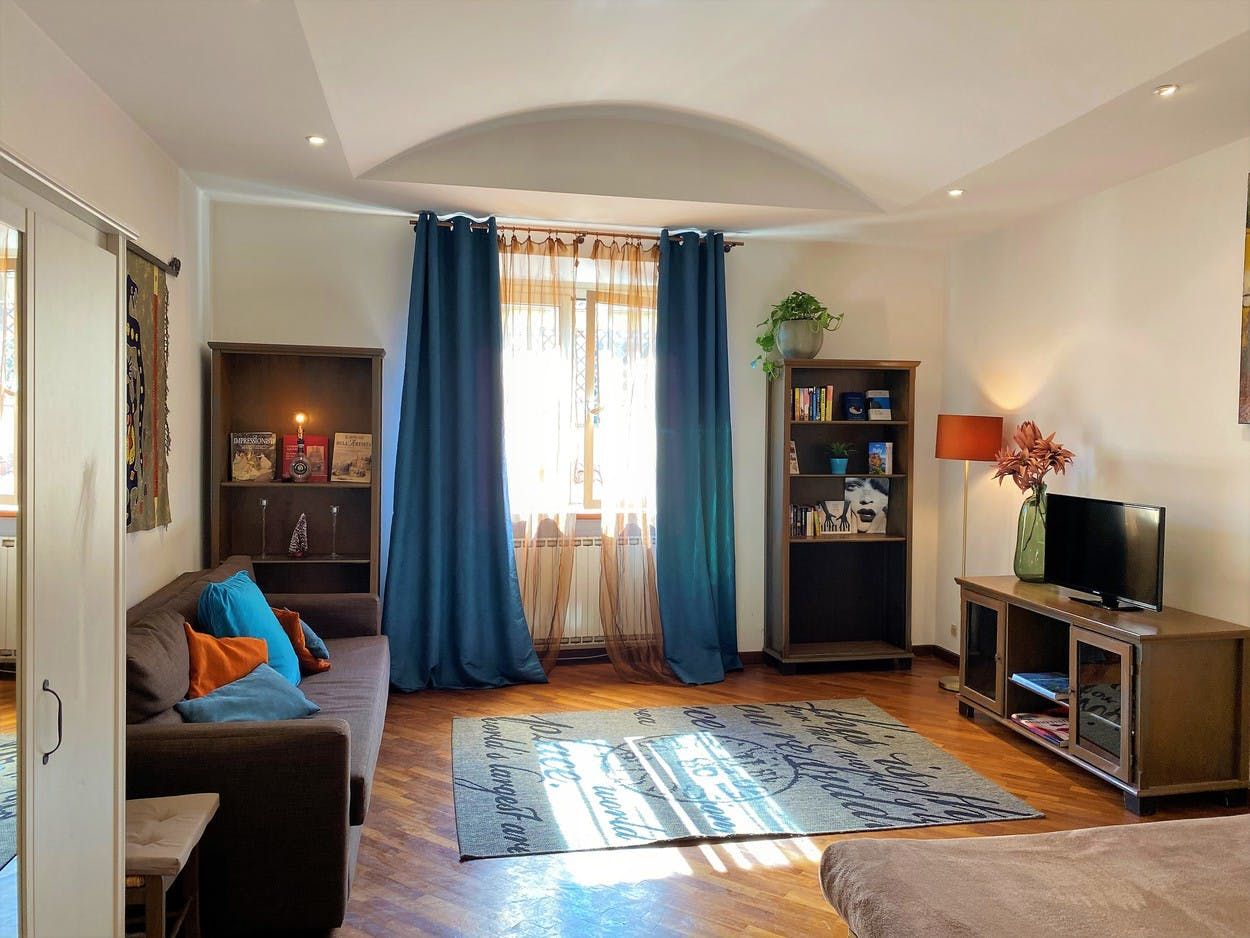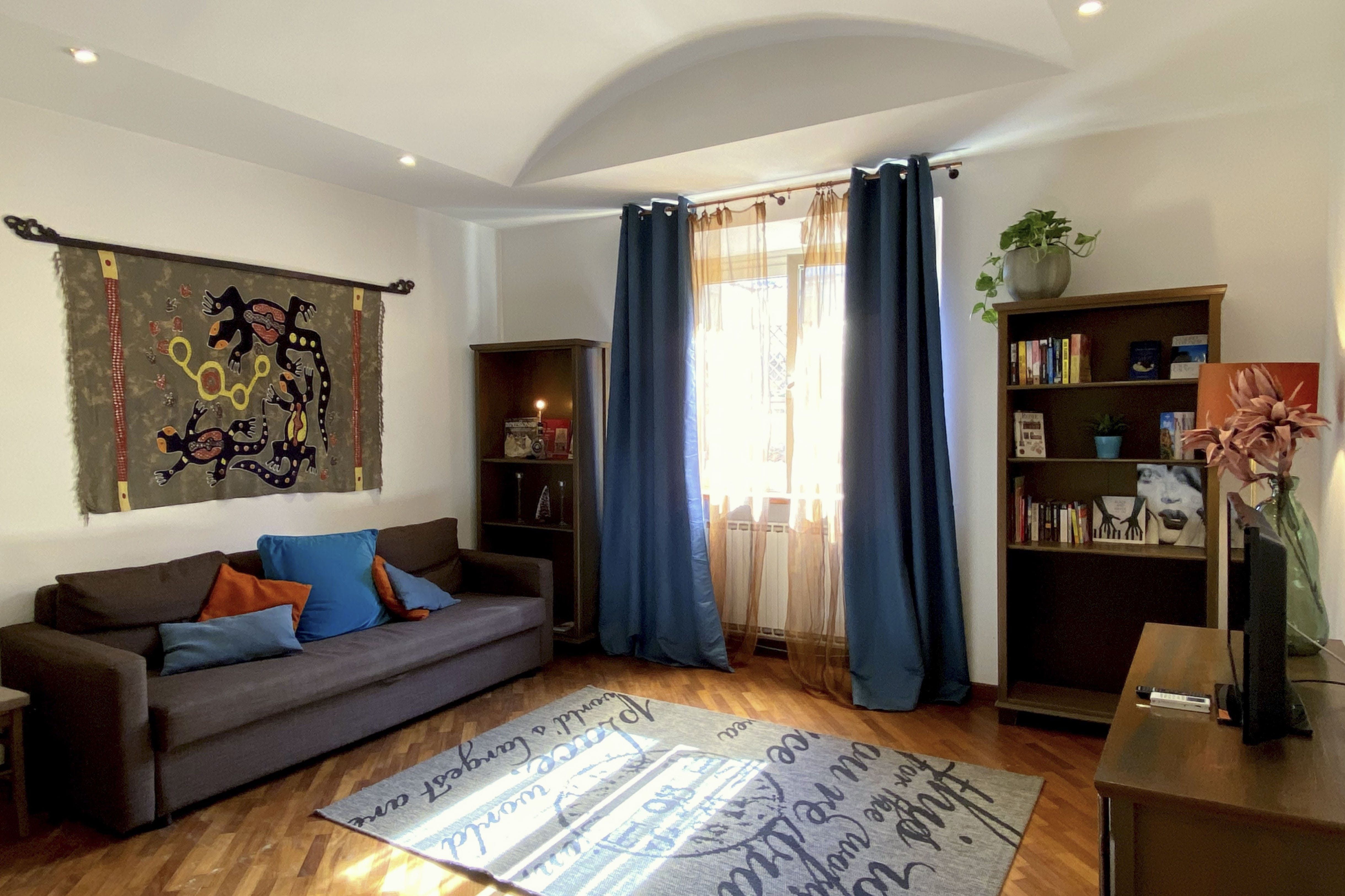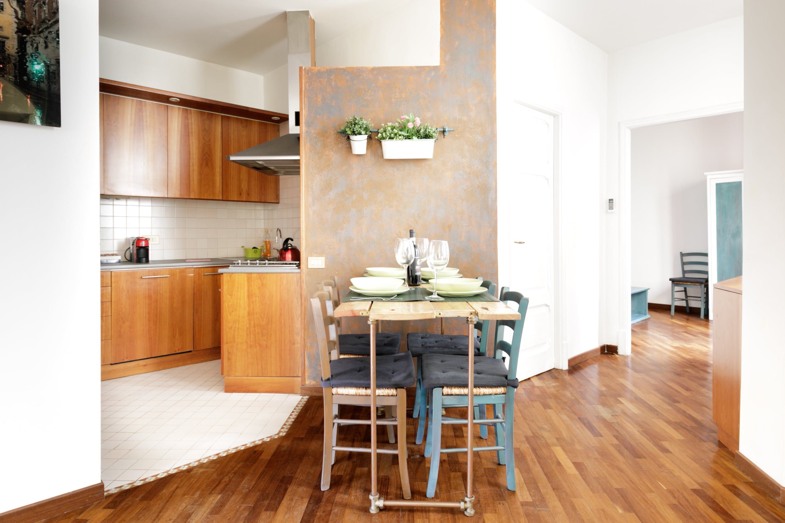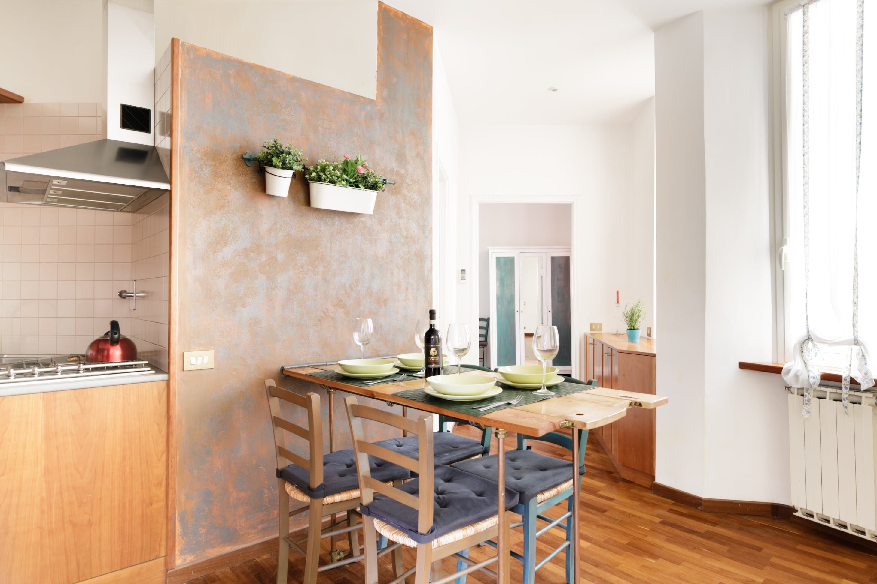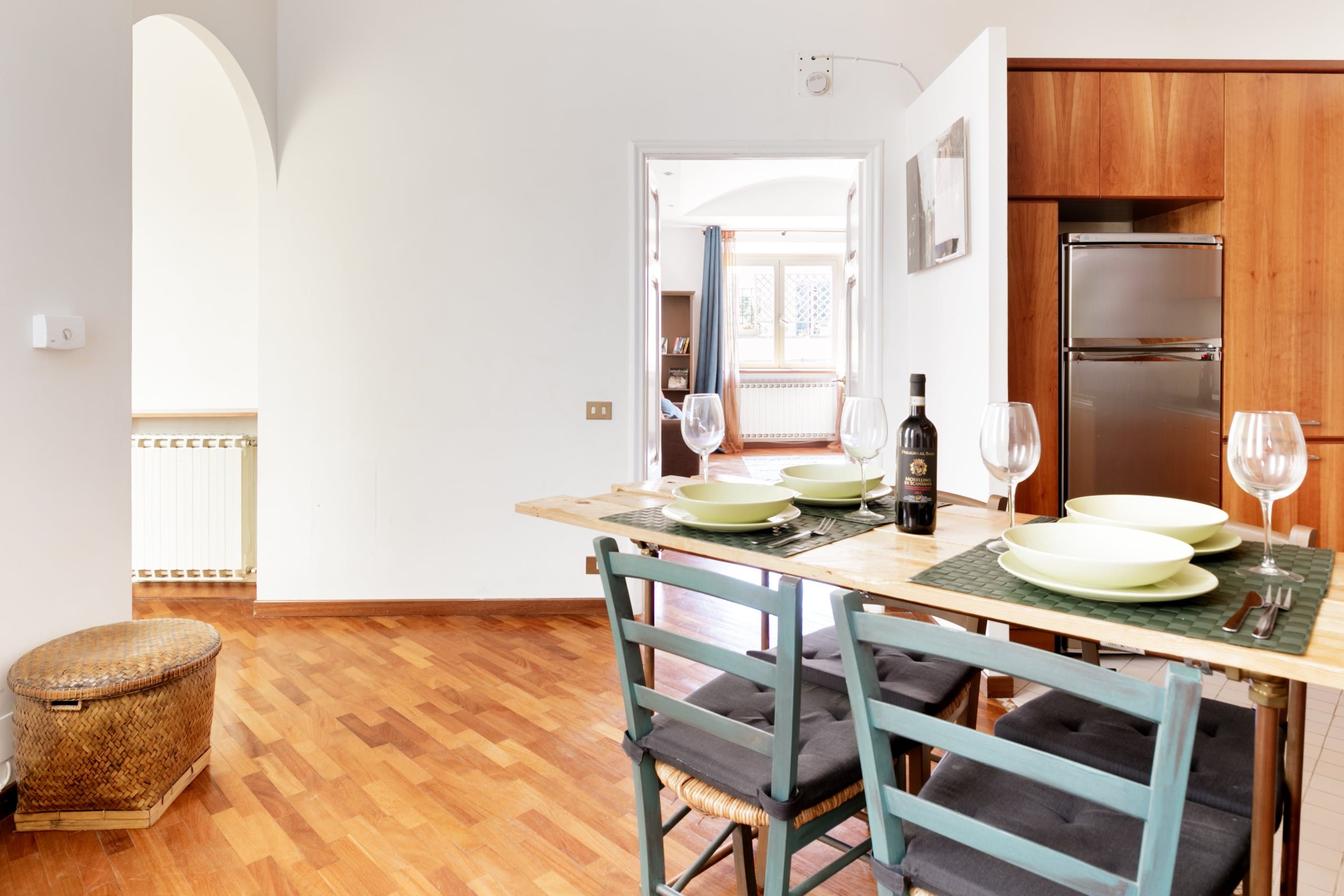 Resting between the kitchen and the living room, you'll discover a cute dining table capable of hosting four people. It's a cosy spot to share slices of freshly made pizza, complemented by glasses of Frascati wine.