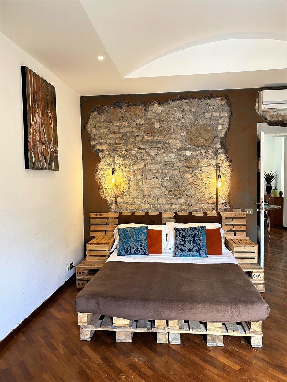 Cute and compact, this chic apartment is infused with a warm, rustic vibe. Find unique artwork on the walls and patches of brick interior dotted around white walls. Subtle splashes of colour – such as the bright cushions and plant life – bring tinges of character to the home.