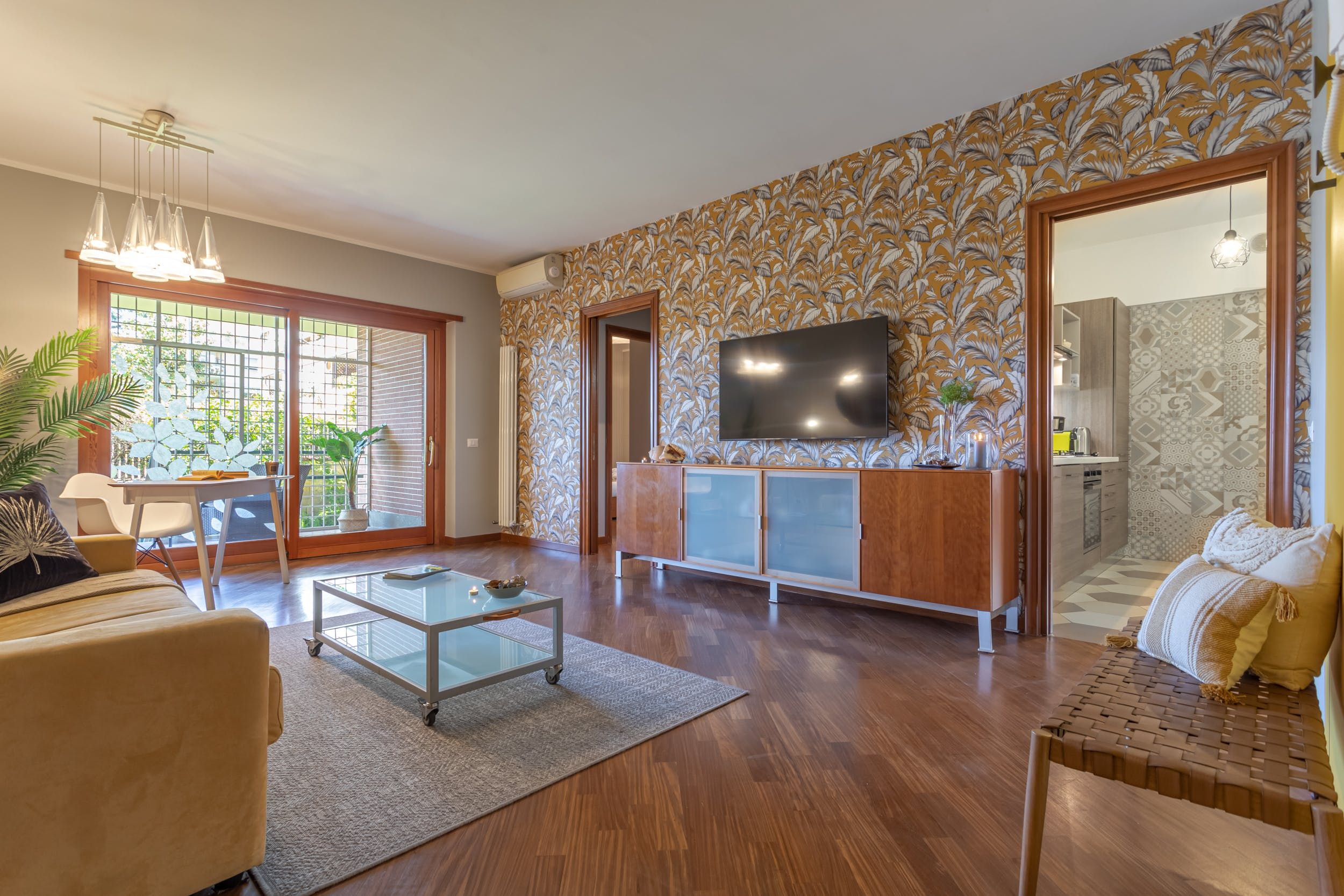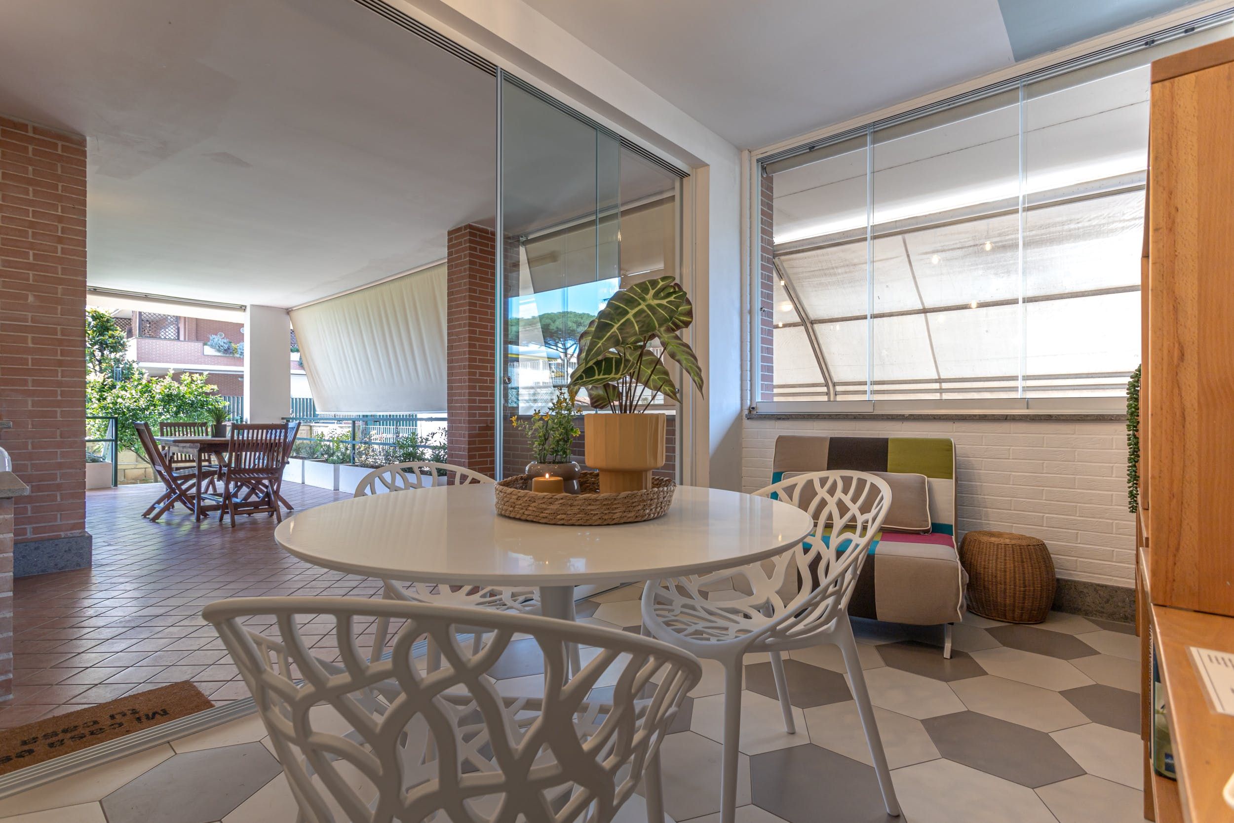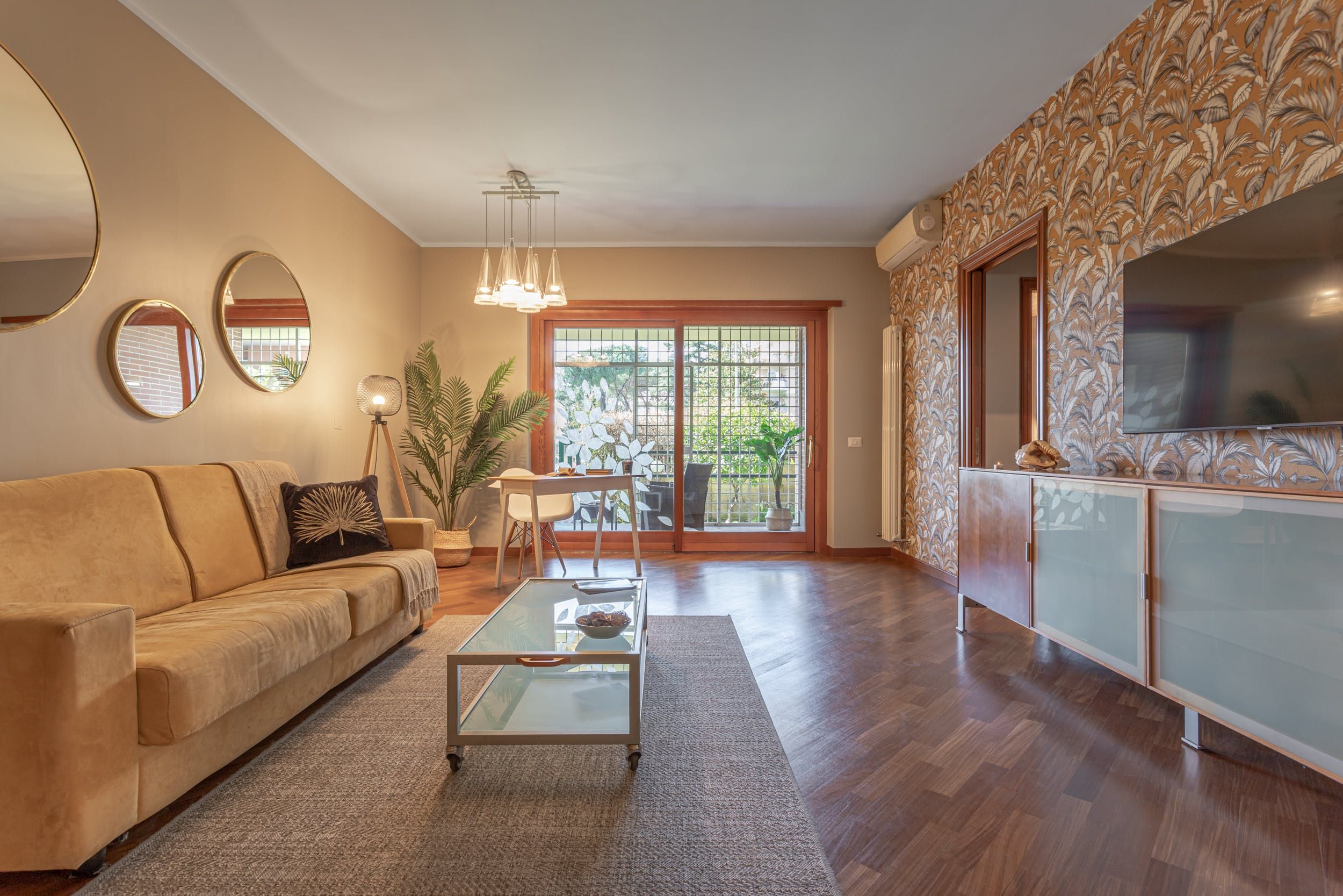 Located in a quieter area of the city and providing plenty of outside space to unwind, this apartment guarantees a restful stay in Rome. Taking in the sunshine couldn't be easier here, with multiple balconies and a large garden to enjoy. Sit down for an alfresco lunch on the covered dining terrace when you're not out sampling the local eateries nearby. Surrounded by shops and casual restaurants, while being just minutes away from St. Peter's Square via public transport, this apartment is well-placed and stress-free.