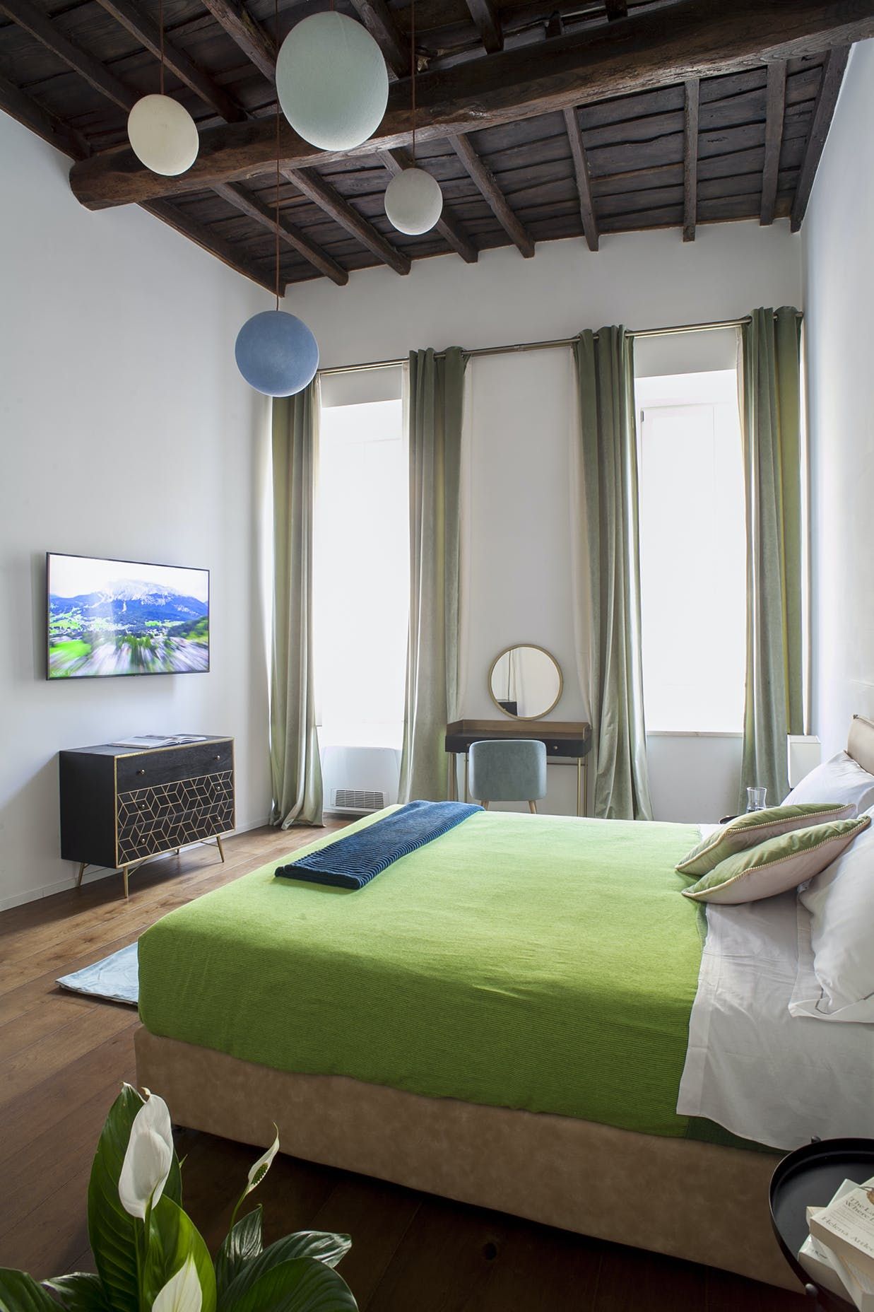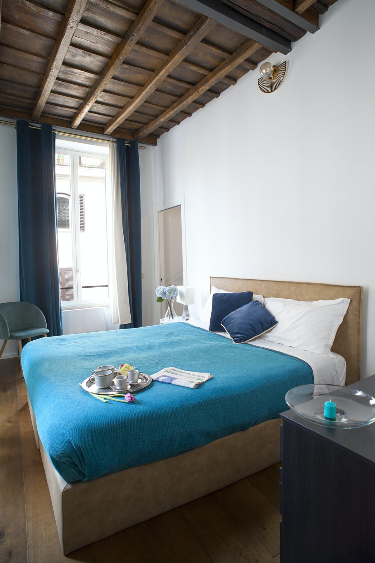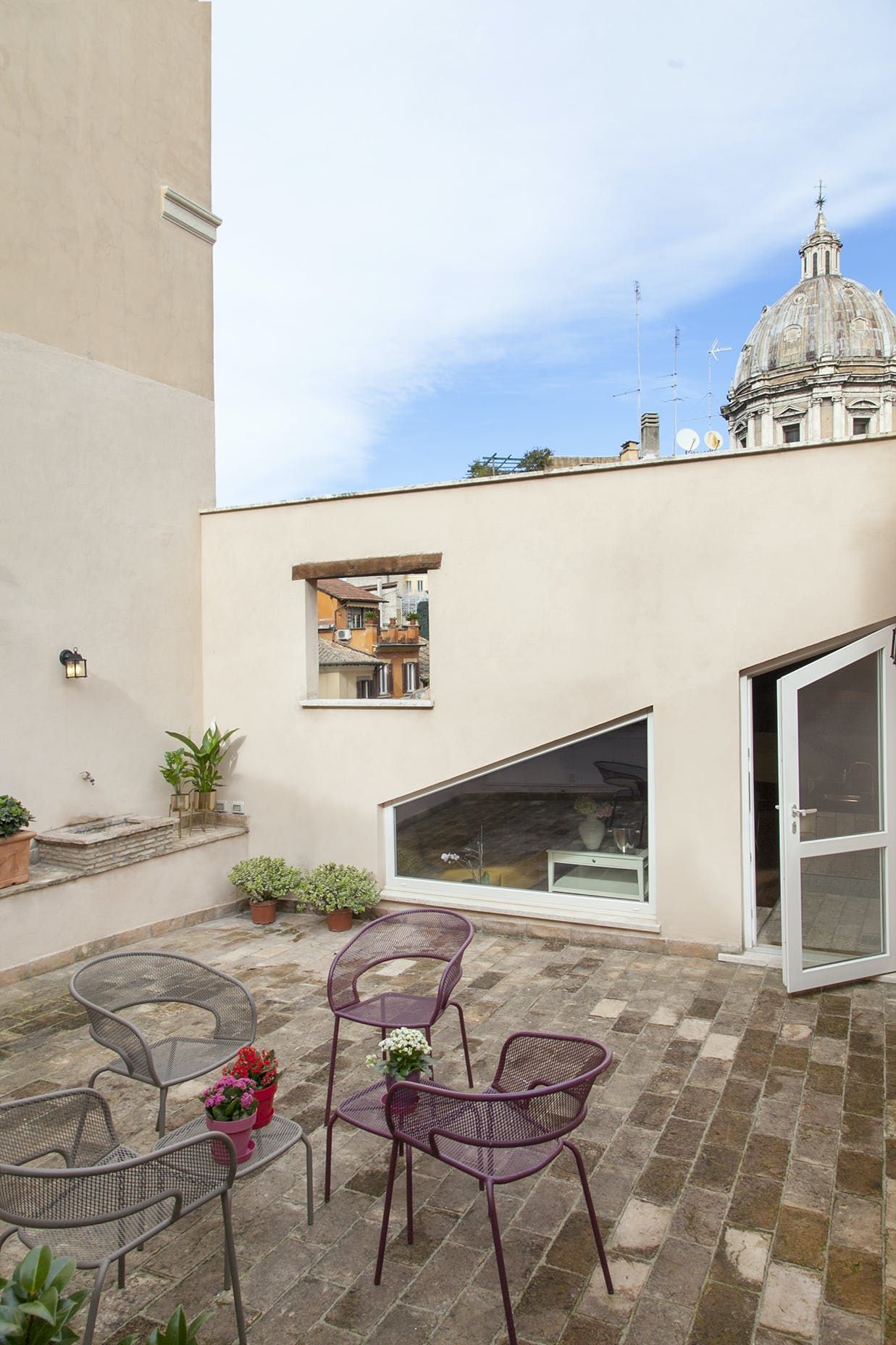 This unique home is ideal for large groups. It’s a whole building divided into four separate apartments, so up to eighteen guests can stay together while also having their own space – though four guests will be sleeping on sofa beds. The steep stone stairs aren’t suitable for those with reduced mobility – or heavy suitcases – but those stairs mean that the views from the outside spaces are pretty special. Best of all, you’re just a short stroll from the Pantheon and Piazza Navona, with all the sights of the city within easy reach.