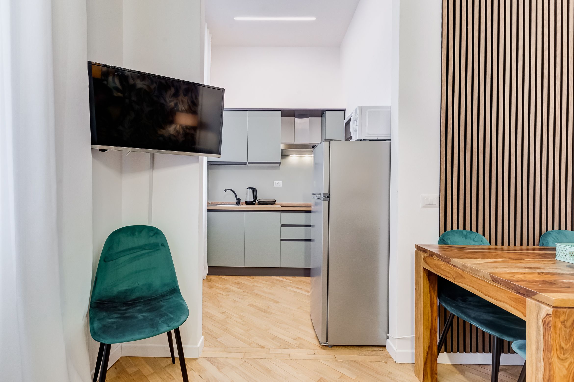*There’s no real living area here. The main lounge has a dining table and a compact kitchen only – there isn’t a sofa.