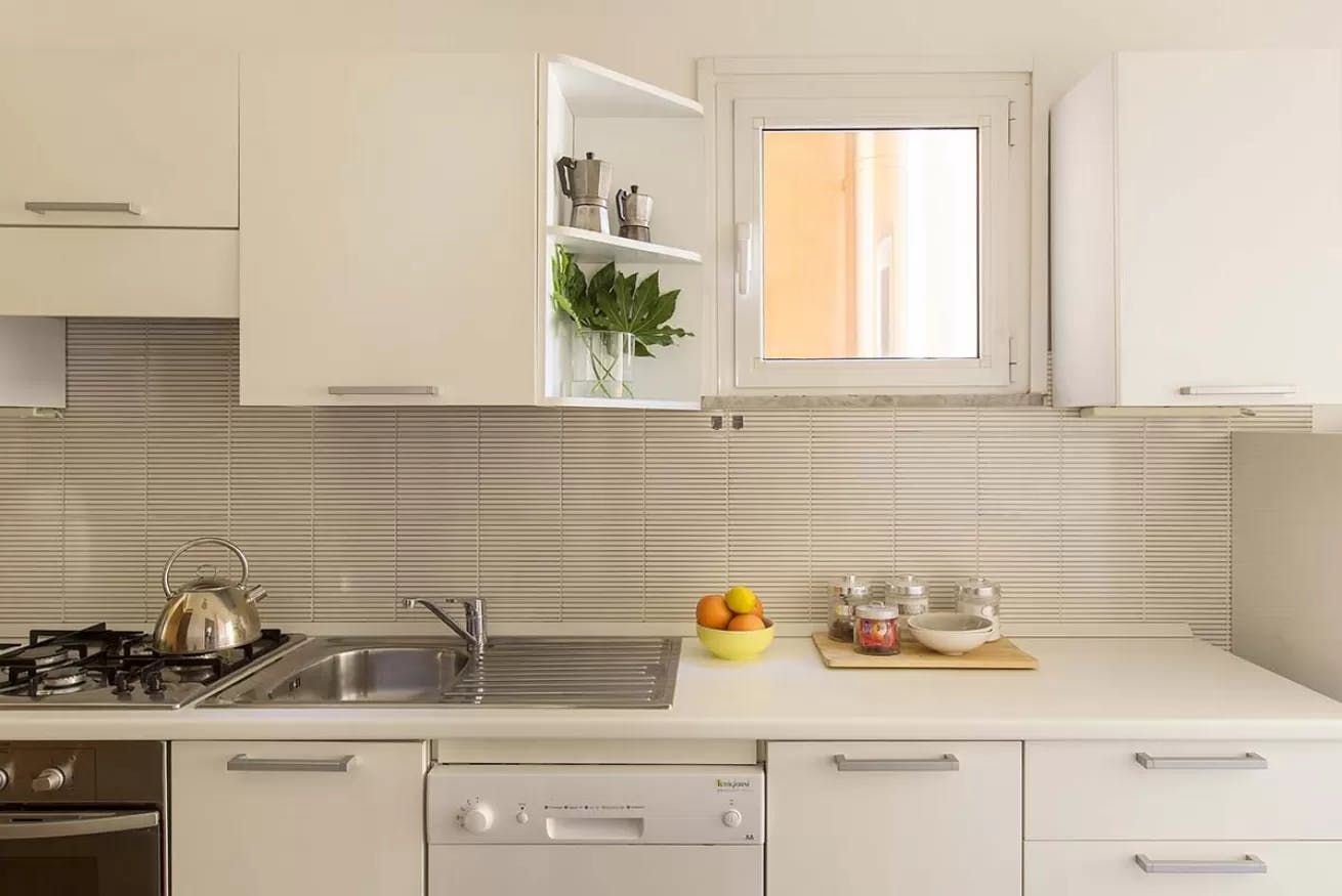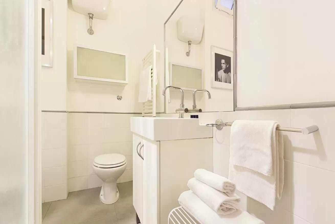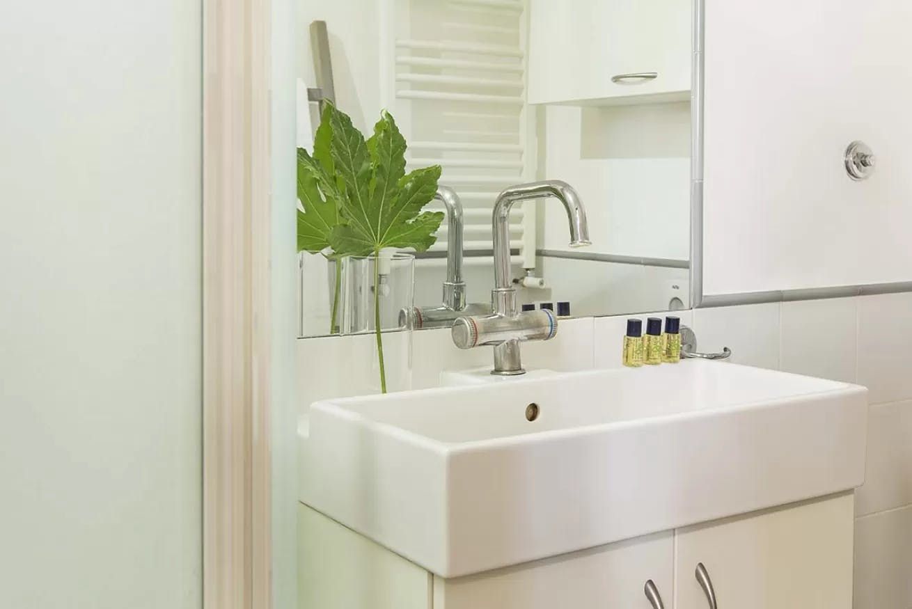 Apart from its super central location, this apartment has lots going for it. Natural light fills the living room from traditional old windows. From here, you can watch the world go by on your classically Roman street. Herringbone floors and high ceilings keep things feeling grand, and the palette of greys and teals makes for a soothing spot to return to after a day in the city. We love the enclosed balcony, where a dining area is surrounded on all sides by glass – the perfect sunny breakfast spot. There’s also a tiny terrace that catches rays of sunshine in the middle of the day, painted sunshine-yellow and set up with a bistro table.