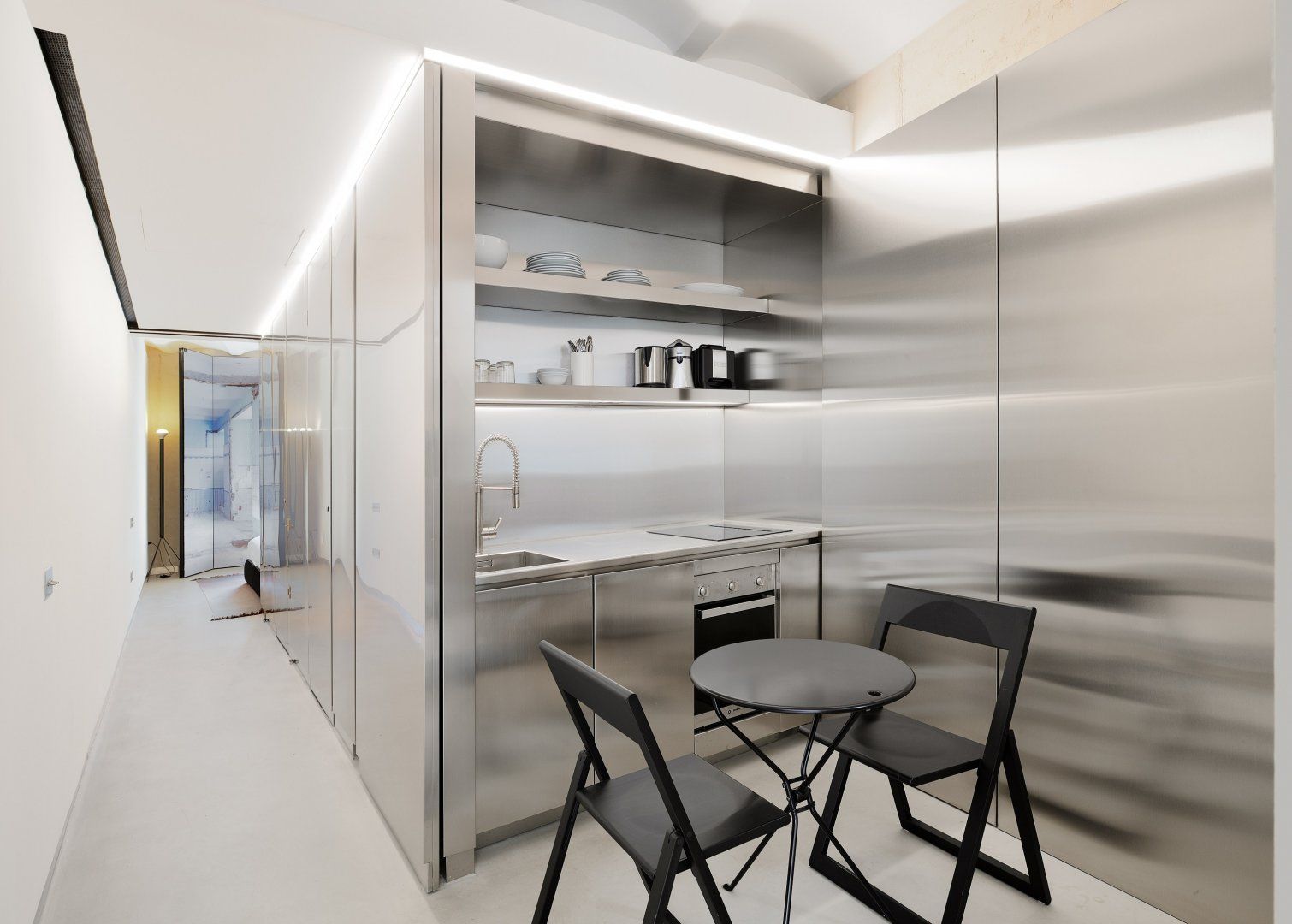 The home sits within a 20th-century building that has been renovated by the French architect Jean Nouvel. The end result is a multifunctional space that includes this apartment, which blends industrial and minimalist trends to striking effect. You only have to look at the stainless steel kitchen and bathroom, as well as the monochrome sleeping quarters, to see what we mean.