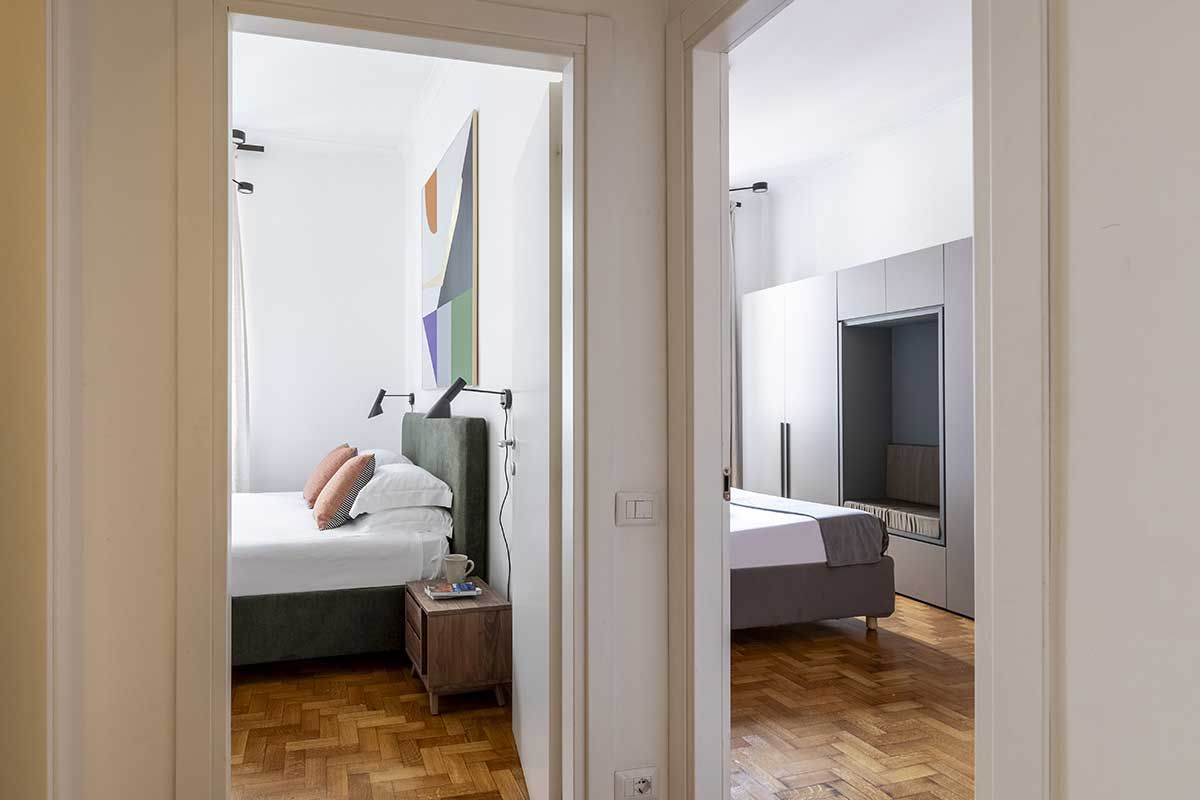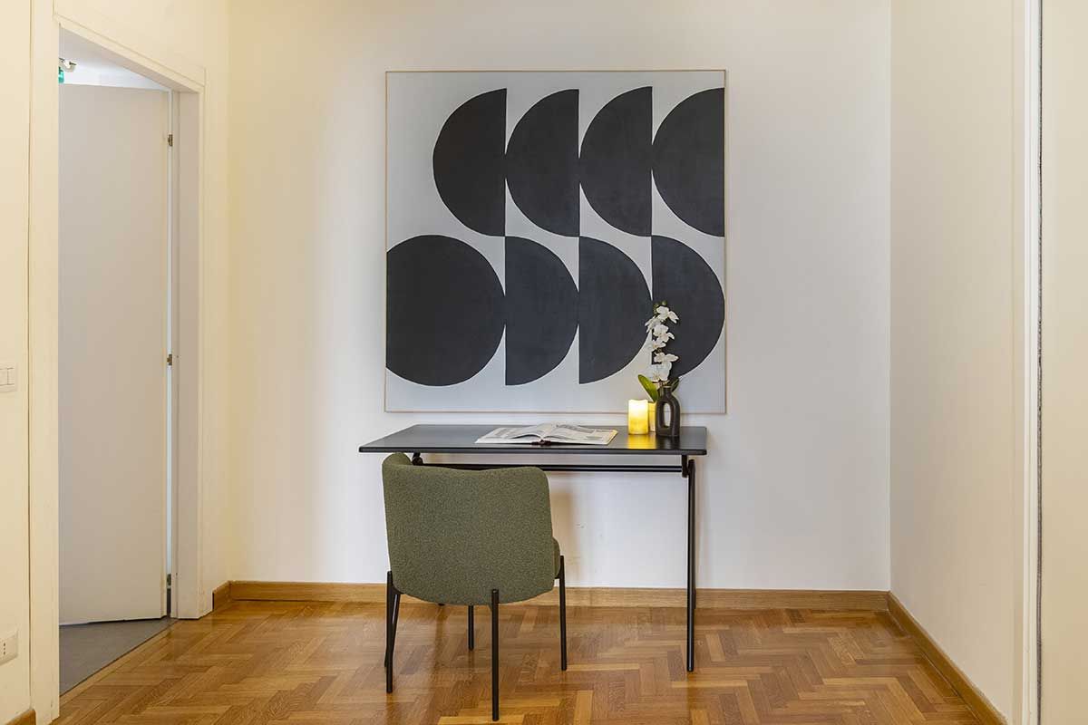 Dressed in vibrant pops of red against a calming white palette, fashion meets cool simplicity in the home’s design. We love the parquet floors here that lend a note of classic charm, while the modern art hanging on the walls adds a dash of characterful flair to the proceedings. The scarlet accented kitchen is all set to host sociable breakfasts over fresh coffee and locally bought pastries, while the glass dining table is the perfect spot to gather for a celebratory Italian feast when you’re not out sampling the local trattorias.