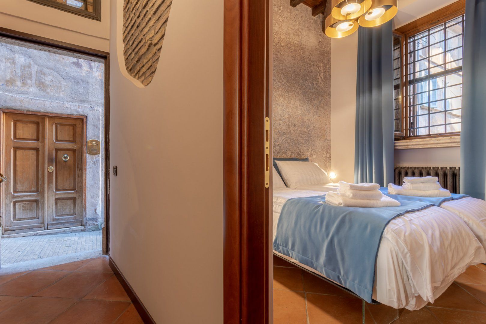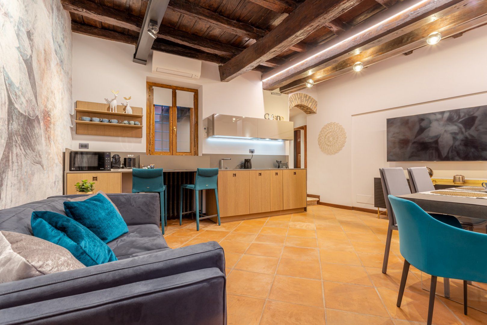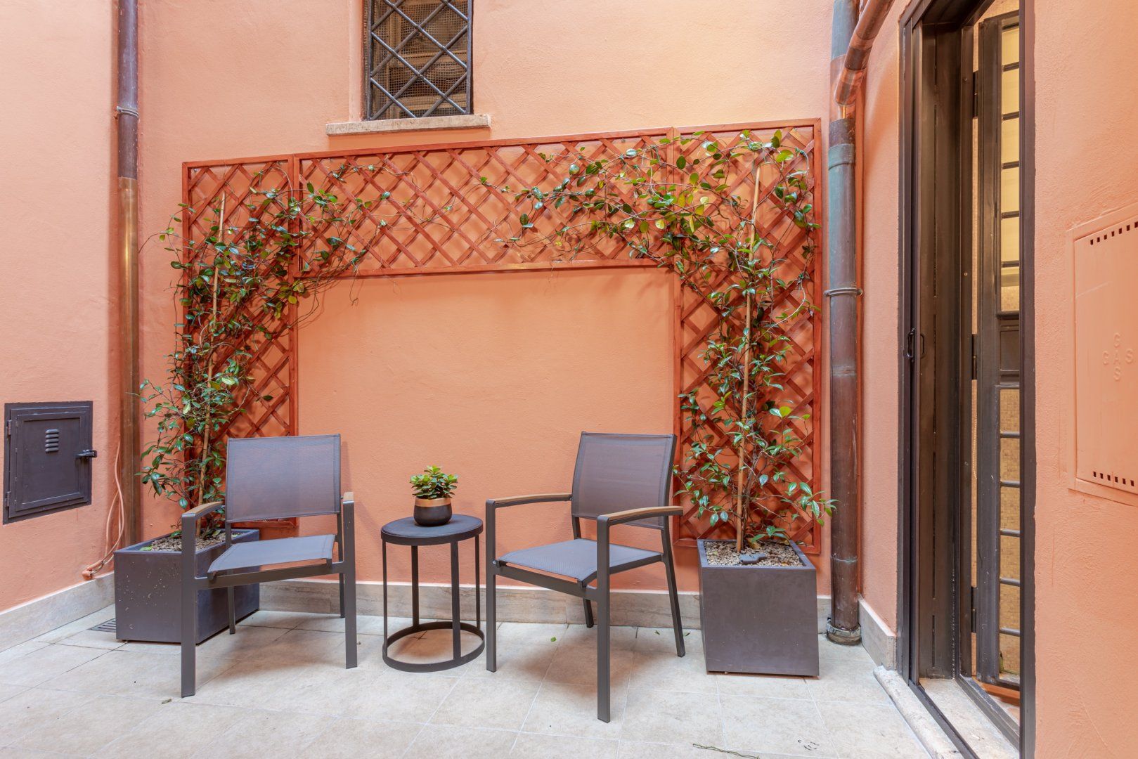Located on a picturesque cobbled street just off of Via dei Coronari – one of Rome’s most historic streets – this quiet apartment is full of character and history. From its beamed ceilings to the original carved stone cubby window in the master bedroom, the building’s past blends beautifully with modern comforts to create a comfortable, stylish stay. We love the main room’s frescoed lilies and the stone arches above the doorways. Our favourite feature, however, is the private terrace where a table and chairs invite alfresco breakfasts over espressos and sunset spritzes before a night out in one of the countless trattorias in your Navona neighbourhood. Speaking of your surroundings, you couldn’t be better placed to visit some of Rome’s most famous sights, including the Piazza Navona (a four-minute walk), the Pantheon (a ten-minute walk) and the Trevi Fountain (a fifteen-minute stroll from your door). The Vatican too is within easy reach, just a twenty-minute walk away across the nearby Tiber River.
