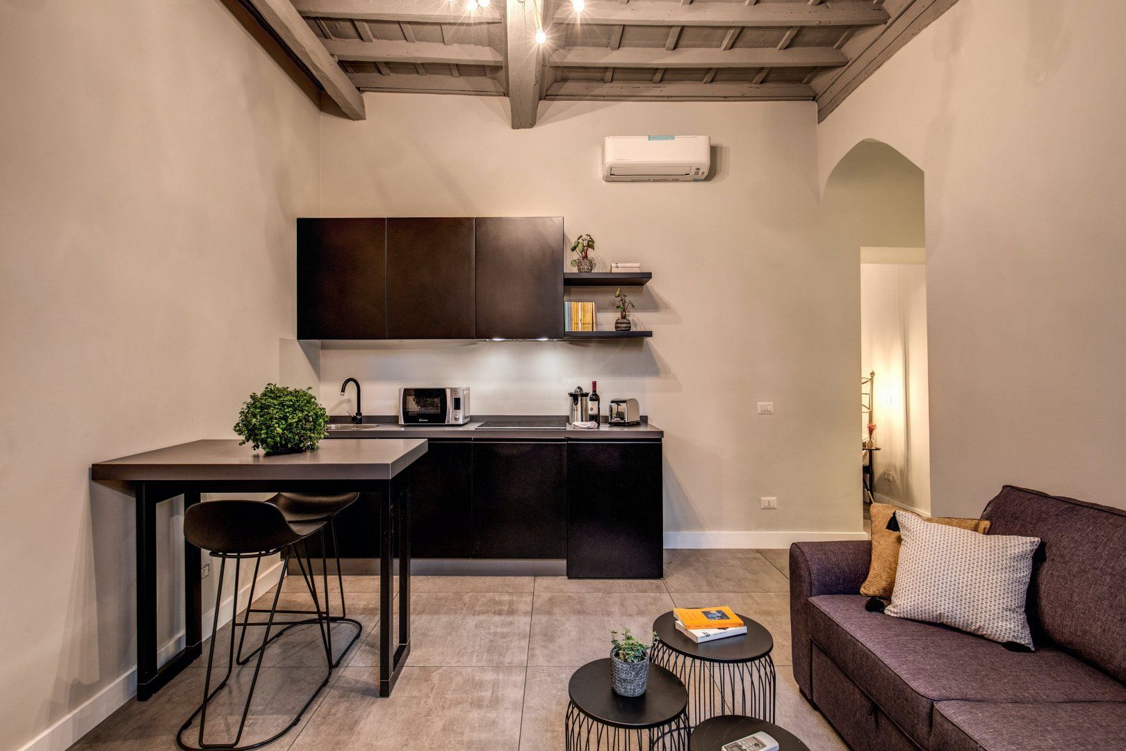 Tucked into the old town, this intimate home offers a shaded sanctuary away from the Italian capital. Sitting on the ground floor in an enviable location, you have all the wonders of the city on your doorstep. Begin each day with a refreshing soak under the rainfall shower, then take a book from the kitchen shelf and put your feet up on the sofa.