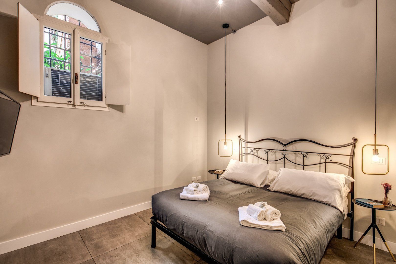 This space is ideal for couples seeking a romantic getaway in the heart of Rome. With beamed ceilings and window shutters, the stylish apartment marries traditional features and modern living. After a glass of Italian wine, you can wind down by watching TV in bed. This sleek interior design is the minimalistic vision of a local architect.