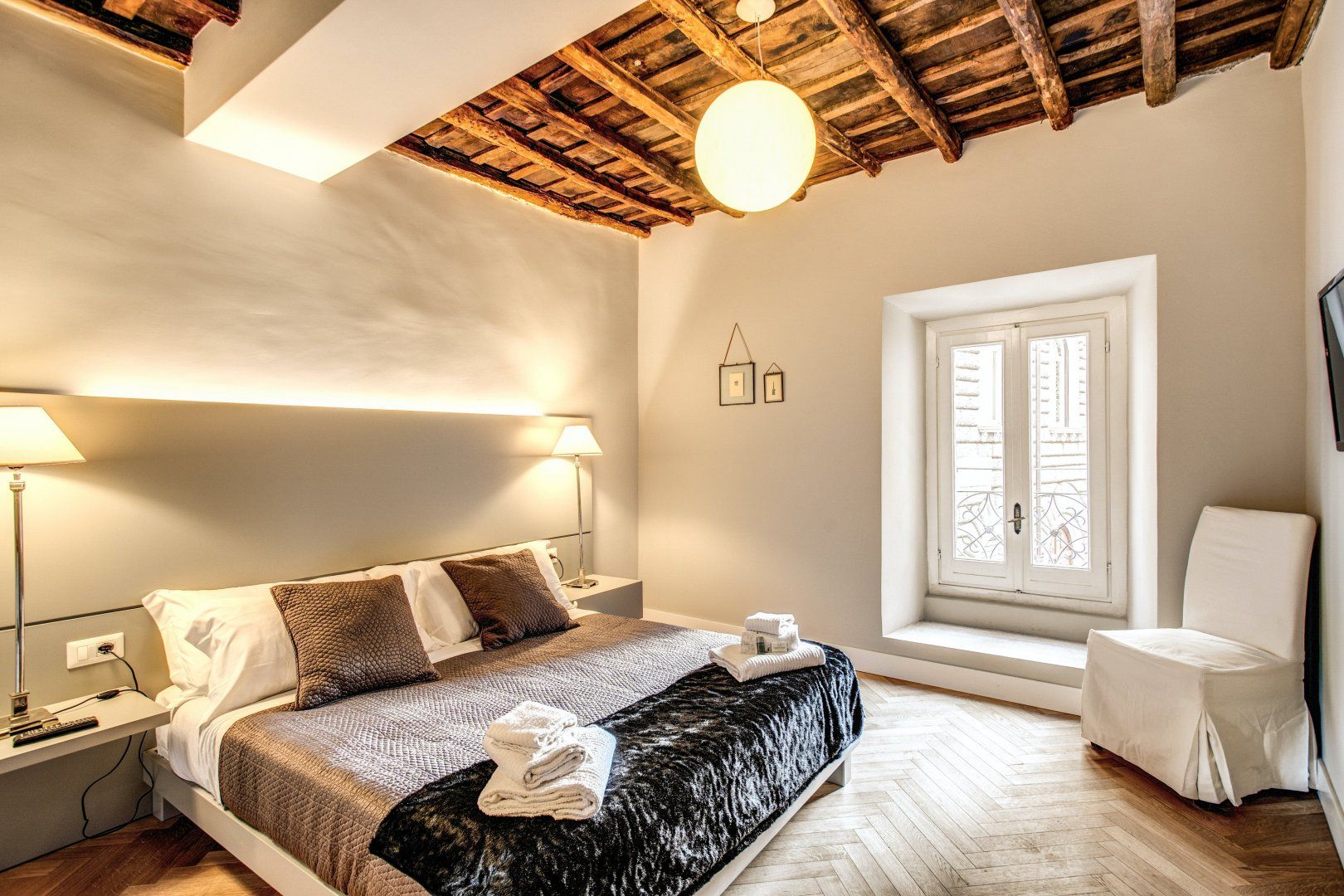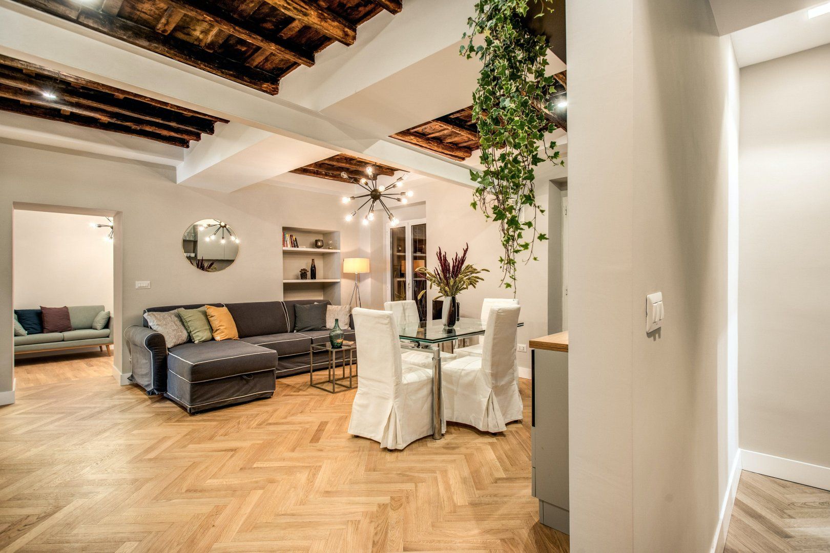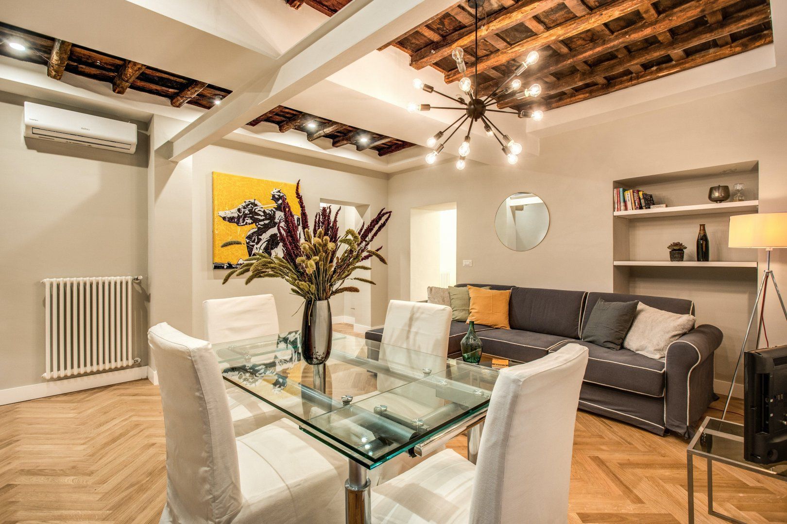 Back at this apartment, designed by a Roman architect and housed in a historical building, there's a wonderful blend of old and new – think character beams, parquet wood floors and modern chandeliers. Pour a Campari and soda and have a rest on the comfy chaise sofa after all that sightseeing in the Eternal City. Then, rustle up a carbonara in the kitchen and enjoy it at your dining table. This home is perfect for a family, friends or business professionals looking for a fabulous central address.