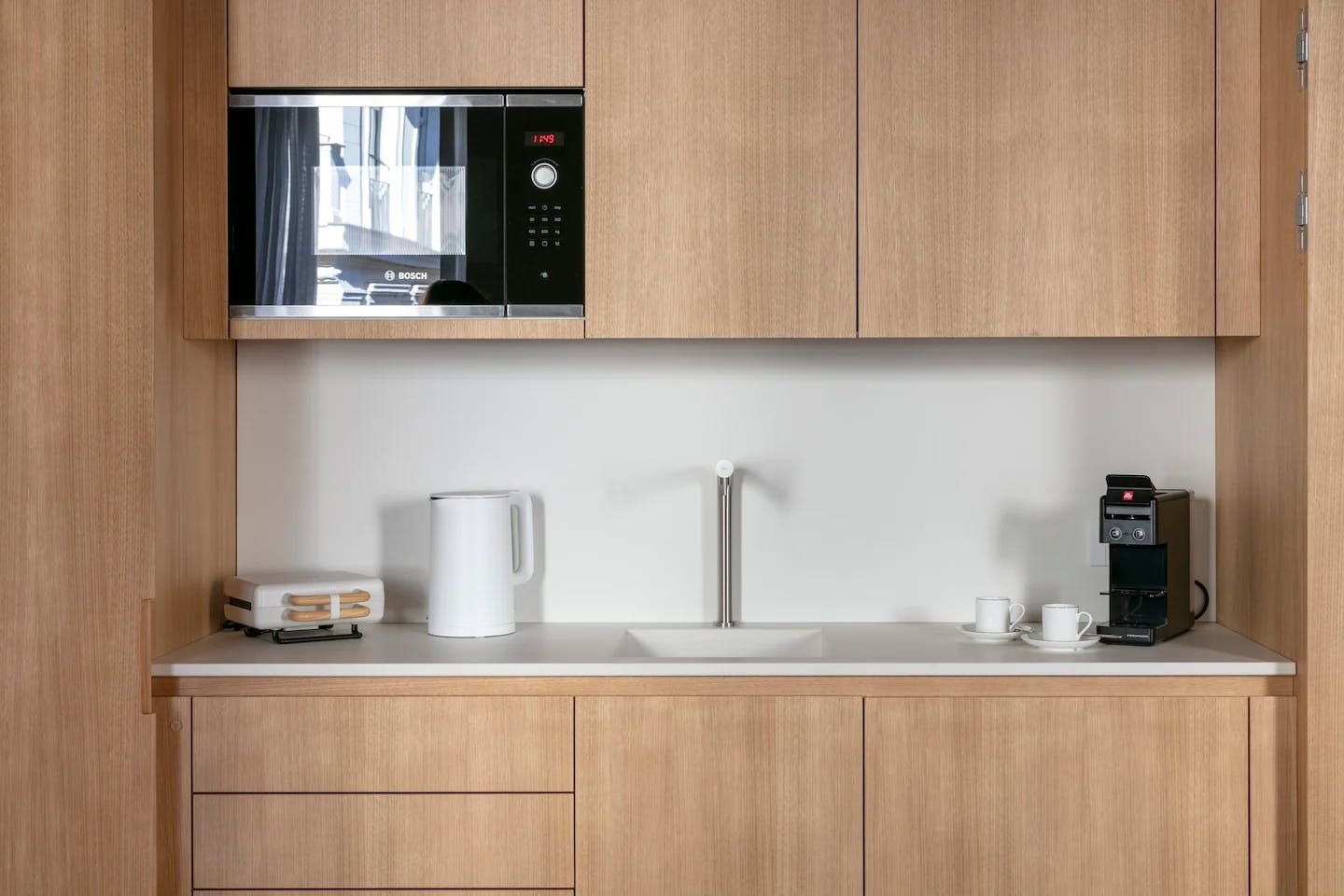 Beneath the exposed whitewashed beams, you'll find a contemporary crashpad with an emphasis on a clean finish. Not only is there plenty of storage lining the wall, but the doors open up to unveil a compact kitchenette that's ideal for preparing light bites in the morning.